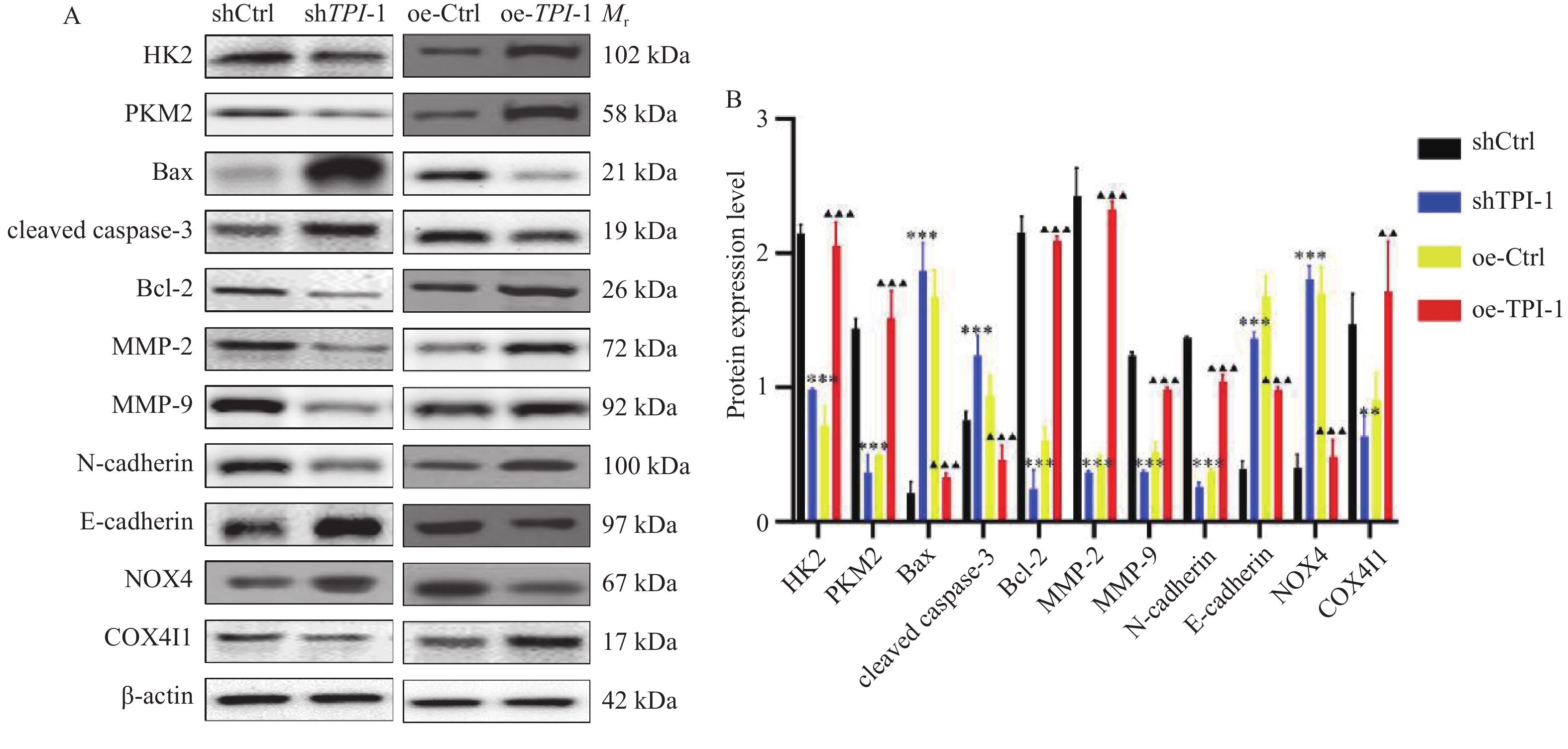 A:HK2、PKM2、Bax、cleaved caspase-3、Bcl-2、MMP-2、MMP-9、N-cadherin、E-cadherin、NOX4和COX4I1蛋白与对照细胞相比,在shTPI-1细胞与oe-TPI-1细胞中的表达情况;B:蛋白表达含量的量化柱状图,与shCtrl组比较,**P < 0.01;***P < 0.001;与oe-Ctrl组比较,▲▲P < 0.01;▲▲▲P < 0.001。HK2:己糖激酶2;PKM2:丙酮酸激酶同工酶; MMP-2:金属蛋白酶-2;MMP-9:金属蛋白酶-9;E-cadherin:E型钙粘蛋白;N-cadherin:N型钙粘蛋白;Bcl-2:B淋巴细胞瘤-2;Bax:促凋亡蛋白;cleaved caspase-3:剪切的半胱天冬蛋白酶-3;NOX4: NADPH氧化酶4;COX4I1:细胞色素c氧化酶亚基。