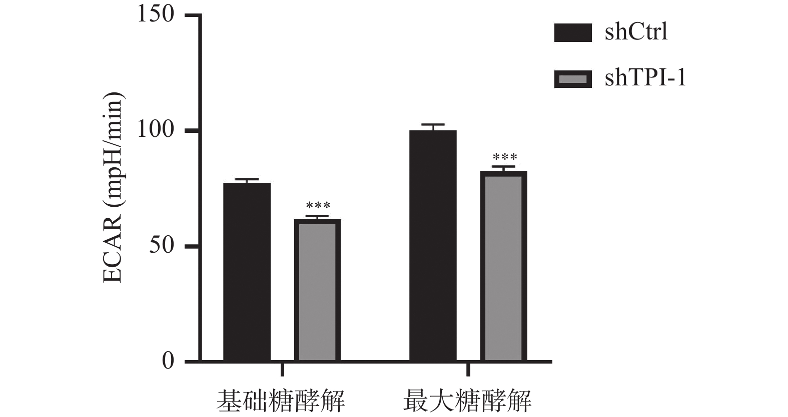 组别 shCtrl shTPI-1 t P 基础糖酵解ECAR(mpH/min) 77.70 ± 1.53 61.70 ± 1.53 12.83 < 0.001*** 最大糖酵解ECAR(mpH/min) 100.30 ± 2.50 82.70 ± 2.10 9.37 < 0.001*** 与shCtrl比较,***P < 0.001。 -