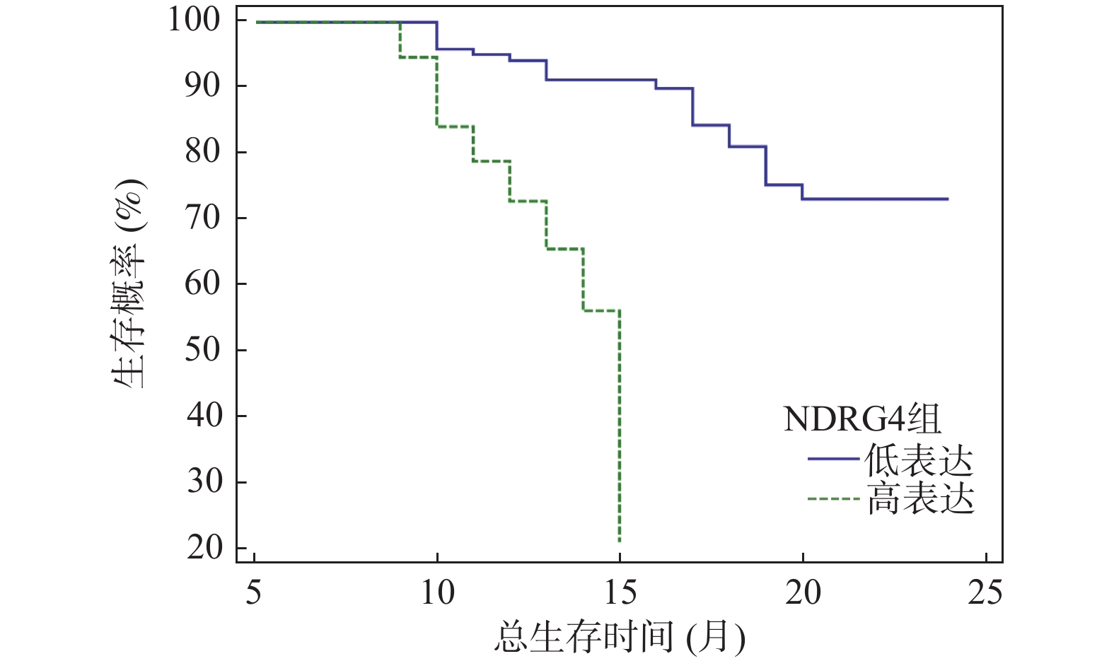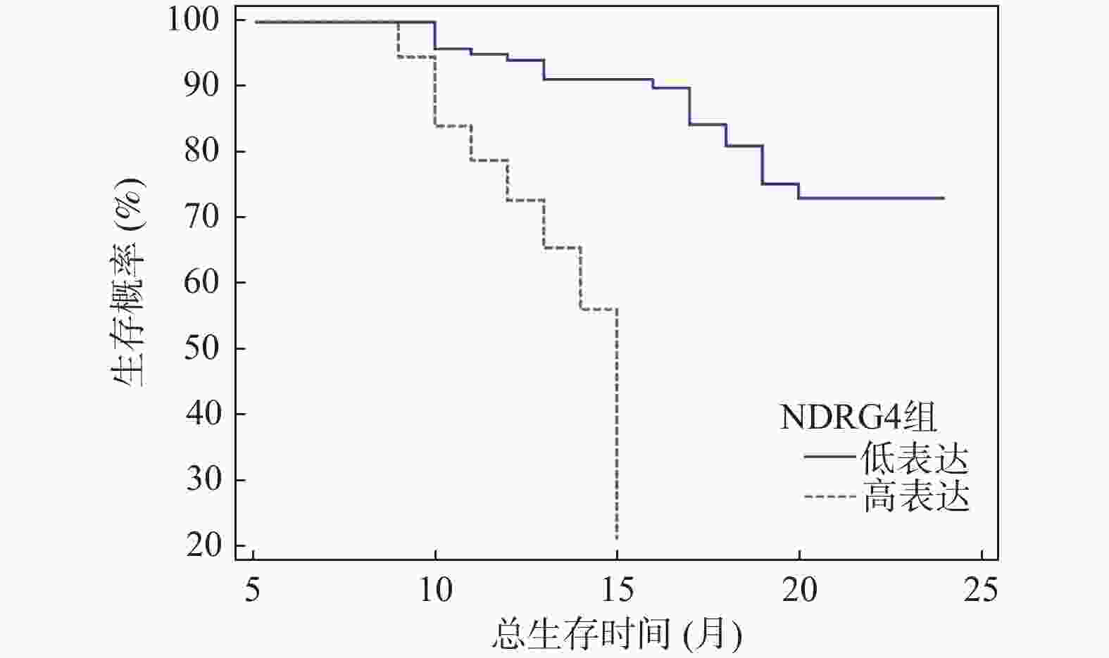 指标 高表达组(n = 93) 低表达组(n =94) t P CD3+T 细胞占比(%) 65.23 ± 7.89 66.12 ± 8.23 0.755 0.451 CD4+T 细胞占比(%) 32.56 ± 4.56 33.21 ± 4.87 0.942 0.347 CD8+T 细胞占比(%) 25.67 ± 3.45 28.98 ± 3.78 6.252 <0.001** B 淋巴细胞占比(%) 12.34 ± 2.34 12.56 ± 2.56 0.613 0.541 NK 细胞占比(%) 15.67 ± 3.21 16.12 ± 3.45 0.923 0.357 **P < 0.001。 表 3 NDRG4 高表达组与低表达组免疫状态指标的比较($\bar x \pm s $)