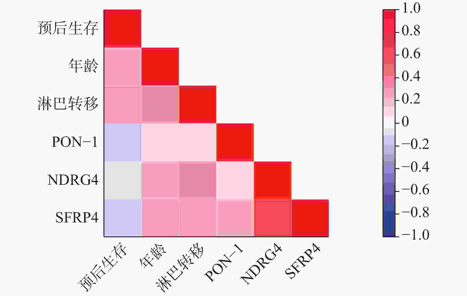 变量 预后生存 年龄 淋巴转移 PON-1 NDRG4 SFRP4 预后生存 1 − − − − − 年龄 0.611** 1 − − − − 淋巴转移 0.635** 0.455** 1 − − − PON-1 ~0.518** 0.194** 0.271* 1 − − NDRG4 0.562** 0.380** 0.277** 0.320* 1 − SFRP4 0.486** 0.306** 0.400** 0.224** 0.183** 1 *P < 0.05;**P < 0.001。 -