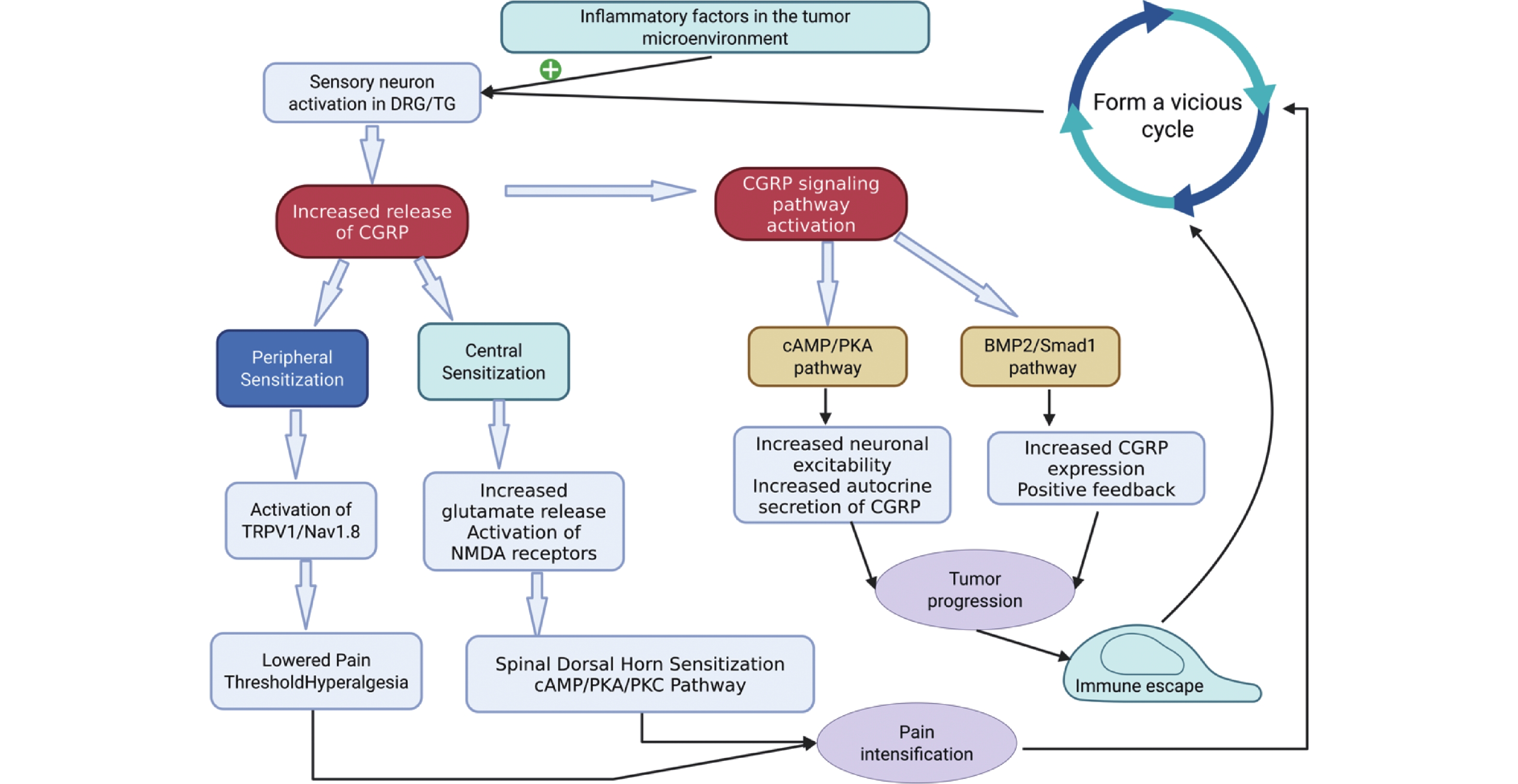注:DRG与TG中的感觉神经元在肿瘤微环境炎症因子刺激下被激活,促进CGRP释放增多,进而触发外周与中枢敏化过程。外周层面,CGRP通过激活TRPV1/Nav1.8等通道降低痛阈、诱发痛觉过敏;中枢层面,CGRP增强谷氨酸释放与NMDA受体活化,进一步放大疼痛信号。同时,CGRP通过cAMP/PKA通路提升神经元兴奋性并形成自分泌正反馈,而BMP2/Smad1通路则与CGRP表达形成正向互馈,协同促进肿瘤进展、免疫逃逸与疼痛加剧,最终构成“疼痛-肿瘤进展”的恶性循环。