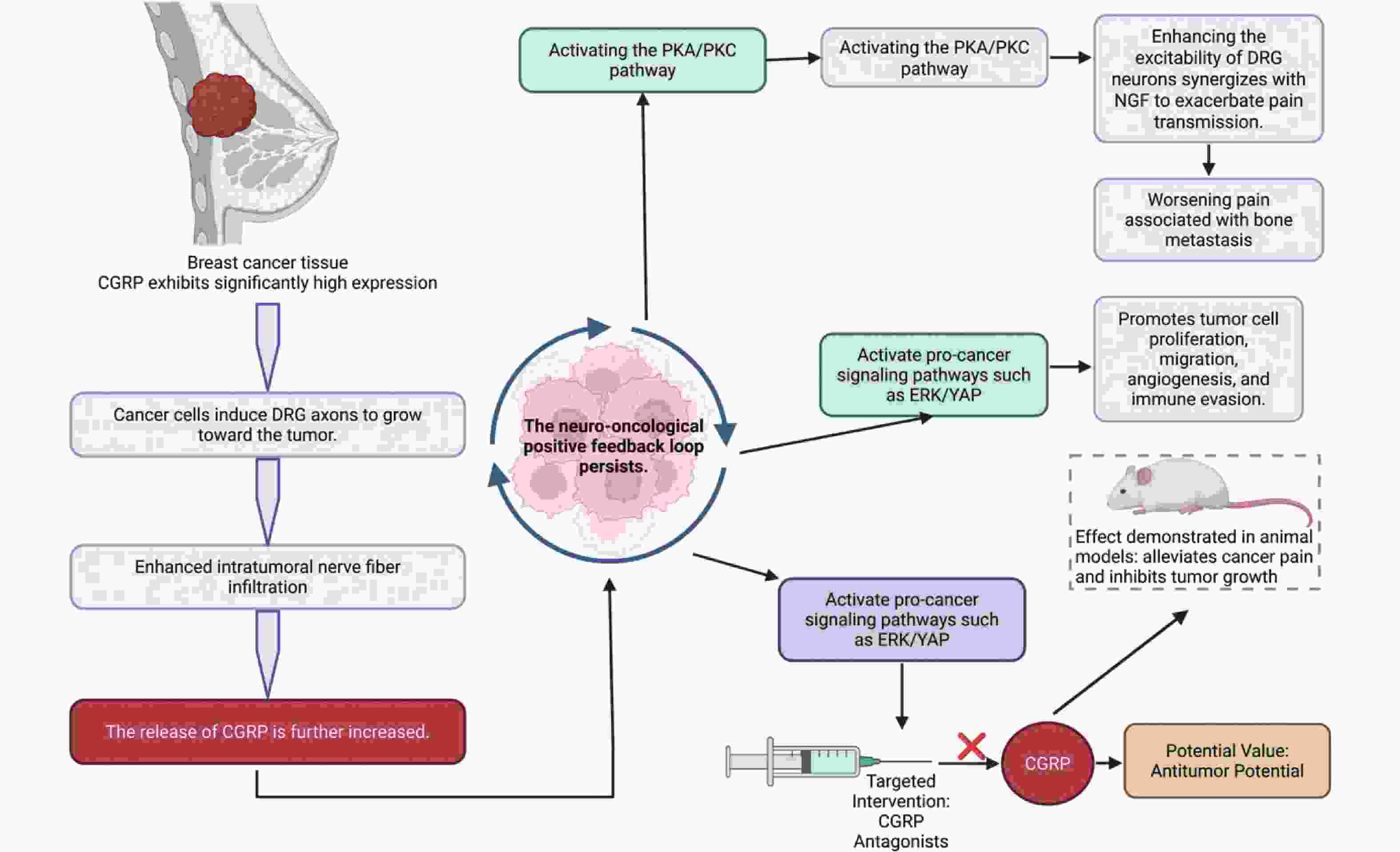 Figure  3.  Core role of CGRP in the neuro-tumor positive feedback loop in breast cancer and a schematic diagram of targeted intervention
