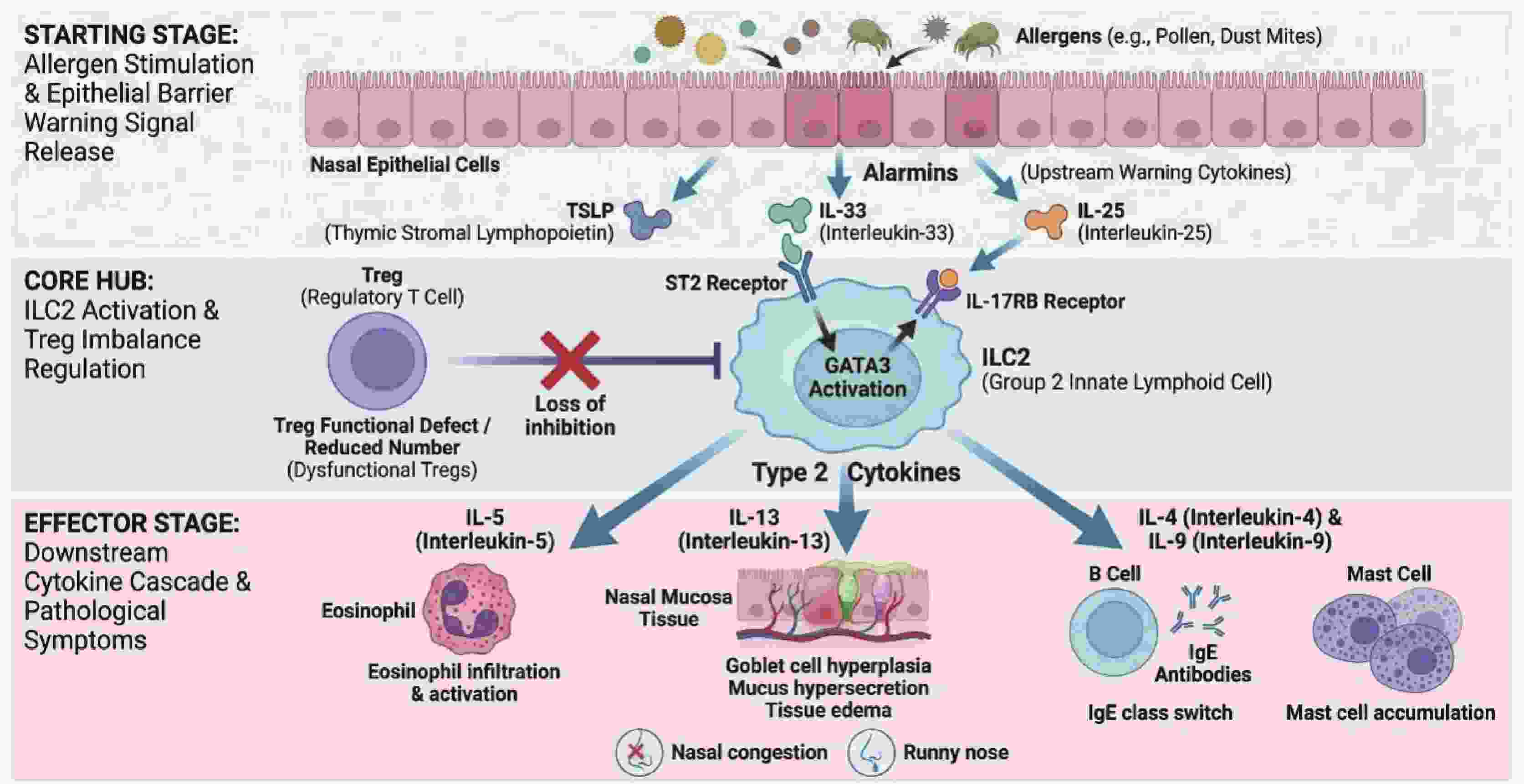 [1] 王洪田, 杨钦泰, 叶菁, 等. 变应性鼻炎防治中环境控制和健康教育的中国专家共识(2024, 北京)[J]. 中国耳鼻咽喉颅底外科杂志, 2024, 30(4): 1-11. doi: 10.11798/j.issn.1007-1520.202404001 [2] Tosca M A, Trincianti C, Naso M, et al. Treatment of allergic rhinitis in clinical practice[J]. Curr Pediatr Rev, 2024, 20(3): 271-277. doi: 10.2174/1573396320666230912103108 [3] Meng Y, Wang C, Zhang L. Recent developments and highlights in allergic rhinitis[J]. Allergy, 2019, 74(12): 2320-2328. doi: 10.1111/all.14067 [4] Talbot S, Foster S L, Woolf C J. Neuroimmunity: Physiology and pathology[J]. Annu Rev Immunol, 2016, 34: 421-477. doi: 10.1146/annurev-immunol-041015-055340 [5] Luo Y, Deng Y, Tao Z, et al. Regulatory effect of microRNA-135a on the Th1/Th2 imbalance in a murine model of allergic rhinitis[J]. Exp Ther Med, 2014, 8(4): 1105-1110. doi: 10.3892/etm.2014.1855 [6] Salimi M, Barlow J L, Saunders S P, et al. A role for IL-25 and IL-33-driven type-2 innate lymphoid cells in atopic dermatitis[J]. J Exp Med, 2013, 210(13): 2939-2950. doi: 10.1084/jem.20130351 [7] Nie M, Zeng Q, Xi L, et al. The effect of IL-35 on the expression of nasal epithelial-derived proinflammatory cytokines[J]. Mediators Inflamm, 2021, 2021(1): 1110671. [8] Li Q, Zhang X, Feng Q, et al. Common allergens and immune responses associated with allergic rhinitis in China[J]. J Asthma Allergy, 2023, 16: 851-861. doi: 10.2147/JAA.S420328 [9] Wang S, Liu X, Lin X, et al. Group 2 innate lymphoid cells in allergic rhinitis[J]. J Inflamm Res, 2024, 17: 8599-8610. [10] Liu Z, Yang X, Liu X, et al. Analysis of expression of ILC2 cells in nasal mucosa based on animal model of allergic bacterial infection rhinitis[J]. J Infect Public Health, 2021, 14(1): 77-83. doi: 10.1016/j.jiph.2019.09.010 [11] Li Y Q, Zhong Y, Xiao X P, et al. IL-33/ST2 axis promotes the inflammatory response of nasal mucosal epithelial cells through inducing the ERK1/2 pathway[J]. Innate Immun, 2020, 26(6): 505-513. doi: 10.1177/1753425920918911 [12] Vivier E, Artis D, Colonna M, et al. Innate lymphoid cells: 10 years on[J]. Cell, 2018, 174(5): 1054-1066. doi: 10.1016/j.cell.2018.07.017 [13] Munir D, Pahlevi Nasution I, Restimulia L, et al. The role of mesenchymal stem cells in allergic rhinitis and its relationship with IL-10, plasma cells and regulatory T cells[J]. Med Glas (Zenica), 2023, 20(2): 175-180. doi: 10.17392/1541-23 [14] 魏先梅, 高下, 俞晨杰. 间充质干细胞对变应性鼻炎治疗作用的研究进展[J]. 中华耳鼻咽喉头颈外科杂志, 2018, 53(10): 789-793. doi: 10.3760/cma.j.issn.1673-0860.2018.10.015 [15] Fan X, Xu Z B, Li C L, et al. Mesenchymal stem cells regulate type 2 innate lymphoid cells via regulatory T cells through ICOS-ICOSL interaction[J]. Stem Cells, 2021, 39(7): 975-987. doi: 10.1002/stem.3369 [16] 胡泽功, 白燕. 过敏原特异性免疫治疗的研究进展[J]. 实用医学杂志, 2025, 41(11): 1760-1766. doi: 10.3969/j.issn.1006-5725.2025.11.022 [17] 江银丽, 朱新华. 免疫治疗在变应性鼻炎免疫调节机制中的作用研究[J]. 临床耳鼻咽喉头颈外科杂志, 2018, 32(18): 1440-1443. doi: 10.13201/j.issn.1001-1781.2018.18.020 [18] Tamaș T P, Ciurariu E. Allergen immunotherapy: Pitfalls, perks and unexpected allies[J]. Int J Mol Sci, 2025, 26(8): 3535. [19] Shamji M H, Sharif H, Layhadi J A, et al. Diverse immune mechanisms of allergen immunotherapy for allergic rhinitis with and without asthma[J]. J Allergy Clin Immunol, 2022, 149(3): 791-801. doi: 10.1016/j.jaci.2022.01.016 [20] Shamji M H, Durham S R. Mechanisms of allergen immunotherapy for inhaled allergens and predictive biomarkers[J]. J Allergy Clin Immunol, 2017, 140(6): 1485-1498. doi: 10.1016/j.jaci.2017.10.010 [21] Kouser L, Kappen J, Walton R P, et al. Update on biomarkers to monitor clinical efficacy response during and post treatment in allergen immunotherapy[J]. Curr Treat Options Allergy, 2017, 4(1): 43-53. doi: 10.1007/s40521-017-0117-5 [22] Mitthamsiri W, Pradubpongsa P, Sangasapaviliya A, et al. Decreased CRTH2 expression and response to allergen re-stimulation on innate lymphoid cells in patients with allergen-specific immunotherapy[J]. Allergy Asthma Immunol Res, 2018, 10(6): 662-674. doi: 10.4168/aair.2018.10.6.662 [23] May J R, Dolen W K. Management of allergic rhinitis: A review for the community pharmacist[J]. Clin Ther, 2017, 39(12): 2410-2419. doi: 10.1016/j.clinthera.2017.10.006 [24] Zhang Y, Lan F, Zhang L. Update on pathomechanisms and treatments in allergic rhinitis[J]. Allergy, 2022, 77(11): 3309-3319. doi: 10.1111/all.15454 [25] Sakaguchi S, Mikami N, Wing J B, et al. Regulatory T cells and human disease[J]. Annu Rev Immunol, 2020, 38: 541-566. doi: 10.1146/annurev-immunol-042718-041717 [26] Georgiev P, Charbonnier L M, Chatila T A. Regulatory T cells: The many faces of foxp3[J]. J Clin Immunol, 2019, 39(7): 623-640. doi: 10.1007/s10875-019-00684-7 [27] Irla M. Instructive cues of thymic T cell selection[J]. Annu Rev Immunol, 2022, 40: 95-119. doi: 10.1146/annurev-immunol-101320-022432 [28] Yadav M, Stephan S, Bluestone J A. Peripherally induced tregs - role in immune homeostasis and autoimmunity[J]. Front Immunol, 2013, 4: 232. doi: 10.3389/fimmu.2013.00232 [29] Martín-Cruz L, Benito-Villalvilla C, Sirvent S, et al. The role of regulatory T cells in allergic diseases: Collegium internationale allergologicum (CIA) update 2024[J]. Int Arch Allergy Immunol, 2024, 185(5): 503-518. doi: 10.1159/000536335 [30] Zheng S G, Wang J, Wang P, et al. IL-2 is essential for TGF-beta to convert naive CD4+CD25- cells to CD25+Foxp3+ regulatory T cells and for expansion of these cells[J]. J Immunol, 2007, 178(4): 2018-2027. doi: 10.4049/jimmunol.178.4.2018 [31] Sayitoglu E C, Freeborn R A, Roncarolo M G. The Yin and Yang of type 1 regulatory T cells: From discovery to clinical application[J]. Front Immunol, 2021, 12: 693105. doi: 10.3389/fimmu.2021.693105 [32] Rigas D, Lewis G, Aron