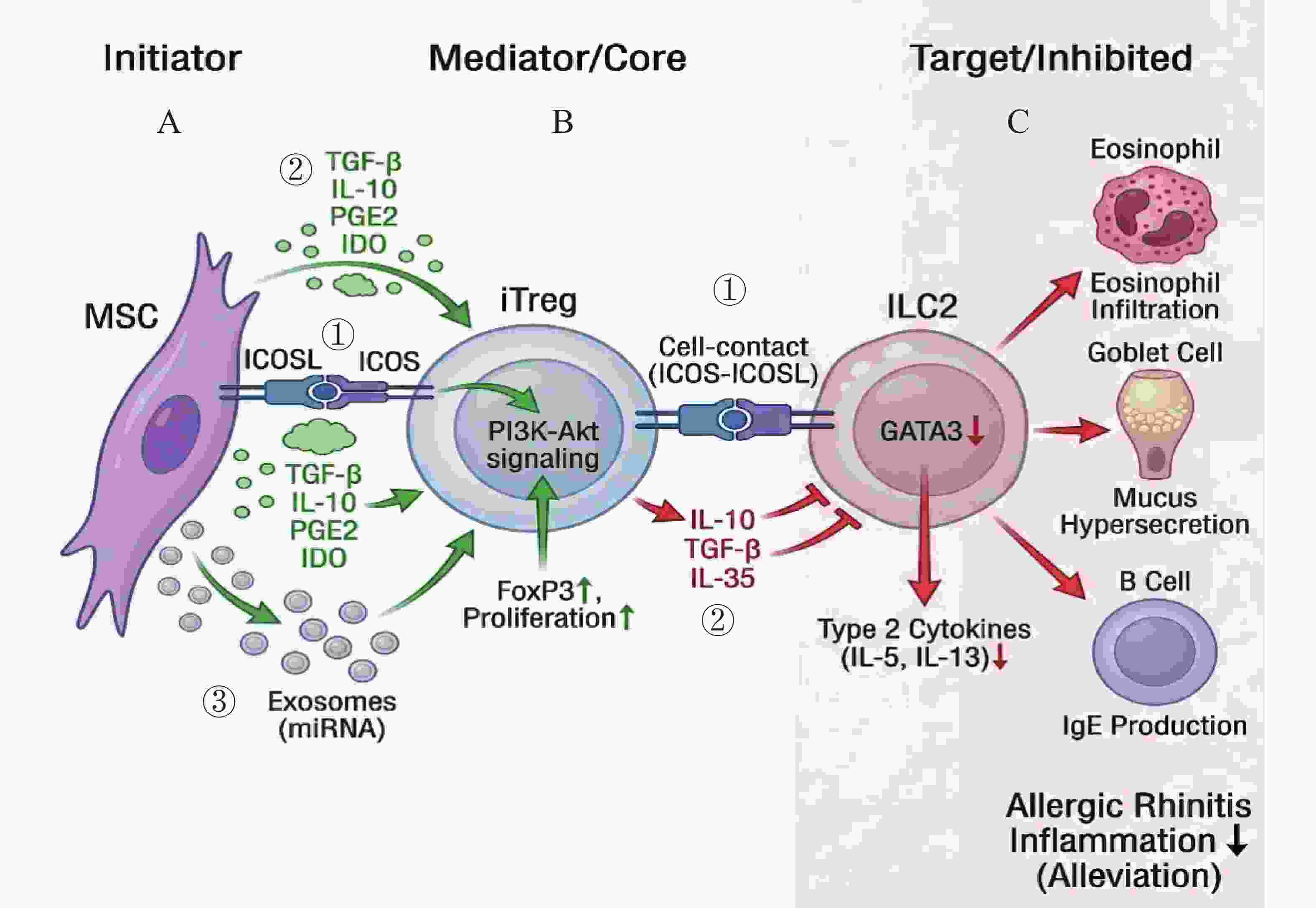 A:MSCs通过三种主要方式促进Treg细胞的扩增与活化:① 细胞接触依赖机制:MSC表面的ICOSL与Treg表面的ICOS结合,激活PI3K-Akt信号通路;② 旁分泌机制:分泌TGF-β、IL-10、PGE2及IDO等可溶性因子;③ 外泌体机制:释放携带功能性miRNA的细胞外囊泡。B:活化后的Treg细胞(iTreg)进而通过两种途径抑制ILC2的功能:① 通过ICOS-ICOSL介导的细胞间接触;② 分泌关键的抑制性细胞因子(IL-10,TGF-β及IL-35)。C:最终导致ILC2细胞内核心转录因子GATA3表达下调,2型细胞因子(IL-5,IL-13)分泌减少,从而减轻变应性鼻炎的气道炎症反应。