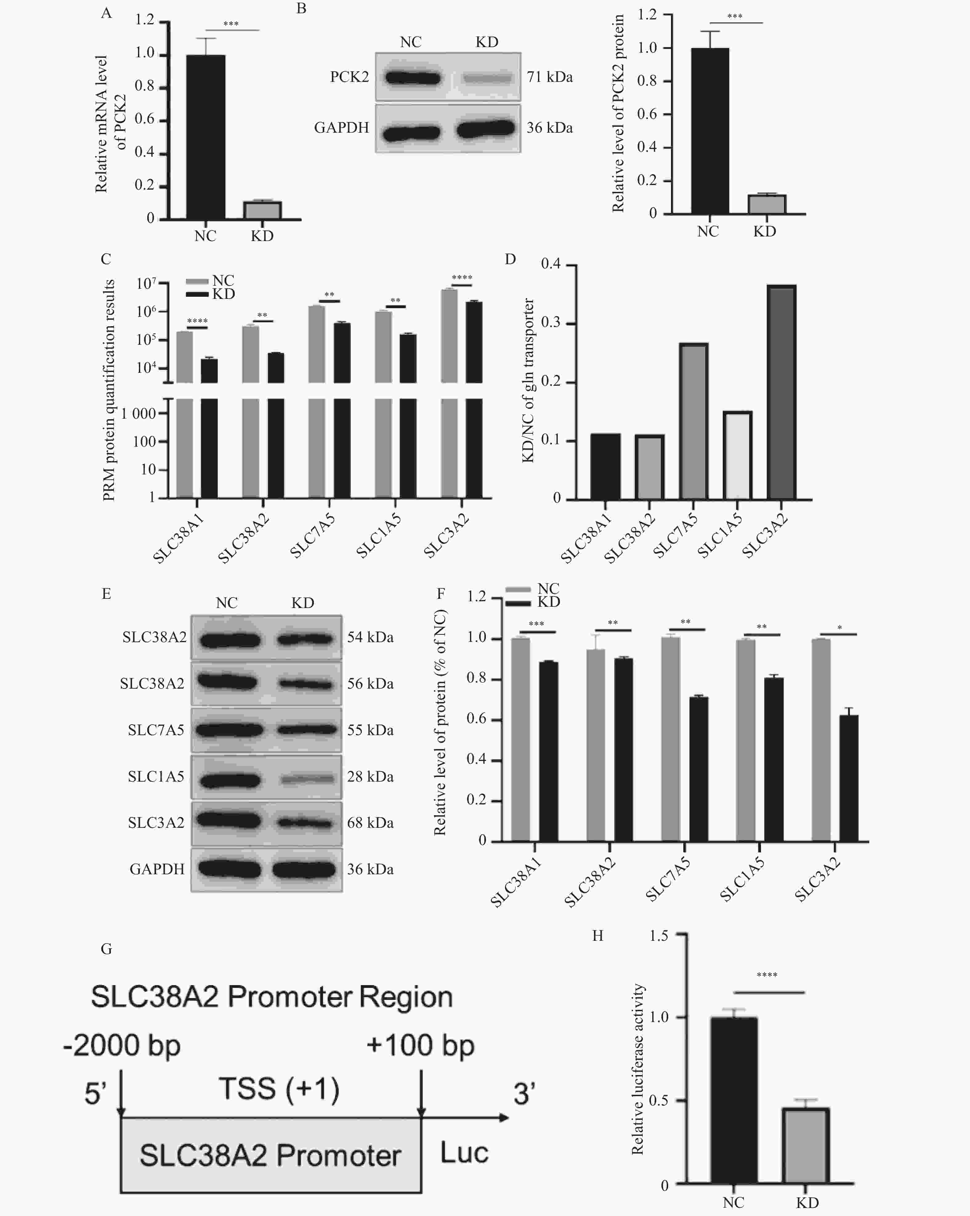 A:使用qPCR验证对照(NC)组和PCK2敲低(KD)组中PCK2 mRNA表达水平;B:使用Western blot验证NC组和KD组中的相对PCK2蛋白表达水平;C:使用PRM靶向蛋白质组学定量Gln转运蛋白在NC组和KD组中的表达;D:PRM靶向蛋白质组学中Gln转运蛋白在NC组和KD组中的定量结果(KD/NC);E:使用Western blot验证Gln转运蛋白在NC组和KD组中的蛋白水平,确认PRM结果; F:蛋白条带的灰度值定量分析结果。蛋白表达水平以 GAPDH 为内参进行归一化处理,数据以相对 NC 组的倍数表示。G:双荧光素酶报告基因载体构建模式图;H:双荧光素酶实验验证PCK2对SLC38A2表达的影响。*P < 0.05; **P < 0.01; ***P < 0.001; ****P < 0.000 1。
