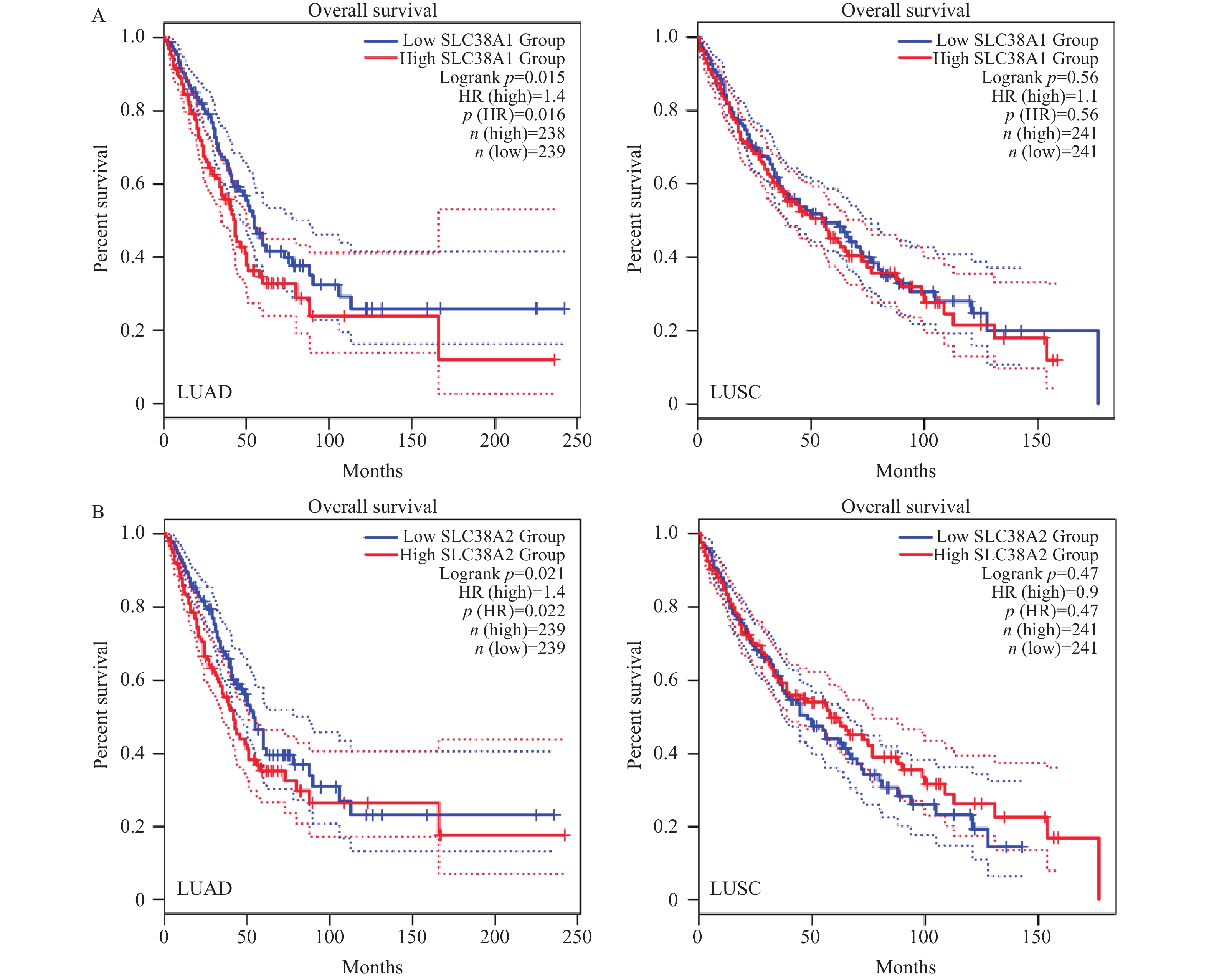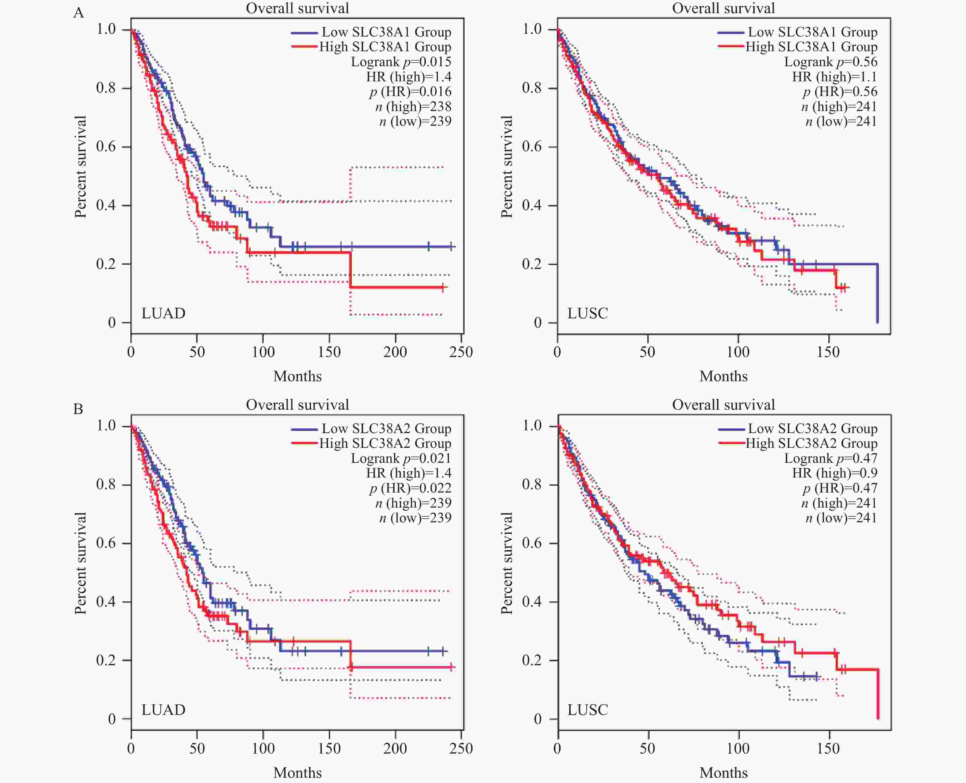 P 值SLC38A2 LUAD 0.0053 130 120~160 180 150~210 0.021* LUSC 0.92 180 170~210 190 170~210 0.47 SLC38A1 LUAD 0.19 130 120~150 170 150~200 0.015* LUSC 0.44 200 150~220 210 170~230 0.56 *P < 0.05。 -