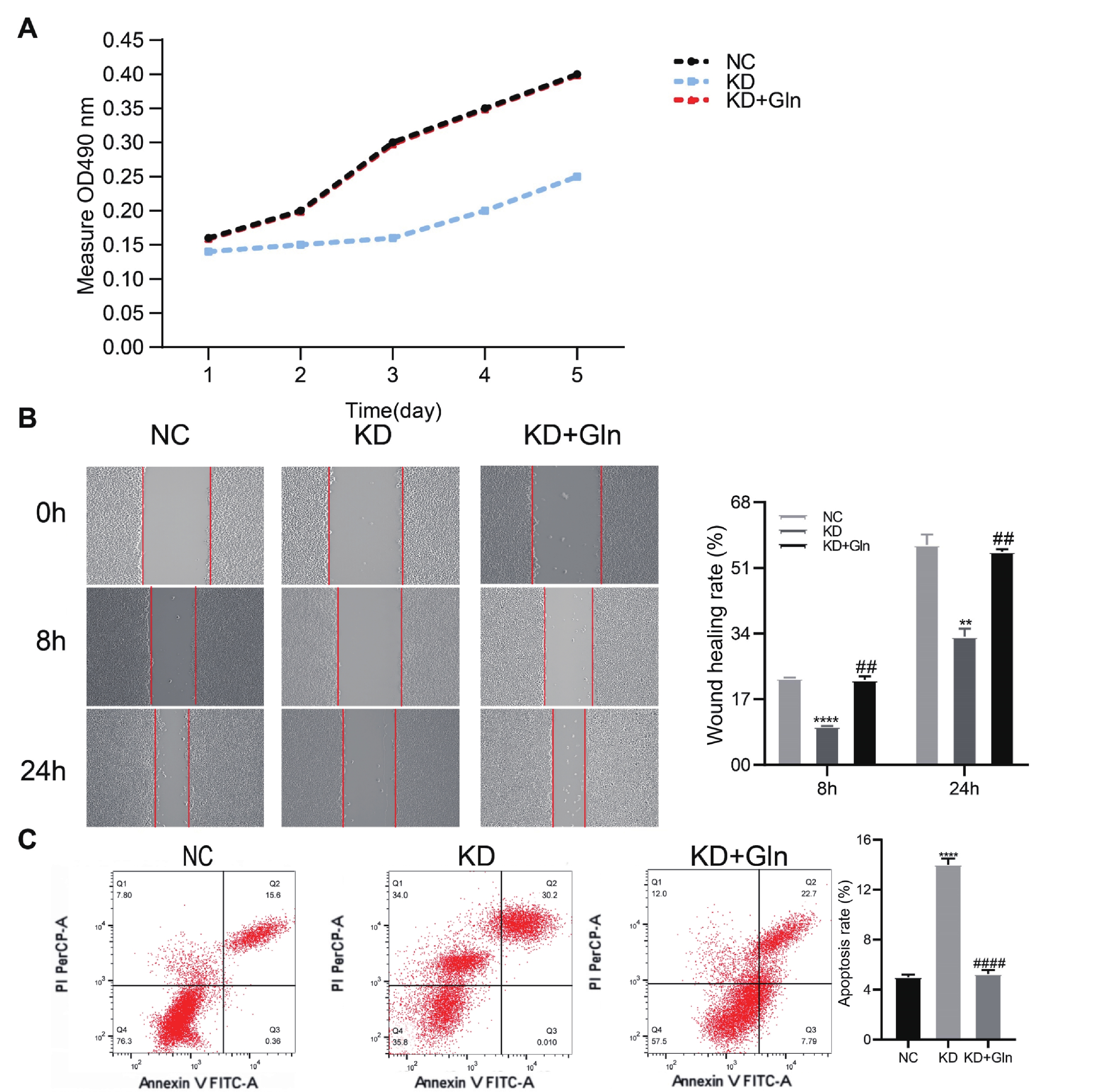 A:使用MTT法评估不同组别(NC、KD、KD+Gln)在5 d内的细胞增殖;B:使用创伤愈合实验评估细胞迁移率,在0 h、8 h和24 h进行观察。实验组:NC、KD、KD+Gln。左图为代表性图像,右图为定量结果;C:使用流式细胞术检测细胞凋亡率。实验组:NC、KD、KD+Gln。左图为代表性图,右图为定量结果。与NC组比较,**P < 0.01,****P < 0.000 1,与KD组比较,##P < 0.01,####P < 0.000 1。