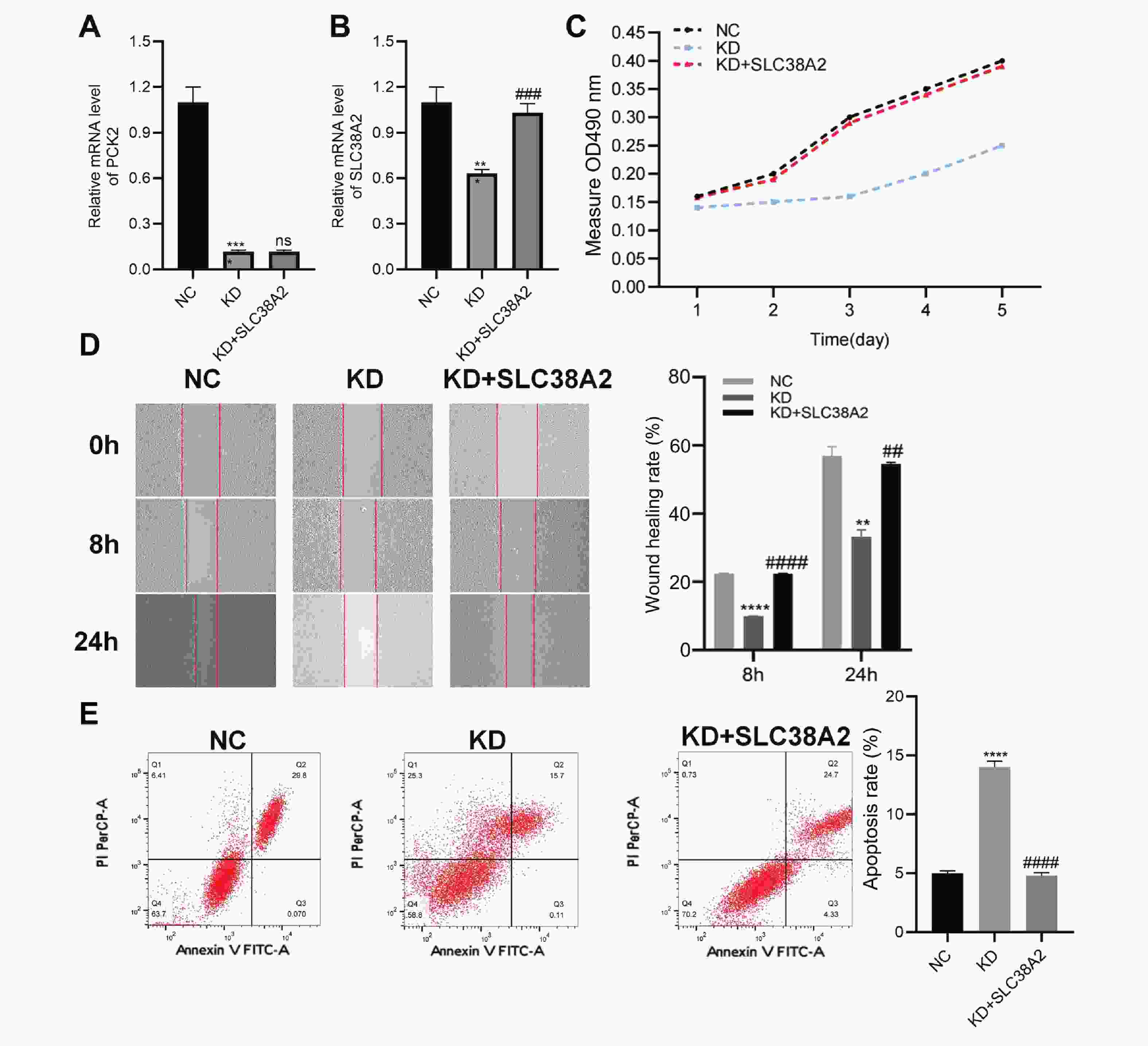 A:使用qPCR验证NC、KD和KD+SLC38A2组的PCK2敲低效率;B:使用qPCR验证SLC38A2过表达效率;C:使用MTT法评估NC、KD和KD+SLC38A2组在5 d内的细胞增殖;D:使用创伤愈合实验评估细胞迁移率,在0 h、8 h和24 h时点进行观察。实验组:NC、KD、KD+SLC38A2。左图为代表性图像,右图为定量结果;E:使用流式细胞术检测细胞凋亡率。实验组:NC、KD、KD+SLC38A2。左图为代表性图,右图为定量结果。与NC组比较,**P < 0.0;***P < 0.001; ****P < 0.000 1;与KD组比较,##P < 0.01; ###P < 0.001; ####P < 0.000 1。