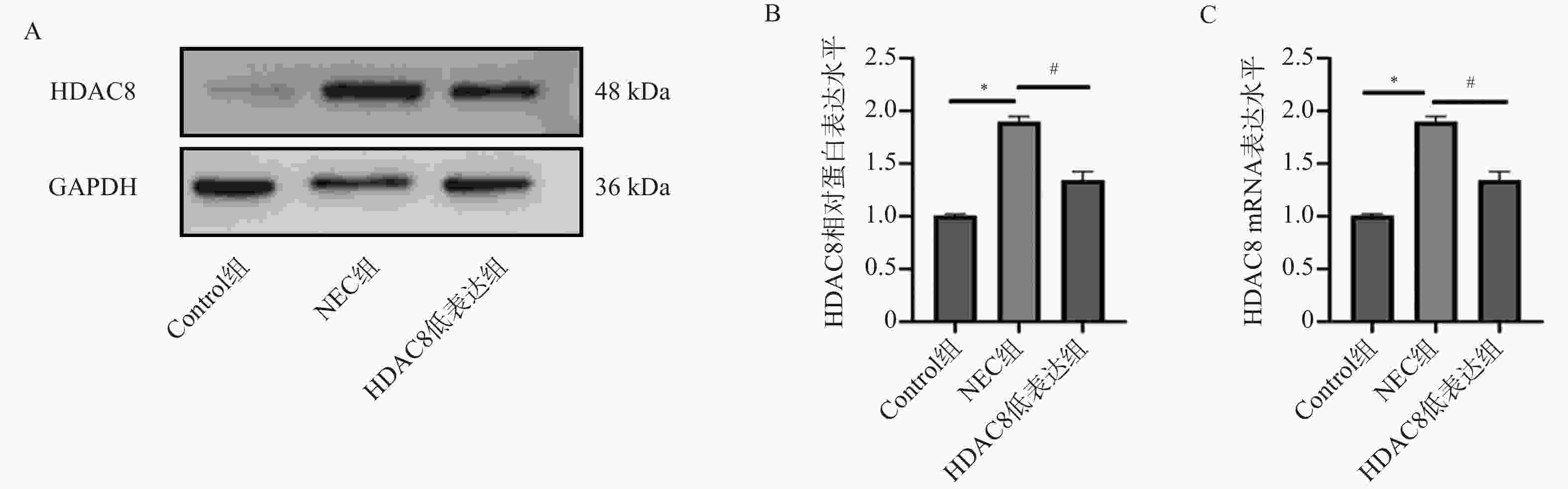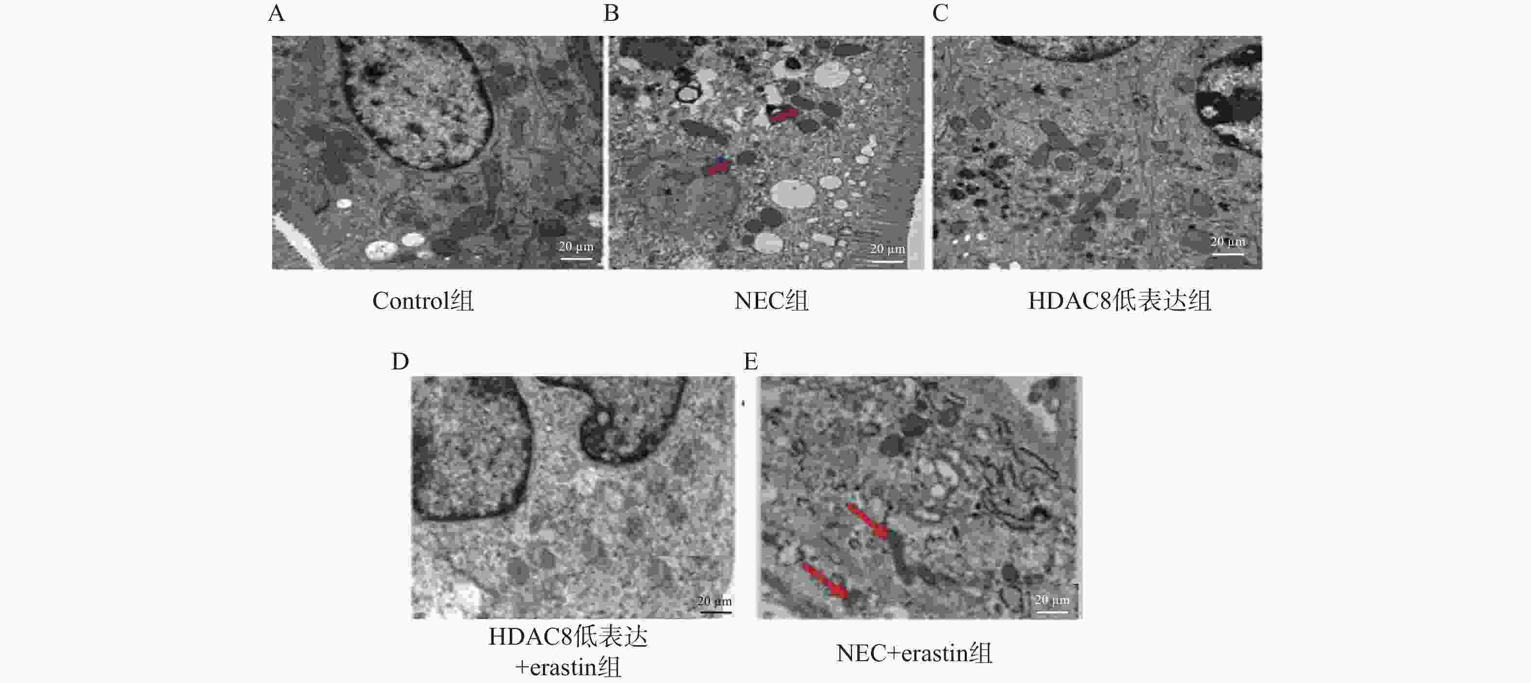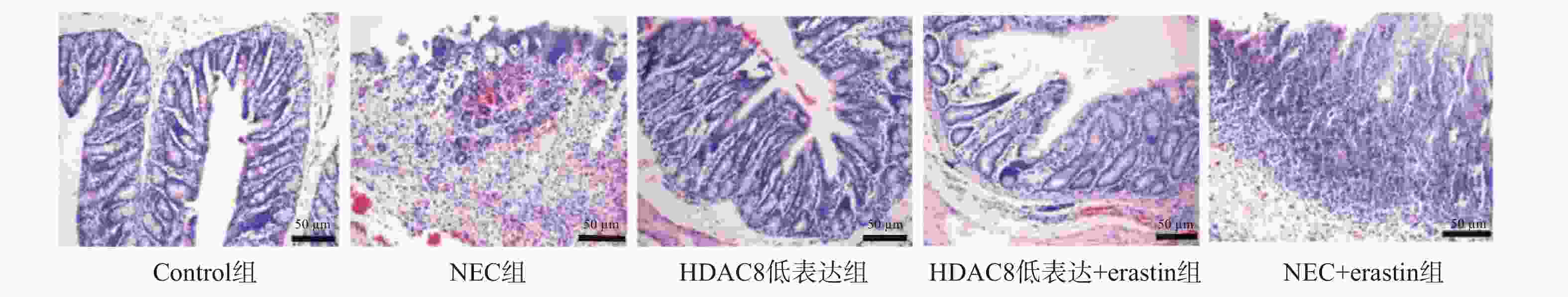 组别 TNF-α(pg/mL) IL-6(pg/mL) IL-1β(pg/mL) Control组 13.44 ± 1.16 22.44 ± 1.16 16.57 ± 0.95 NEC组 22.07 ± 0.50▲▲▲ 31.74 ± 0.84▲▲▲ 23.74 ± 1.17▲▲▲ HDAC8低表达组 17.53 ± 0.74### 22.86 ± 0.95### 18.86 ± 0.56### HDAC8低表达+erastin组 20.20 ± 0.61△△ 27.87 ± 0.76△△△ 21.20 ± 0.61△△ NEC+erastin组 28.72 ± 0.75### 35.38 ± 1.07### 31.38 ± 0.78### F 156.794 101.210 137.340 P < 0.001*** < 0.001*** < 0.001*** ***P < 0.001;与Control组比较,▲▲▲P < 0.001;与NEC组比较,###P < 0.001;与HDAC8低表达组比较,△△P < 0.01,△△△P < 0.001。 表 4 肠上皮细胞HDAC8和SLC7A11 mRNA表达比较($ \bar x \pm s $,n = 3)