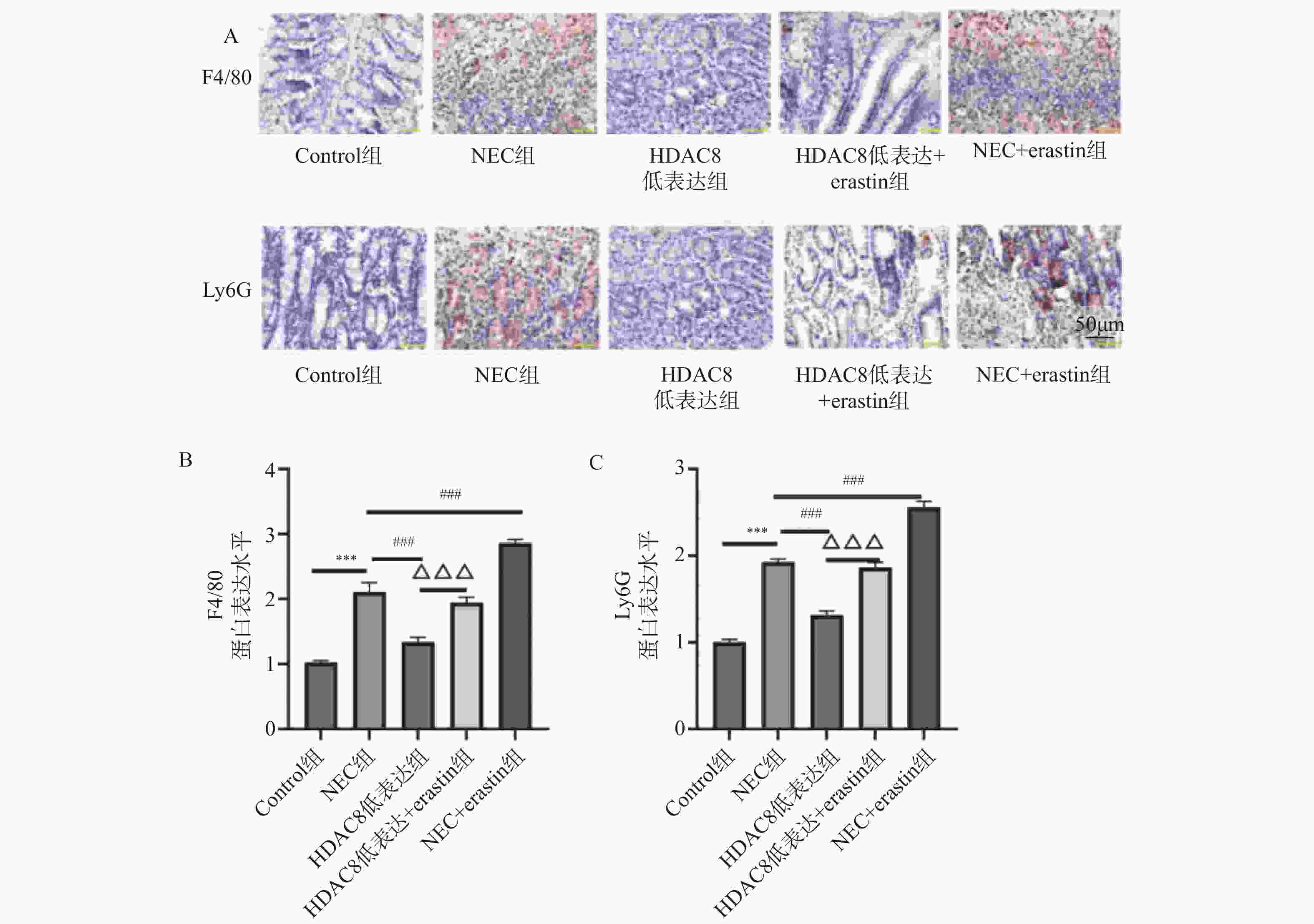 组别 GSH(μmol/g) MDA(nmol/mg ) 4-HNE(ng/mL) ROS(U/mg) Fe2+(μmol/g) Control组 31.44 ± 0.85 20.44 ± 0.99 10.68 ± 0.54 1.01 ± 0.03 1.00 ± 0.04 NEC组 24.74 ± 1.17▲▲▲ 14.74 ± 1.17▲▲▲ 18.72 ± 0.50▲▲▲ 2.15 ± 0.04▲▲▲ 2.14 ± 0.05▲▲▲ HDAC8低表达组 28.86 ± 0.56### 18.86 ± 0.56### 13.48 ± 0.96### 1.42 ± 0.03### 1.47 ± 0.05### HDAC8低表达+erastin组 26.87 ± 0.25△ 16.87 ± 0.25△ 16.77 ± 0.96△△△ 1.88 ± 0.04△△ 1.84 ± 0.05△△ NEC+erastin组 19.38 ± 0.84### 11.38 ± 1.22### 23.36 ± 1.03### 2.55 ± 0.09### 2.63 ± 0.04### F 99.209 44.905 103.325 423.381 523.911 P < 0.001*** < 0.001*** < 0.001*** < 0.001*** < 0.001*** ***P < 0.001;与Control组比较,▲▲▲P < 0.001;与NEC组比较,###P < 0.001;与HDAC8低表达组比较,△P < 0.05,△△P < 0.01,△△△P < 0.001。 表 3 小鼠的肠道组织中炎症因子表达水平($ \bar x \pm s $,n = 3)