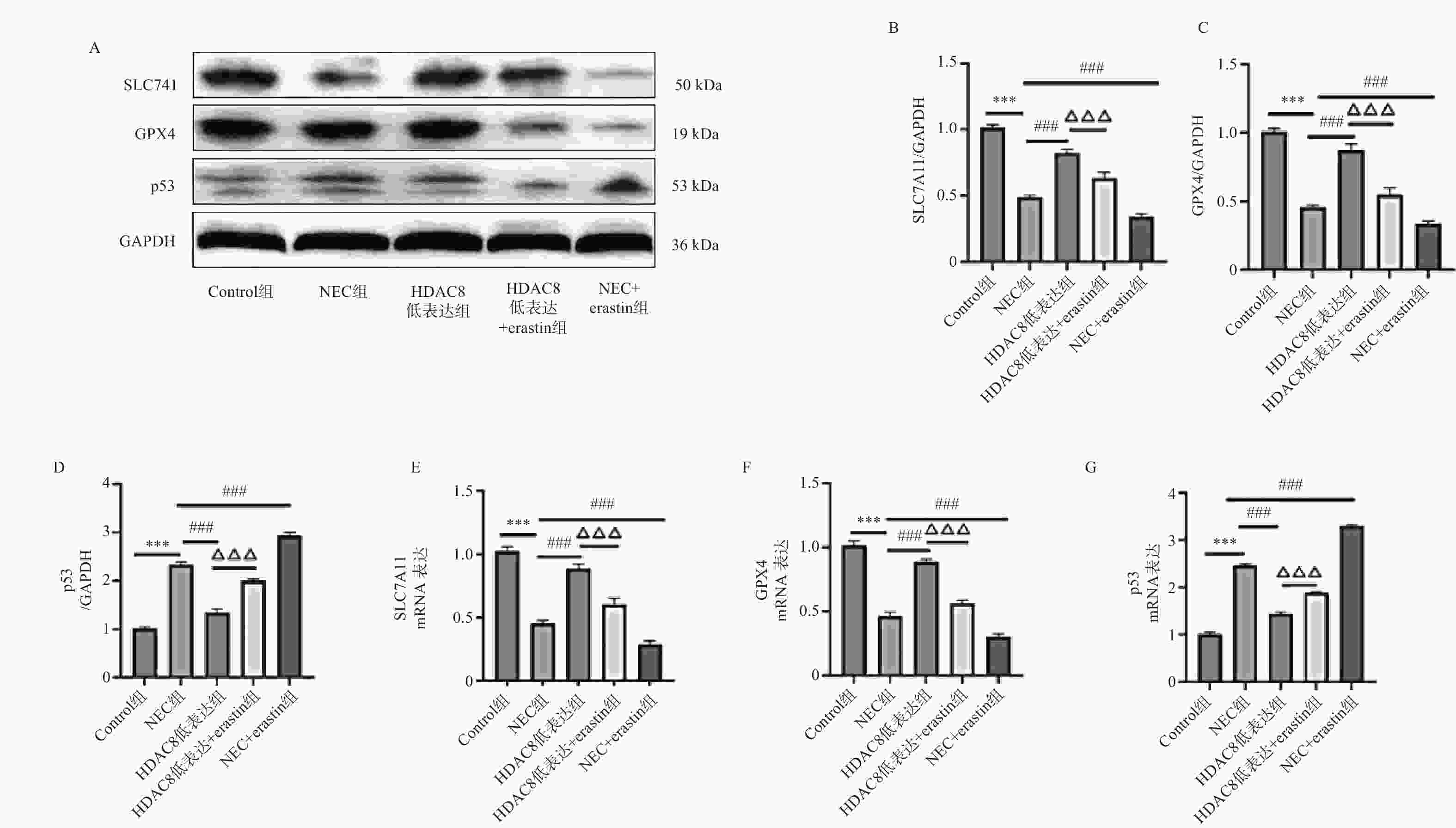 A:小鼠肠道组织中SLC7A11、GPX4、p53蛋白印迹图;B:Western blot检测小鼠肠道组织中SLC7A11蛋白水平;C:Western blot检测小鼠肠道组织中GPX4蛋白水平;D:Western blot检测小鼠肠道组织中p53蛋白水平;E:RT-qPCR检测小鼠肠道组织SLC7A11 mRNA表达水平;F:RT-qPCR检测小鼠肠道组织GPX4 mRNA表达水平;G:RT-qPCR检测小鼠肠道组织p53mRNA表达水平。与Control组比较,***P < 0.001;与NEC组比较,###P < 0.001;与HDAC8低表达组比较,△△△P < 0.001。