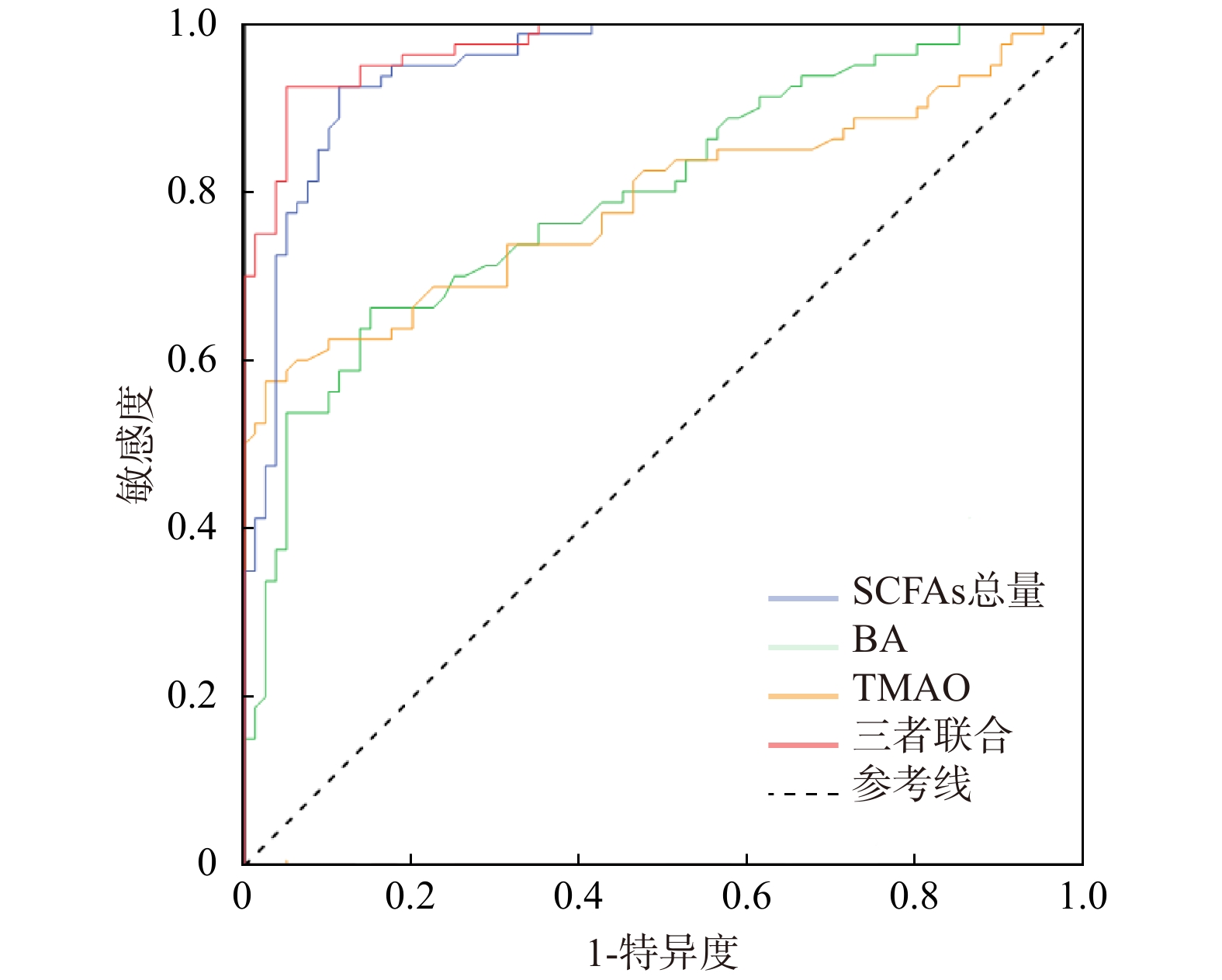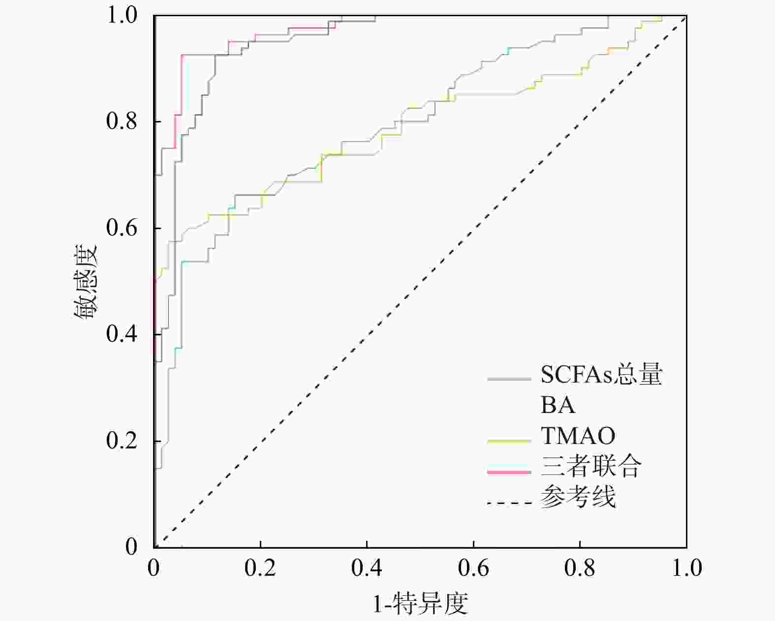 因素 β SE Waldχ2 P OR 95%CI SCFAs总量 1.049 0.205 26.045 <0.001* 2.854 1.908~4.269 BA −1.831 0.542 11.432 0.001* 0.160 0.055~0.463 TMAO −1.359 0.565 5.788 0.016* 0.257 0.085~0.777 *P < 0.05。 表 6 患者肠道代谢产物水平预测发生SAP的诊断效能