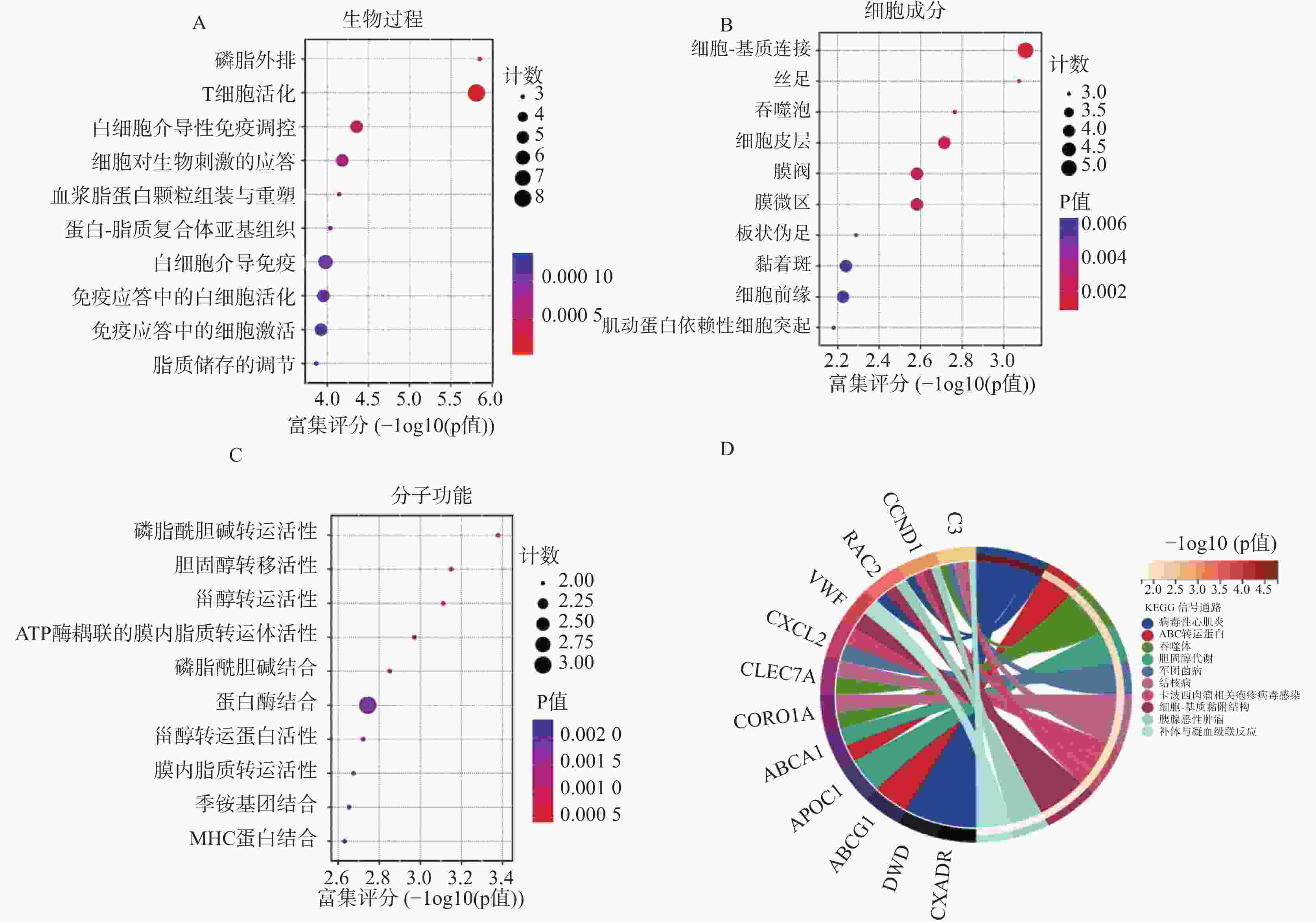 目的 探讨脂代谢相关基因ASP和PPARα在动脉粥样硬化(AS)中的作用。 方法 GEO数据库获取AS数据集GSE9874、GSE28829、GSE21545进行交集筛选出共同差异基因(DEGs);对DEGs进行GO、KEGG富集分析;利用String数据库构建蛋白互作网络(PPI),并使用cytoscape软件筛选关键基因,同时,GeneMANIA数据库寻找关键基因的互作基因并利用HDOCK软件进行分子对接预测,进一步体内实验验证 。 将36只8周龄C57小鼠随机分为3组:普食组(n = 12)、高脂组(n = 12)和动脉粥样硬化组(n = 12)。采用油红O染色法观察各组小鼠全主动脉、主动脉窦斑块沉积面积;HE染色观察各组主动脉窦组织病理变化;Elisa法检测各组小鼠血脂水平及PCSK9、ASP和PPARα表达水平;RT-qPCR及WB检测主动脉组织中ASP、PPARα的mRNA和蛋白表达水平;CO-IP分析ASP和PPARα蛋白之间的相互作用。 结果 筛选出AS差异表达基因35个,主要富集于胆固醇转移活性、磷脂酰胆碱转运活性、ABC转运蛋白、吞噬体等方面。PPI和cytoscape的结果筛选出ASP为关键基因,且通过GeneMANIA数据库获得ASP的互作基因:PPARα,分子对接预测结果显示两者存在强相互作用并形成稳定结构。体内实验结果表明,与普食组相比,高脂组和动脉粥样硬化组小鼠主动脉、主动脉窦形态表现出不同程度损伤及斑块面积增加;血清中血脂水平显著升高及主动脉组织中ASP mRNA和蛋白水平均显著升高,PPARα水平则相反;同高脂组相比,动脉粥样硬化组上述指标差异有统计学意义(P < 0.05);CO-IP分析证明ASP和PPARα存在相互作用,且敲低ASP小鼠动脉粥样硬化斑块及血脂水平降低,PPARα表达水平升高。 结论 ASP和PPARα参与了AS的发展,且可能与脂代谢密切相关。 -