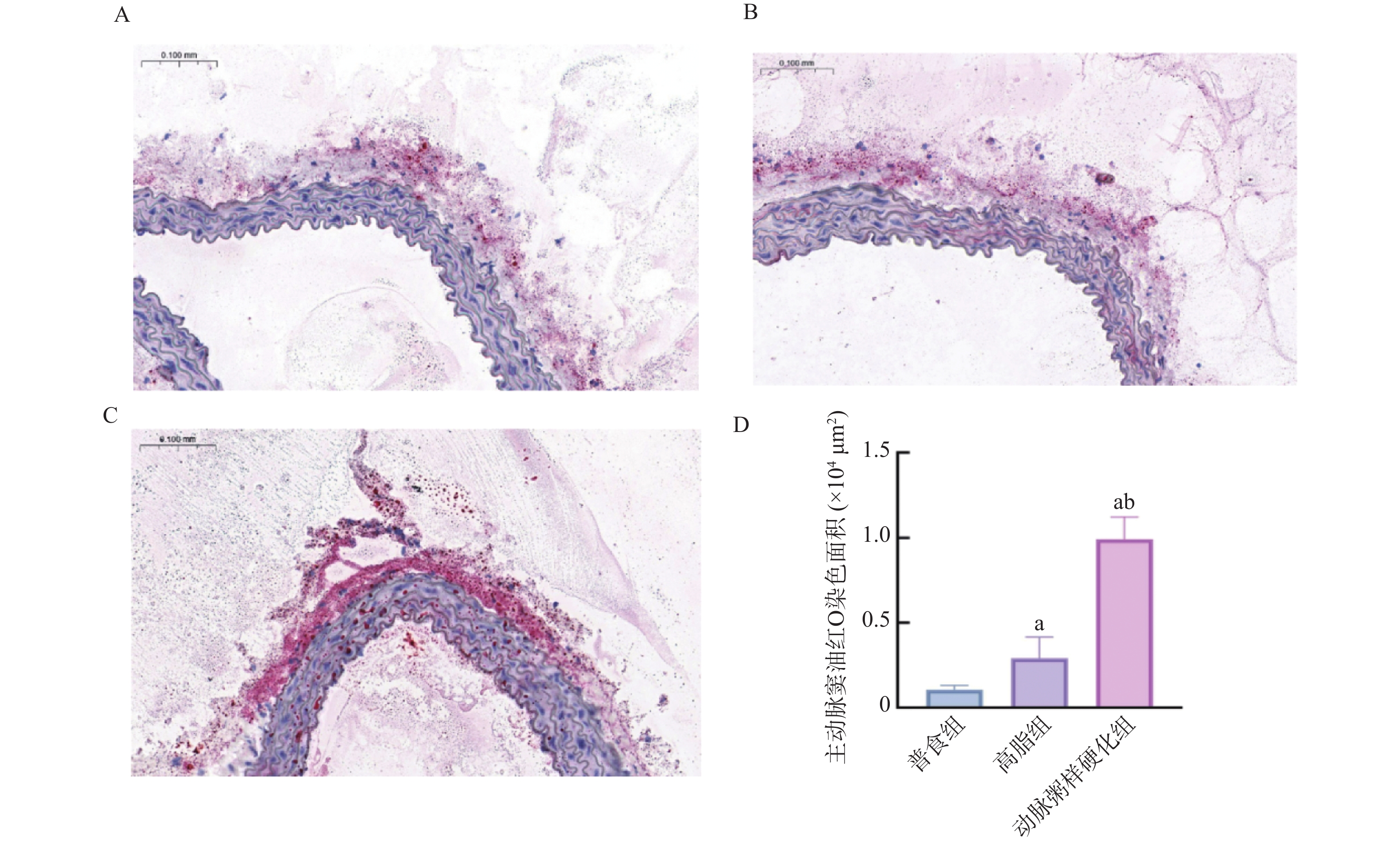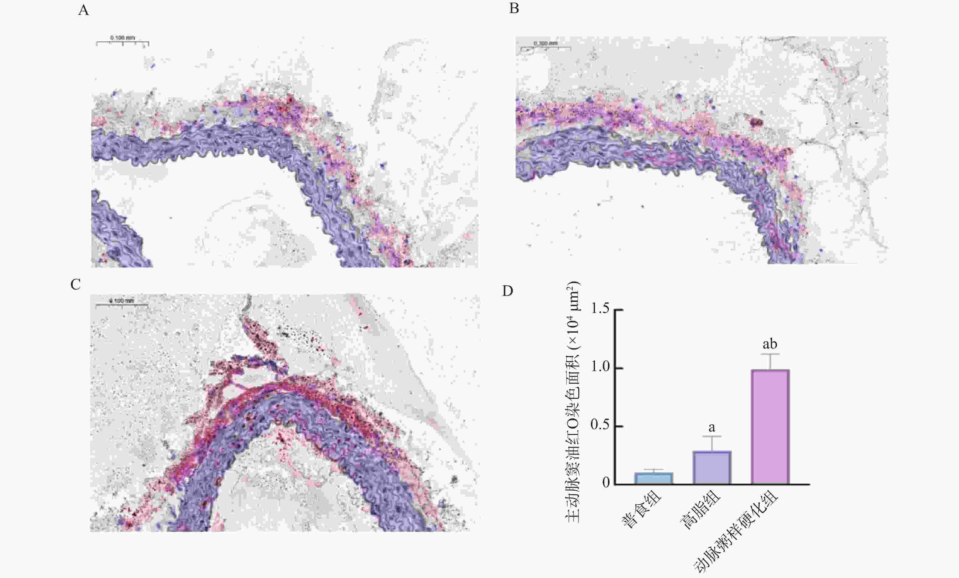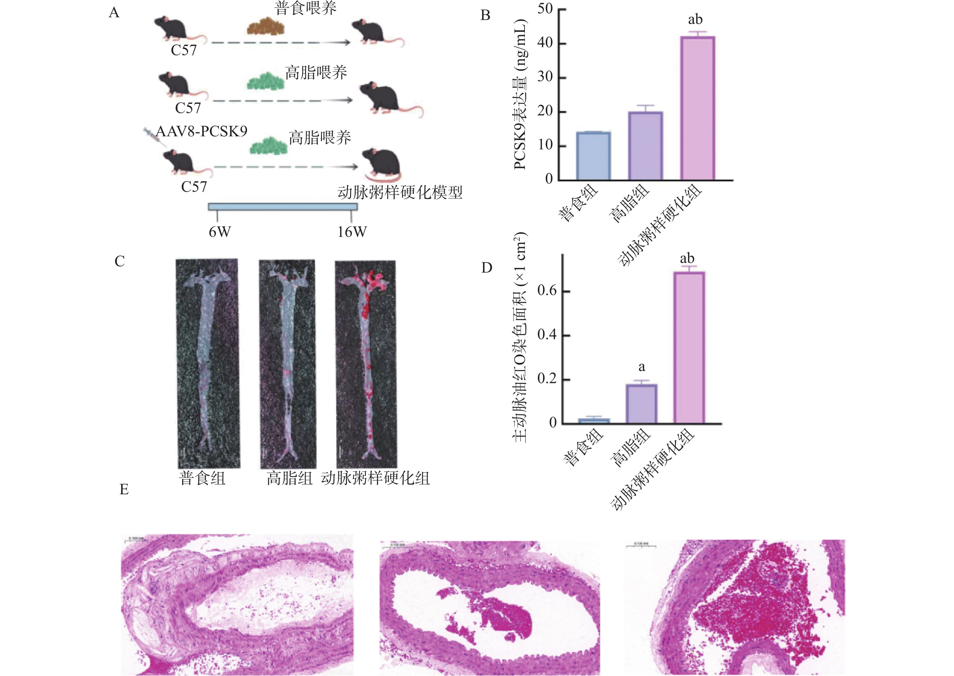 Abstract:Objective To investigate the roles of lipid metabolism-related genes ASP and PPARα in atherosclerosis (AS). Methods Datasets GSE9874, GSE28829, and GSE21545 were retrieved from the GEO database and intersected to identify common differentially expressed genes (DEGs). Gene Ontology (GO) and Kyoto Encyclopedia of Genes and Genomes (KEGG) enrichment analyses were performed on the DEGs. Protein-protein interaction (PPI) networks were constructed using the String database, and critical genes were screened using Cytoscape software. Additionally, interacting genes of critical genes were identified using the GeneMANIA database, and molecular docking predictions were performed using HDOCK software, with further in vivo experimental validation. Thirty-six 8-week-old C57 mice were randomly divided into three groups: normal diet group (n=12), high-fat diet group (n=12), and atherosclerosis group (n=12). Oil Red O staining was used to observe plaque deposition areas in the whole aorta and aortic sinuses of each group. Hematoxylin-eosin (HE) staining was performed to observe pathological changes in aortic sinus tissues. ELISA was used to detect serum lipid levels and expression levels of PCSK9, ASP, and PPARα. Reverse transcription quantitative PCR (RT-qPCR) and Western blotting (WB) were used to detect mRNA and protein expression levels of ASP and PPARα in aortic tissues. Co-immunoprecipitation (CO-IP) analysis was performed to investigate the interaction between ASP and PPARα proteins. Results A total of 35 differentially expressed genes in AS were identified, primarily enriched in cholesterol transfer activity, phosphatidylcholine transport activity, ABC transporters, and autophagy pathways. PPI and Cytoscape analyses identified ASP as a critical gene. Through the GeneMANIA database, PPARα was identified as an interacting gene of ASP. Molecular docking predictions revealed a strong interaction between the two proteins forming a stable structure. In vivo experiments showed that compared with the normal diet group, the high-fat diet and atherosclerosis groups exhibited varying degrees of damage to aortic morphology with increased plaque area; serum lipid levels were significantly elevated and ASP mRNA and protein levels in aortic tissues were significantly increased, while PPARα levels showed the opposite pattern. Compared with the high-fat diet group, these indicators in the atherosclerosis group showed statistically significant differences (P < 0.05). CO-IP analysis confirmed the interaction between ASP and PPARα. In ASP-knockdown mice, atherosclerotic plaques and serum lipid levels decreased while PPARα expression levels increased. Conclusion ASP and PPARα participate in the development of atherosclerosis and may be closely related to lipid metabolism. -