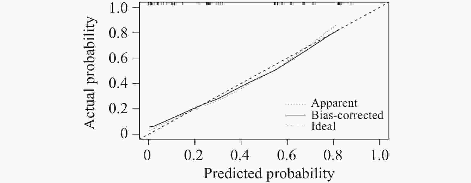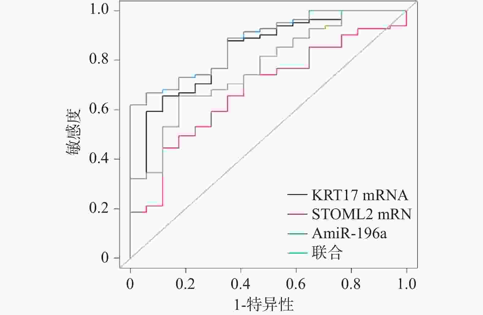 指标 AUC 95%CI P 截断值 敏感度(%) 特异度(%) KRT17 mRNA 0.834 0.733~0.936 <0.001* 1.22 65.43 88.24 STOML2 mRNA 0.678 0.546~0.809 <0.001* 2.86 74.07 58.82 miR-196a 0.768 0.650~0.885 <0.001* 2.67 65.43 82.35 联合 0.873 0.794~0.952 <0.001* − 61.73 99.06 *P < 0.05。 -