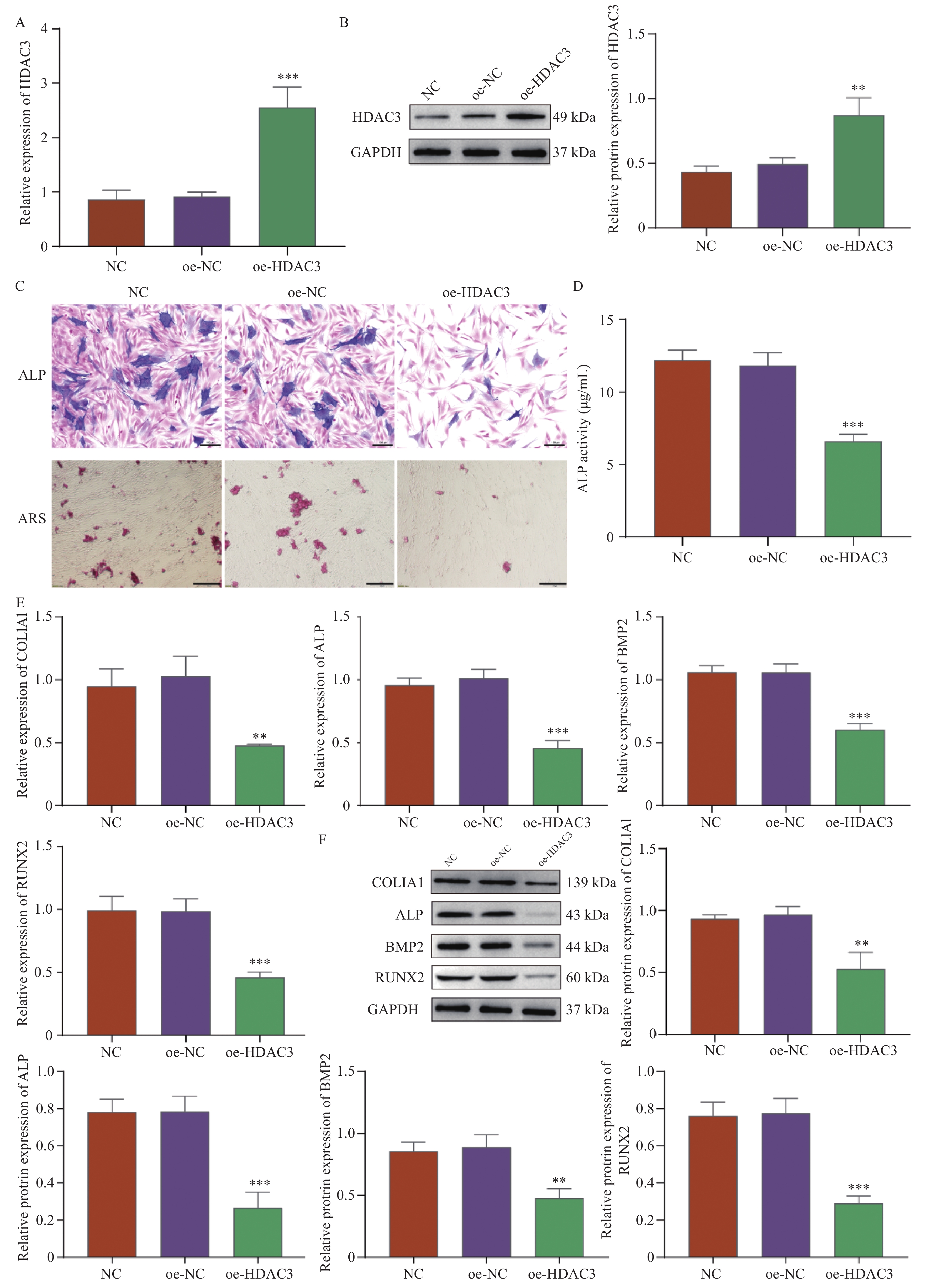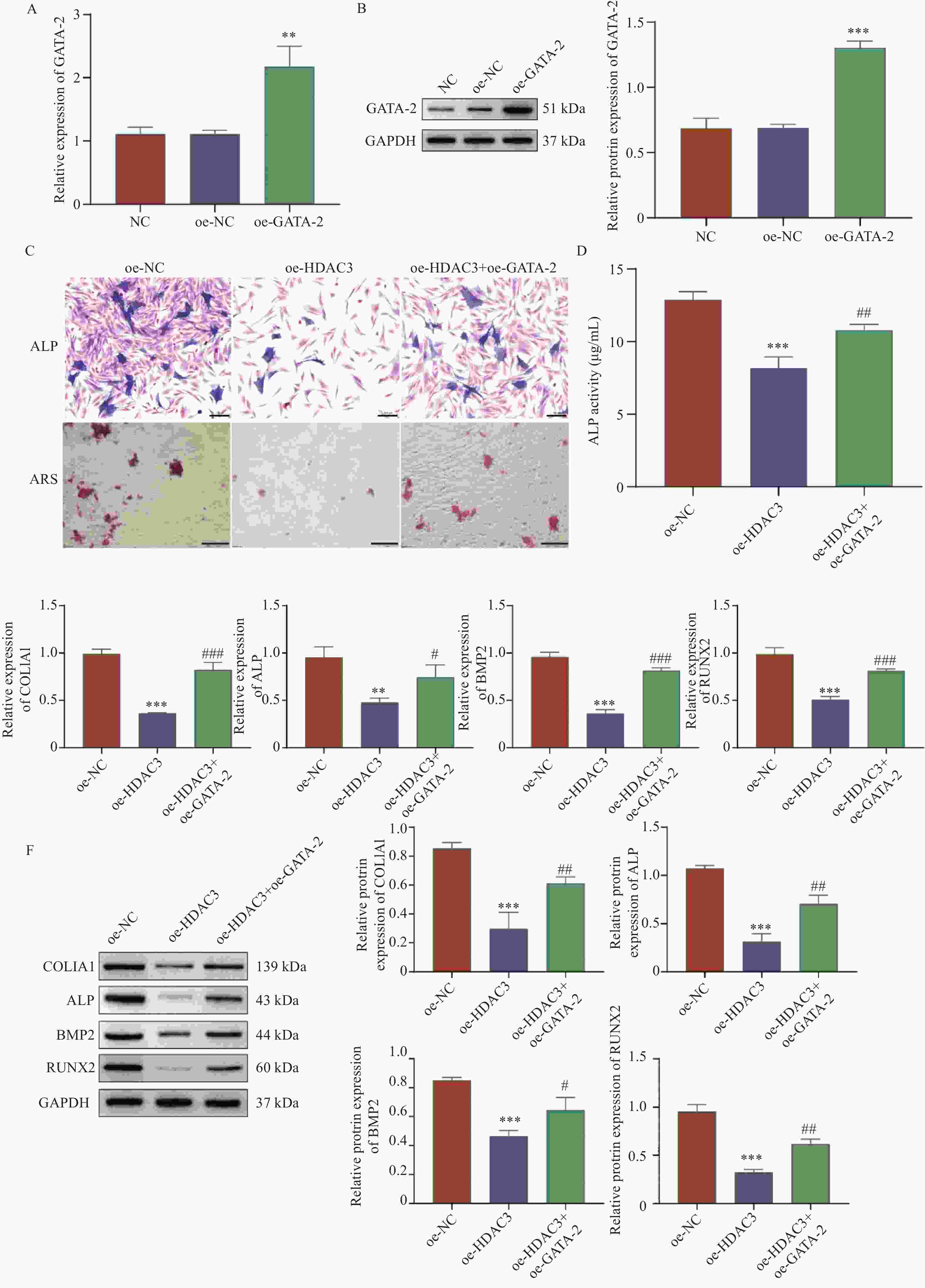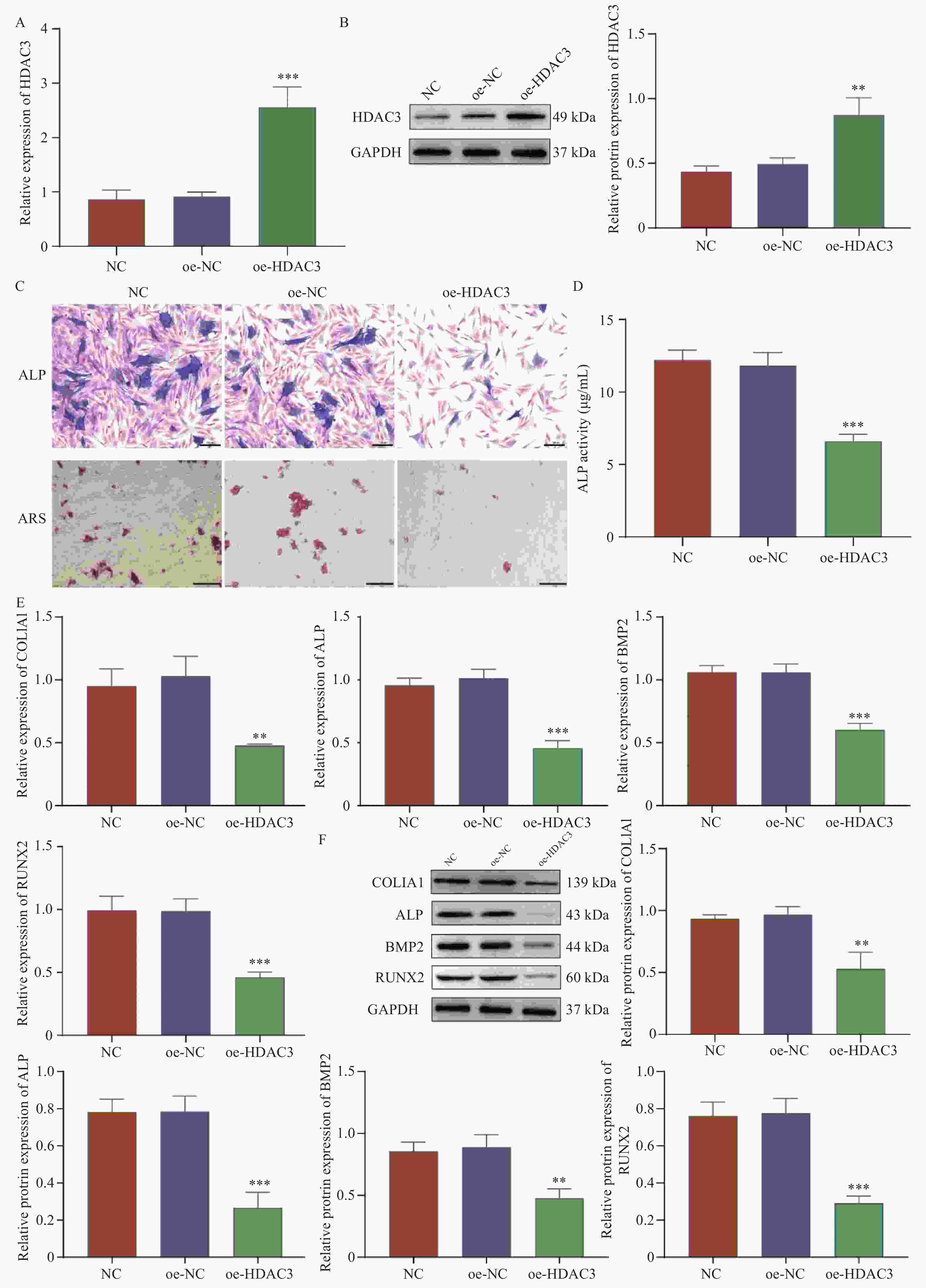 A:RT-qPCR;B:Western blot检测转染效率;C:ALP染色(Scale bar=100 μm)和ARS染色(Scale bar=200 μm);D:试剂盒检测ALP活性;E:RT-qPCR和F:Western blot检测COL1A1、ALP、BMP2和RUNX2的mRNA和蛋白表达;与oe-NC组相比,*P < 0.05,**P < 0.01,***P < 0.001;与oe-HDAC3组相比,#P < 0.05,##P < 0.01,###P < 0.001。