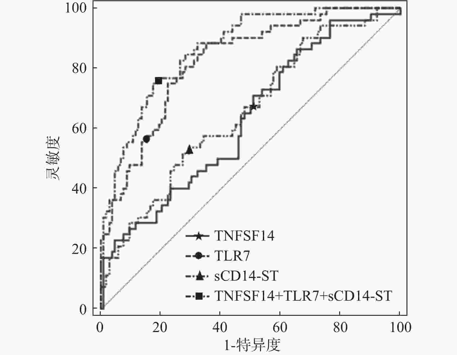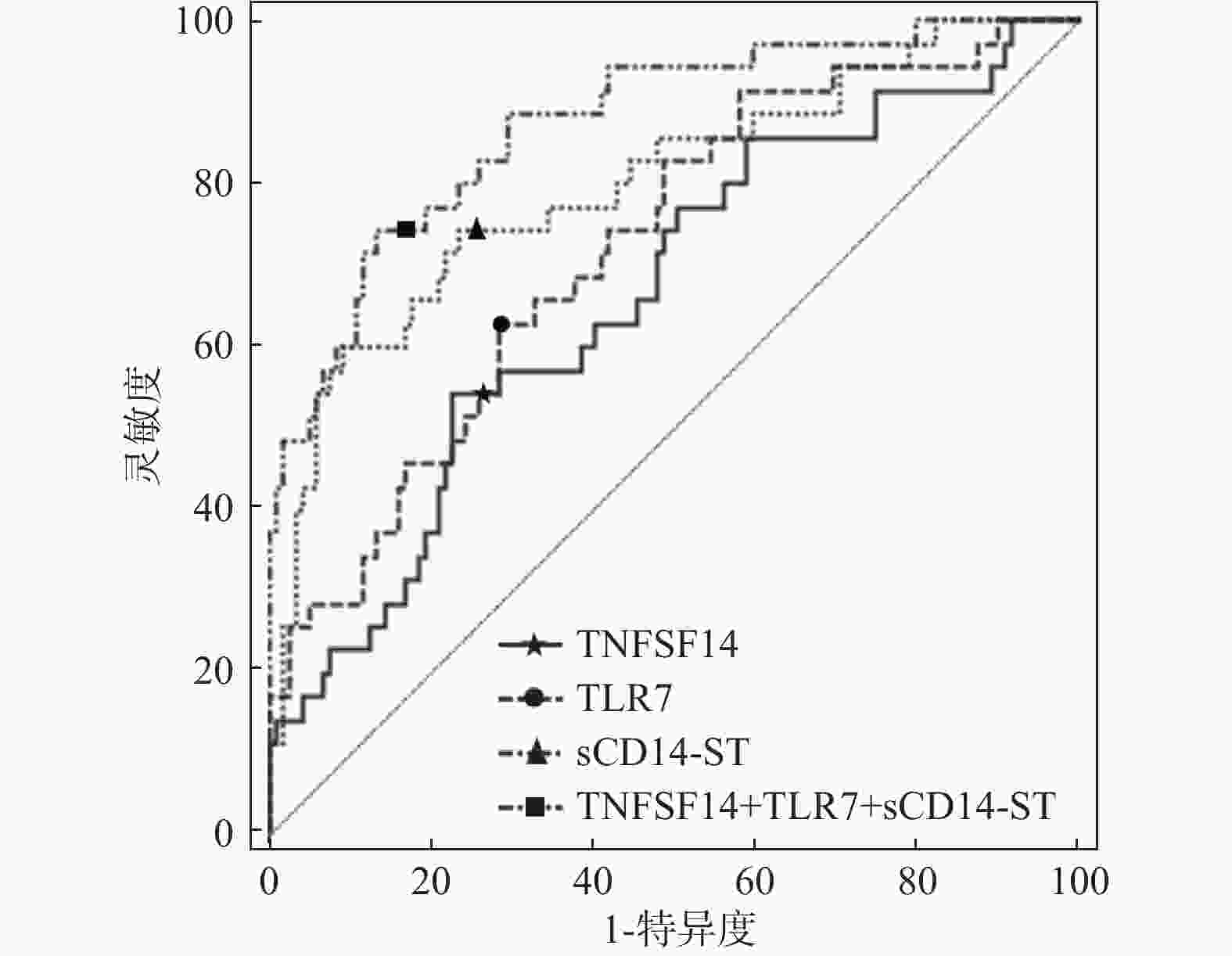 Table  2.   Comparison of serum TNFSF14,TLR7,and sCD14-ST levels between the two groups[($ \bar x \pm s $)/n)]