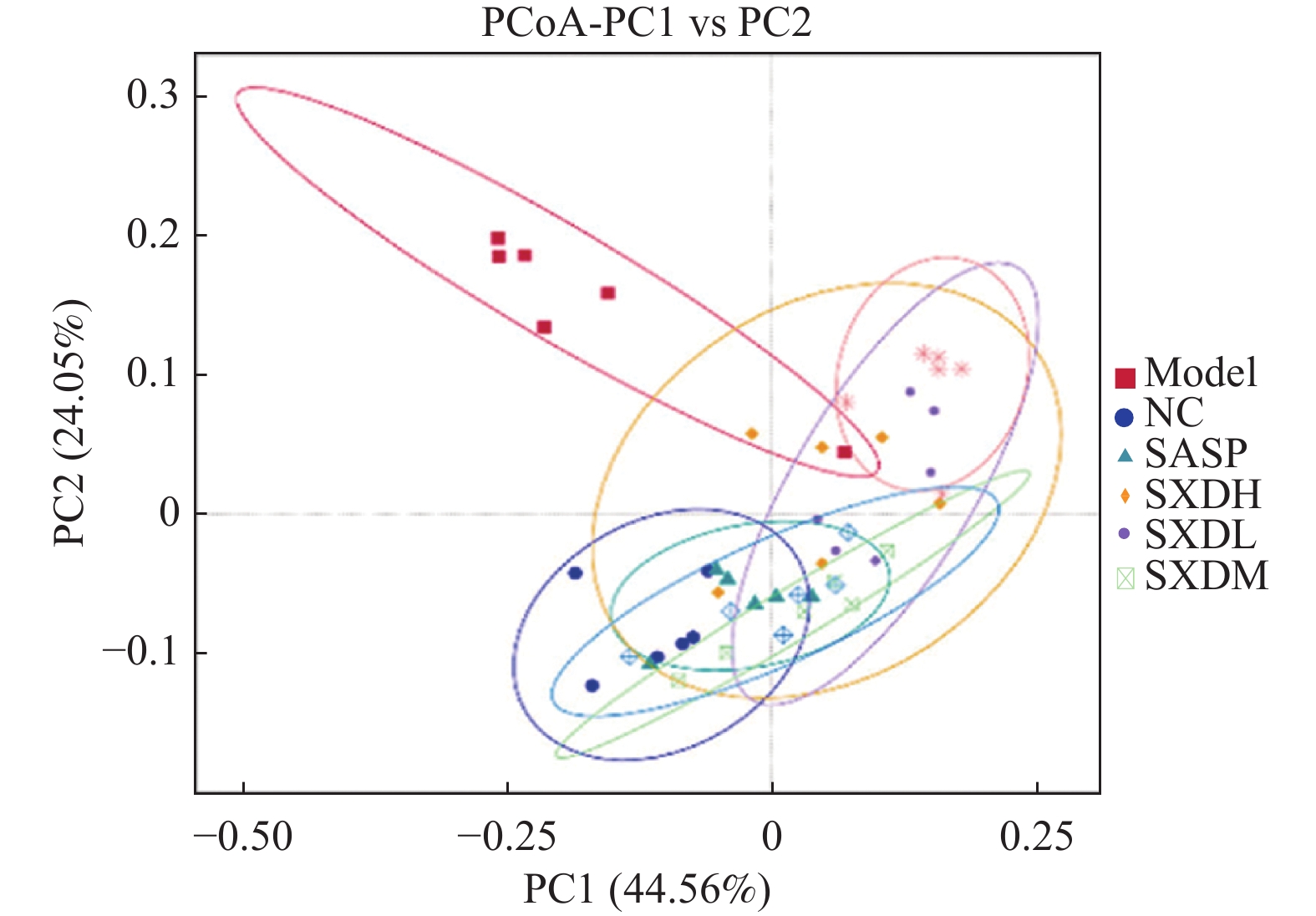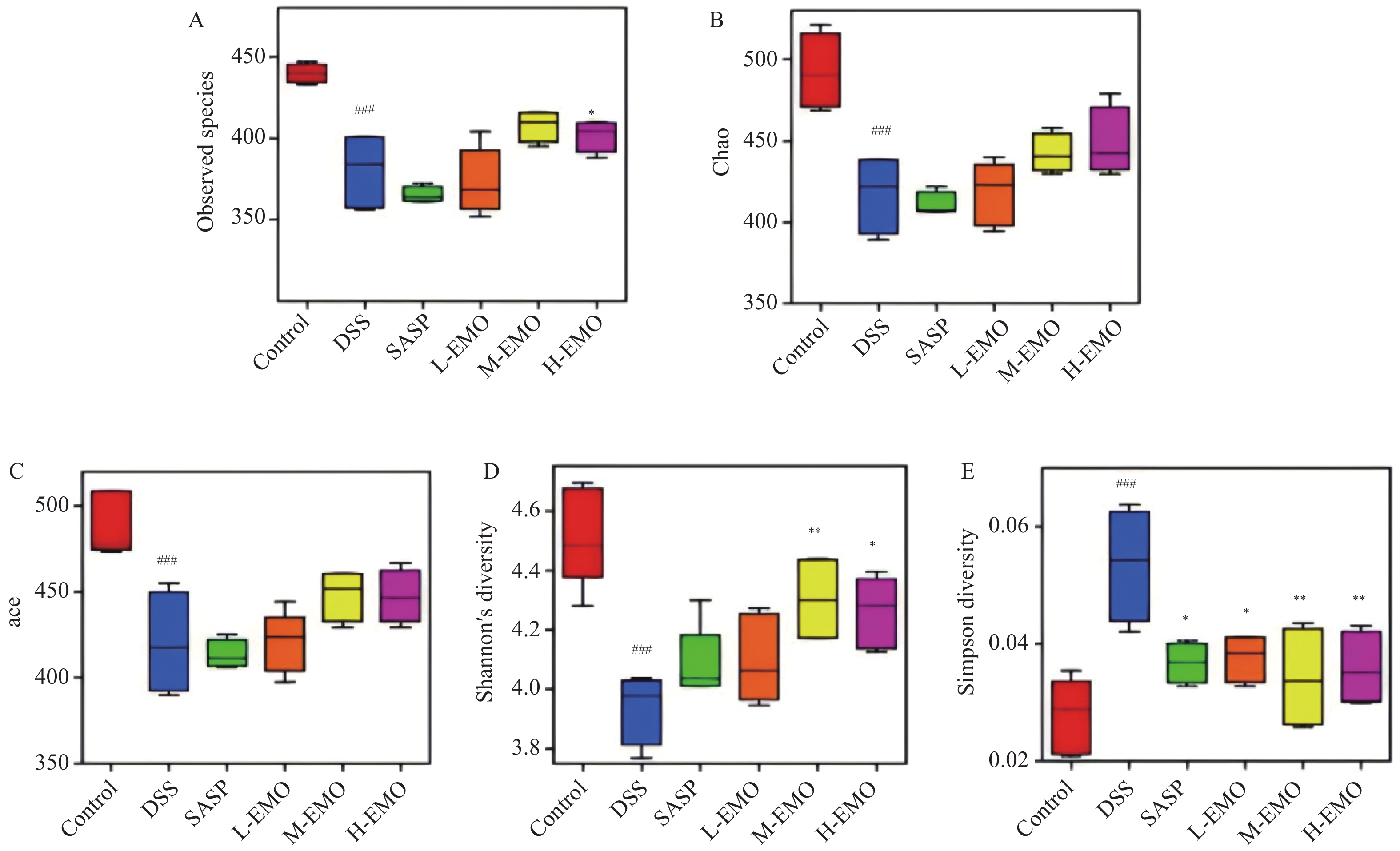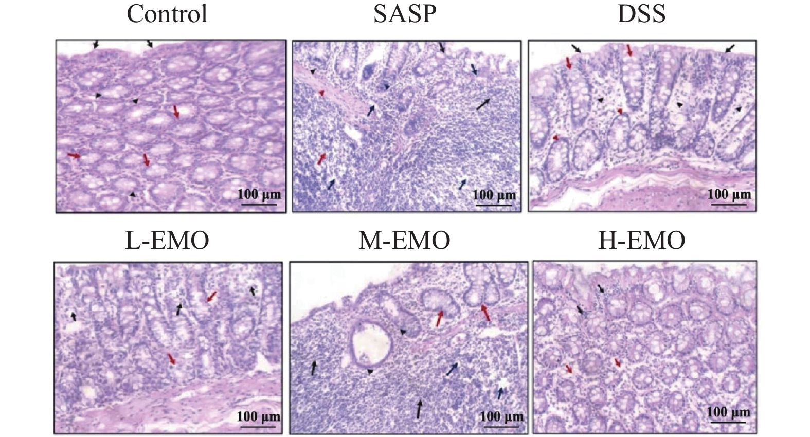 BacteroidesControl 0.29 ± 0.05 0.005 ± 0.001 0.22 ± 0.03 0.030 ± 0.005 DSS 0.19 ± 0.03* 0.150 ± 0.020* 0.06 ± 0.02* 0.180 ± 0.030* SASP 0.38 ± 0.06# 0.015 ± 0.005# 0.17 ± 0.03# 0.061 ± 0.010# L-EMO 0.55 ± 0.08# 0.006 ± 0.003# 0.12 ± 0.02# 0.063 ± 0.011# M-EMO 0.45 ± 0.07# 0.006 ± 0.001# 0.21 ± 0.03# 0.025 ± 0.002# H-EMO 0.46 ± 0.07# 0.001 ± 0.001# 0.17 ± 0.03# 0.071 ± 0.015# F 42.18 38.92 25.64 31.07 P <0.001 <0.001 <0.001 <0.001 与Control组相比,*P < 0.05;与DSS组相比,#P < 0.05。 -