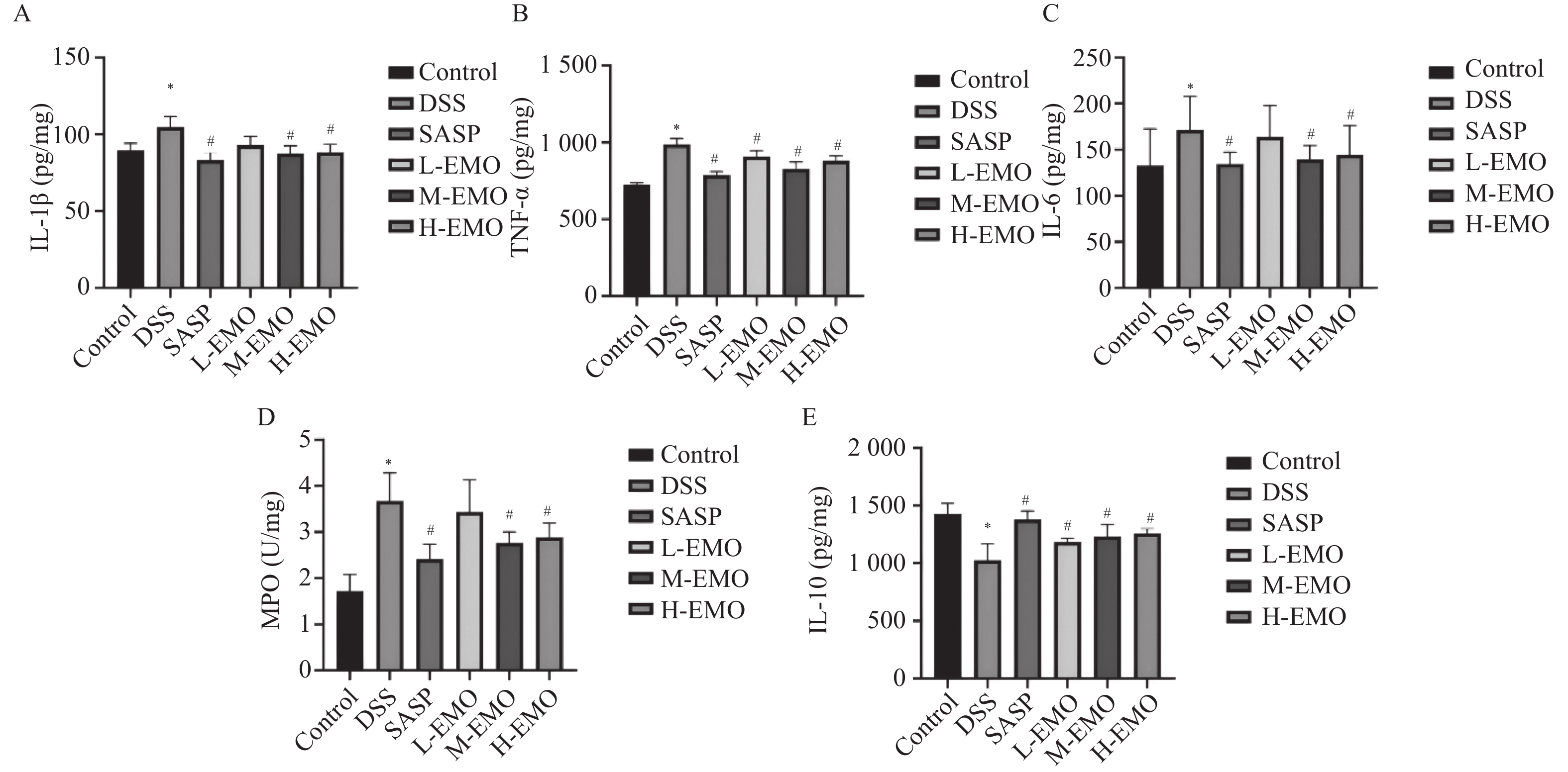 A:各组结肠组织中IL-1β含量比较;B:各组结肠组织中TNF-α含量比较;C:各组结肠组织中IL-6含量比较;D:各组结肠组织中MPO含量比较;E:各组IL-10含量比较。与Control组相比,*P < 0.05;与DSS组相比,#P < 0.05。