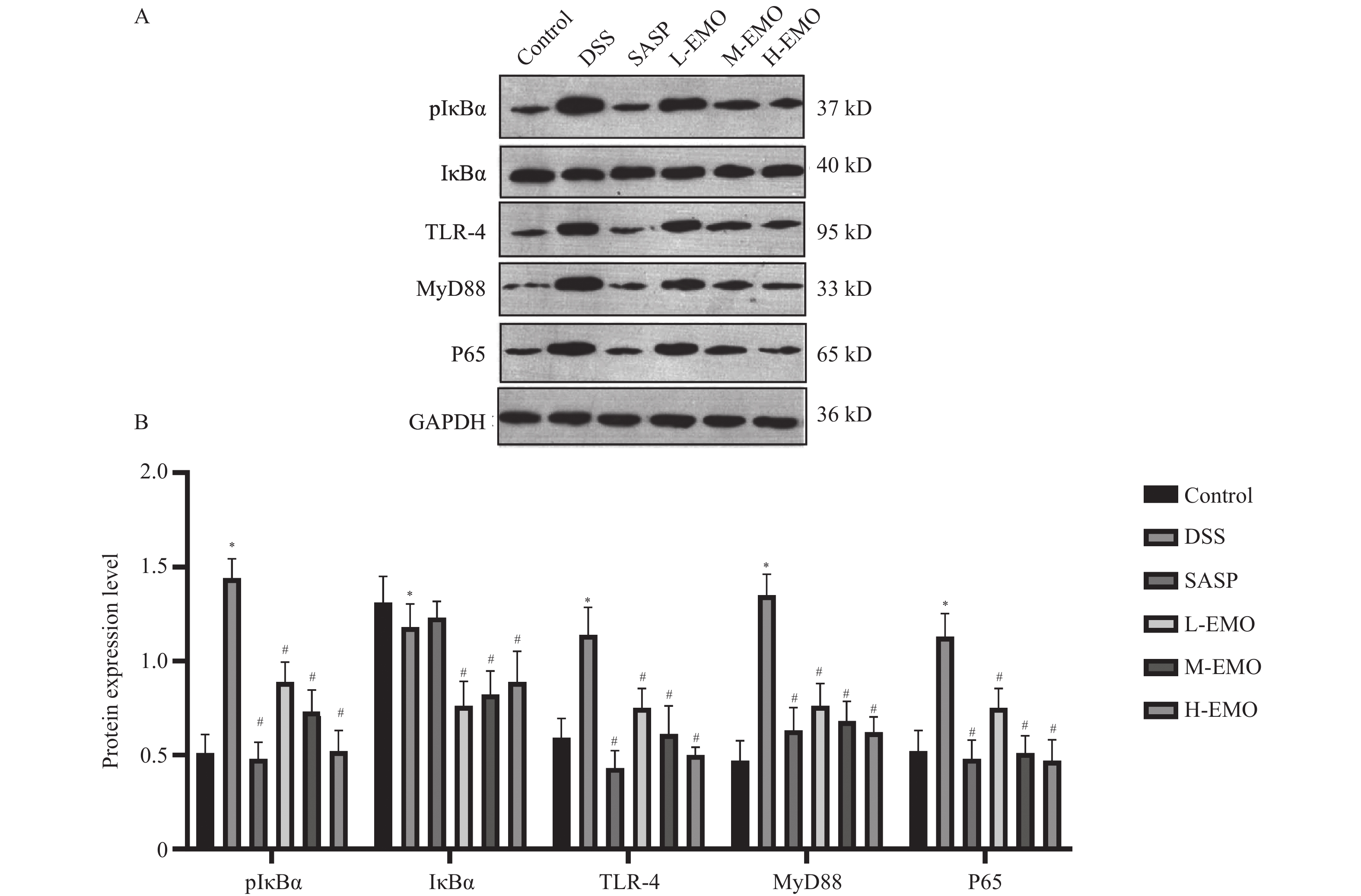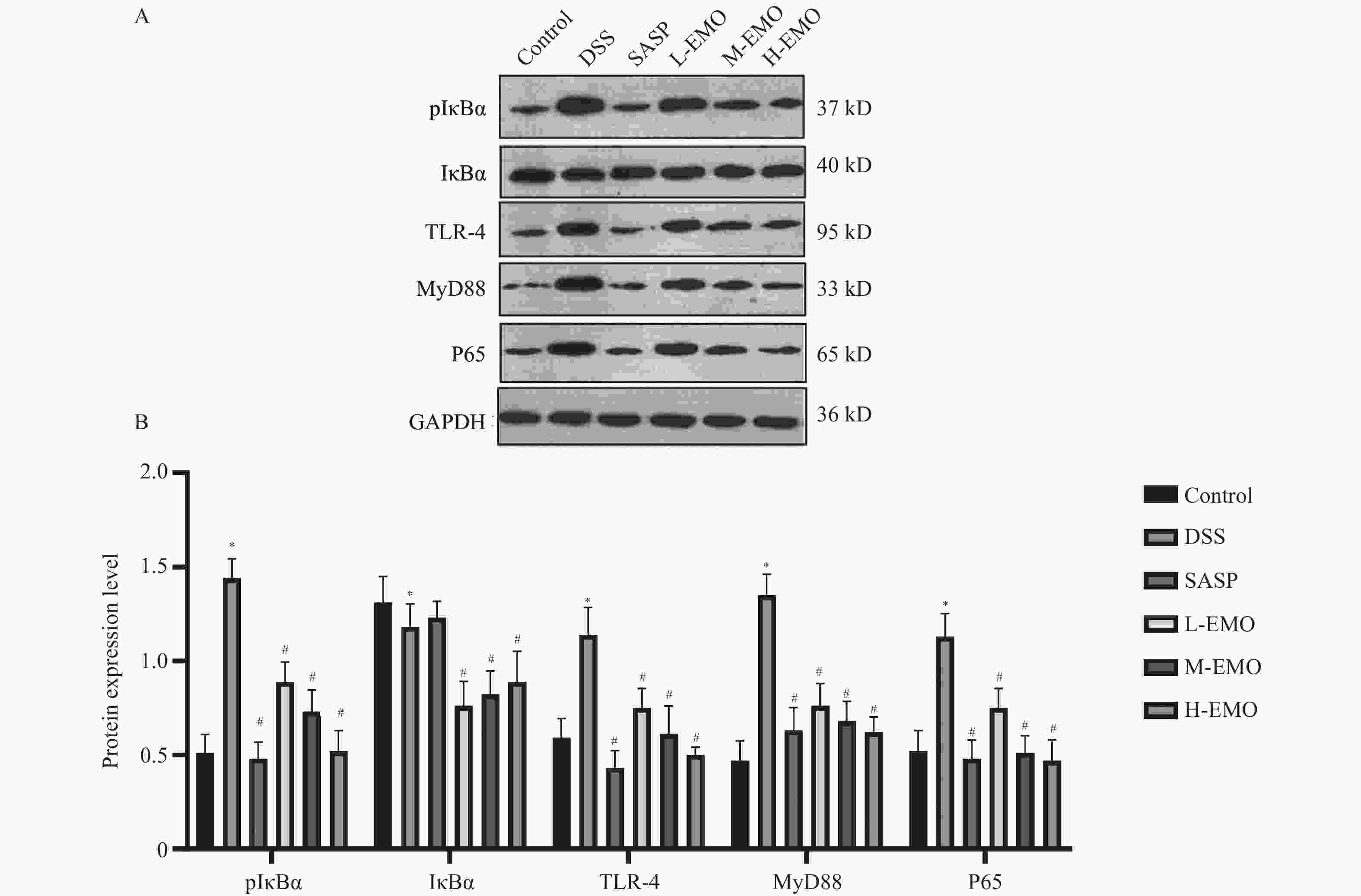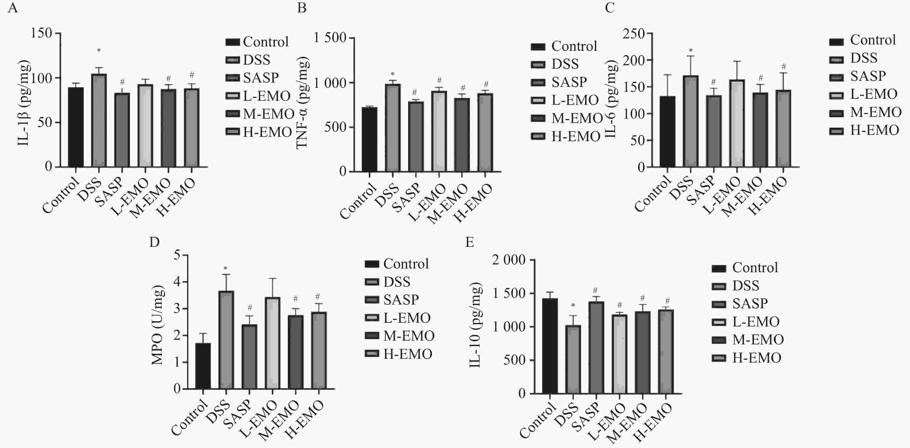 Abstract:Objective To investigate the therapeutic effects and mechanisms of emodin (EMO) on dextran sulfate (DSS)-induced ulcerative colitis (UC) in mice. Methods DSS induced UC mouse model, detection of body weight, colon length and histopathological changes. Enzyme-linked immunosorbent assay (ELISA) was used to measure tumor necrosis factor-α (TNF-α), interleukin-1β (IL-1β), interleukin-6 (IL-6), interleukin-10 (IL-10), and myeloperoxidase (MPO) levels. Western blot analysis examined the expression of Toll-like receptor 4 (TLR4)/myeloid differentiation factor 88 (MyD88)/nuclear factor κB (NF-κB) signaling pathway-related proteins. Flow cytometry assessed the ratio of helper T cells 17 (Th17) to regulatory T cells (Treg). Additionally, 16S rDNA sequencing was employed to evaluate gut microbiota composition. Results Compared with the normal group, DSS-treated mice exhibited significant weight loss, shortened colon length, and marked histological damage (P < 0.001). EMO intervention, particularly at high doses, demonstrated dose-dependent improvements in body weight and colon injury (P < 0.05). ELISA analysis showed EMO reduced TNF-α, IL-1β, and IL-6 levels while increasing IL-10 (P < 0.05). Western blot results indicated EMO inhibited abnormal activation of the TLR4/MyD88/NF-κB pathway and restored IκB. Conclusion EMO effectively mitigates DSS-induced ulcerative colitis (UC) inflammation and intestinal damage by regulating the TLR4/MyD88/NF-κB pathway, restoring Th17/Treg balance, and maintaining microbial homeostasis, providing theoretical support for its potential as a UC therapeutic agent. -