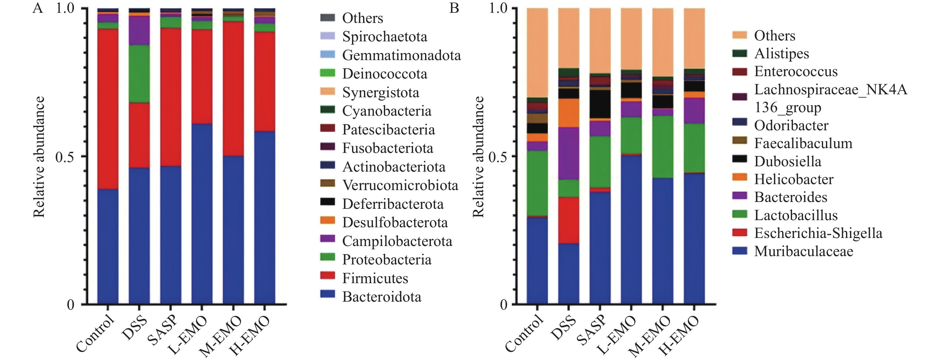 组别 Th17 Tregs Control 0.33 ± 0.03 4.17 ± 0.26 DSS 0.52 ± 0.03* 3.60 ± 0.29* SASP 0.81 ± 0.02* 2.19 ± 0.30* L-EMO 0.64 ± 0.02# 3.54 ± 0.27# M-EMO 0.53 ± 0.02# 3.74 ± 0.14# H-EMO 0.50 ± 0.04# 3.90 ± 0.24# F 38.72 25.83 P <0.001 <0.001 与Control组相比,*P < 0.05;与DSS组相比,#P < 0.05。 表 2 各组小鼠肠道菌群在属水平的相对丰度变化($\bar x \pm s $/%,n = 8)