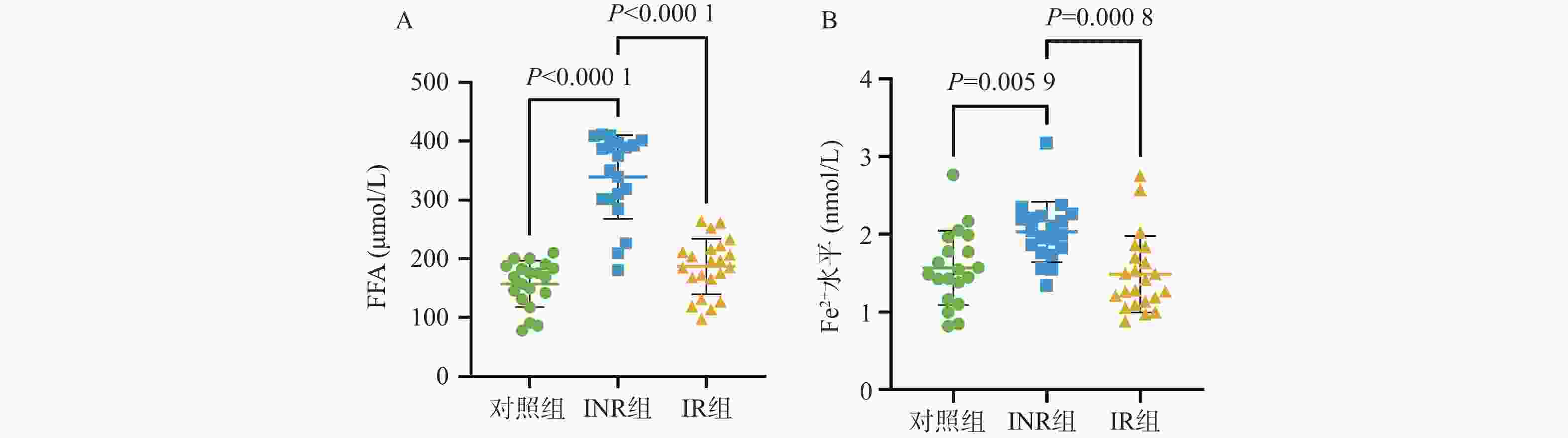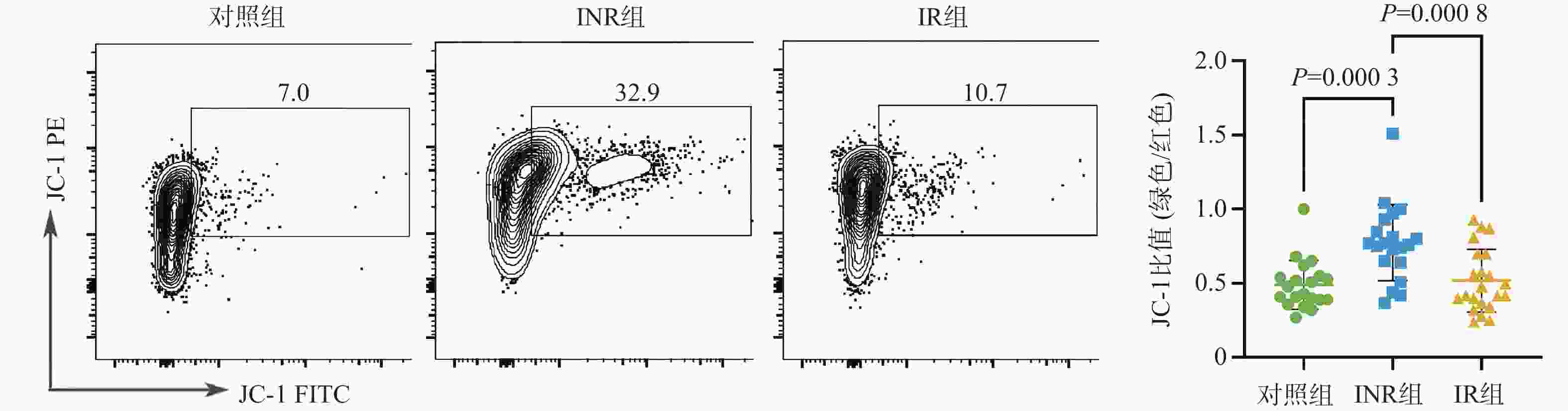 特征 对照组(n=20) INR组(n=20) IR组(n=22) Z/χ2 P 年龄,岁 35(33,38) 39(33,43) 35(31,40) 0.917 0.405 CD4+ T细胞,细胞数/μL 842(535,958)* 284(225,323) 502(398,711)* 17.328 <0.001 CD8+ T细胞,细胞数/μL 639(463,870) 581(490,862) 665(505,896) 2.076 0.134 基线CD4+ T细胞,细胞数/μL 163(101,244) 242(193,347) 1.494 0.143 基线HIV RNA,拷贝数/mL 3.544 0.057 ˂105 12 20 ≥105 8 2 治疗方案 - 0.961 TDF + EFV + 3TC 19 22 其他 1 0 ART治疗持续时间,年 5.11(4.10,6.52) 5.02(4.15,7.01) 2.021 0.494 成功ART的时间,年 4.63(3.62,6.21) 4.52(3.63,6.52) 1.684 0.297 总胆固醇,mmol/L 4.20(3.65,4.43) 4.17(3.46,4.97) 0.062 0.991 甘油三酯,mmol/L 1.89(1.36,2.77) 1.39(1.01,2.06)* 4.240 <0.001 HLD,mmol/L 1.03(0.85,1.18) 0.96(0.89,1.26) 1.761 0.086 LDL,mmol/L 2.29(1.98,2.77) 2.41(1.85,3.37) 1.283 0.207 与INR组相比,*P < 0.05 -