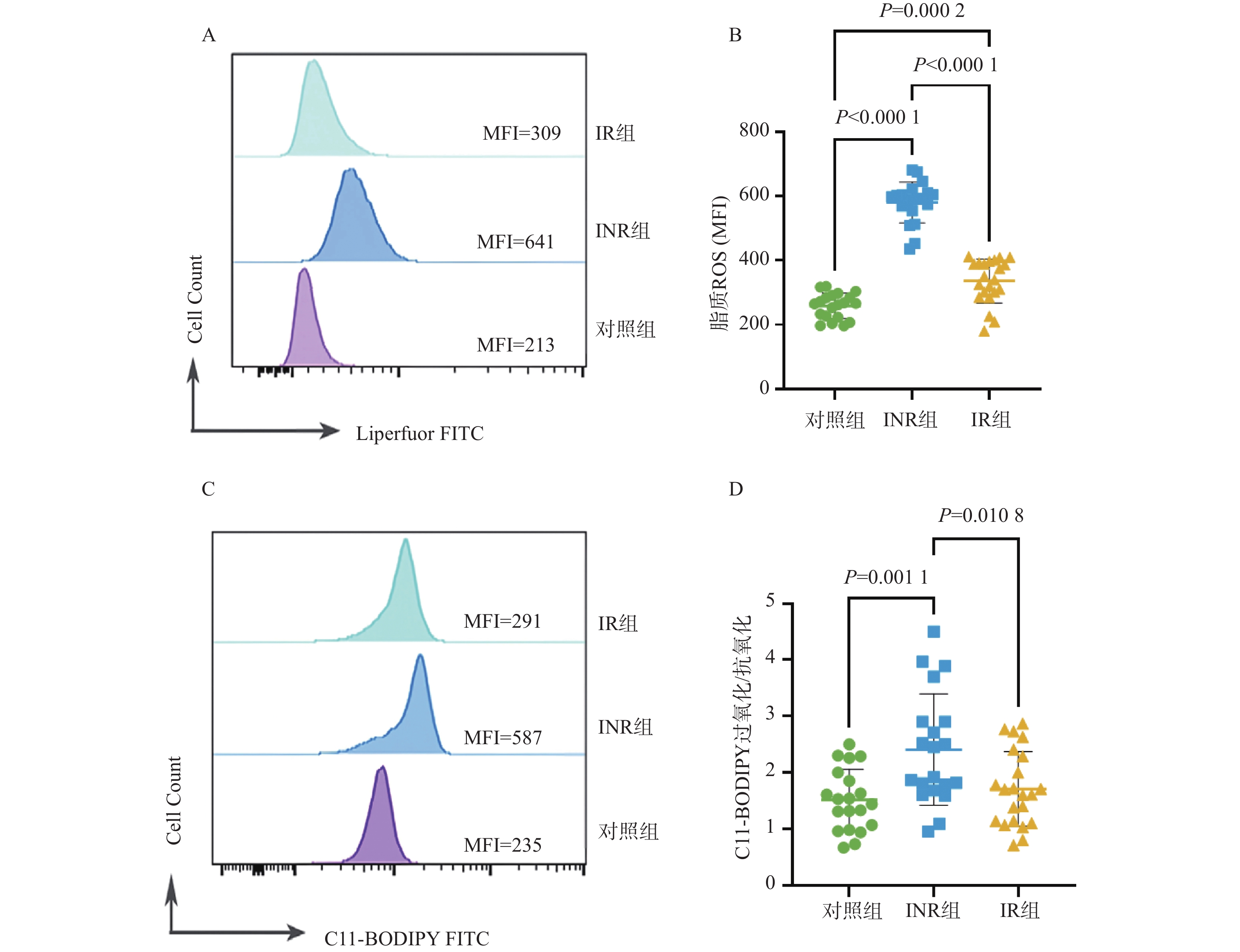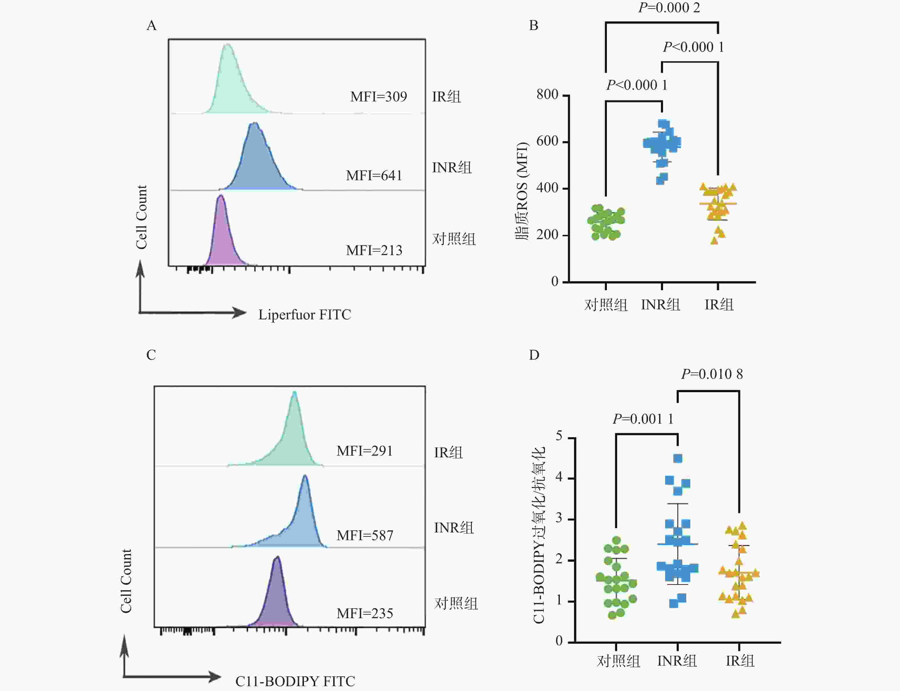 目的 基于线粒体功能障碍探讨菌群代谢产物对艾滋病免疫功能功能重建的影响。 方法 在2023年10月至2024年3月之间招募石家庄市第五医院42名接受4年抗逆转录病毒治疗(antiretroviral therapy,ART)的HIV感染者,包括20名免疫无应答者(immune non-responders,INR)、22名应答者(immune responder,IR)。同时,选择20名性别和年龄匹配的无感染男男性接触者作为对照组,他们的HIV、乙型或丙型肝炎病毒感染均为阴性。采用流式细胞术分析免疫参数。采用游离脂肪酸荧光测定试剂盒和铁比色测定试剂盒测定血浆中游离脂肪酸(free fatty acid,FFA)和亚铁(Fe2+)水平。 结果 INR组患者的CD4+ T细胞、CD4+CD45RA+ T细胞和CD4+CD45RA+CD31+ T细胞百分比低于对照组和IR组(P < 0.05)。与IR组相比,INR组CD4+T细胞的JC-1比值、脂质反应性氧簇(reactive oxygen species,ROS)水平及C11-BODIPY过氧化/抗氧化升高(P < 0.05)。IR组CD4+T细胞的脂质ROS水平高于对照组(P < 0.05)。INR组患者外周血FFA水平和Fe2+水平高于对照组和IR组(P < 0.05),CD4+CD36+ T细胞百分比低于对照组和IR组(P < 0.05),而对照组和IR组之间的差异无统计学意义。 结论 菌群代谢产物FFA升高伴随着CD4+ T细胞上的CD36受体表达降低,导致线粒体功能障碍的发生。 Abstract:objective To explore the effect of microbial metabolites on immune function reconstruction of AIDS based on mitochondrial dysfunction. Methods From October 2023 to March 2024, 42 HIV-infected people who received antiretroviral therapy (ART) for 4 years were recruited, including 20 immune non-responders (INR) and 22 responders (IR). At the same time, 20 non-infected MSM matched by sex and age were selected as the control group, and their HIV, hepatitis B or hepatitis C virus infection were all negative. The immune parameters were analyzed by flow cytometry. The levels of free fatty acid (FFA) and ferrous (Fe2+) in plasma were determined by fluorescence assay kit and iron colorimetric assay kit. Results The percentages of CD4+ T cells, CD4+CD45RA+ T cells and CD4+CD45RA+CD31+ T cells in INR group were lower than those in control group and IR group (P < 0.05). Compared with IR group, the JC-1 ratio of CD4+ T cells, the level of reactive oxygen species (ROS) and the peroxidation/antioxidation of C11-BODIPY in INR group increased (P < 0.05). The lipid ROS level of CD4+ T cells in IR group was higher than that in control group (P < 0.05). The FFA level and Fe2+ level in peripheral blood of patients in INR group were higher than those in control group and IR group (P < 0.05), and the percentage of CD4+CD36+ T cells was lower than that in control group and IR group (P < 0.05), but there was no significant difference between control group and IR group. Conclusion The increase of FFA, a metabolite of flora, is accompanied by the decrease of CD36 receptor expression on CD4+ T cells, leading to mitochondrial dysfunction. -