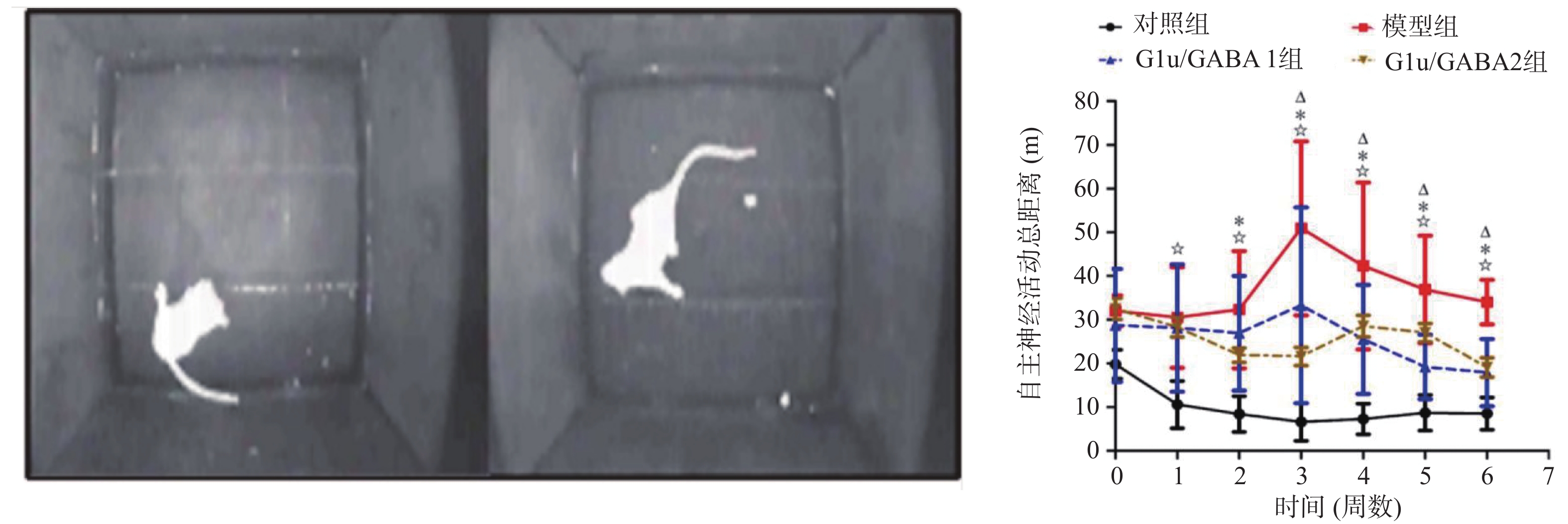 Abstract:Objective To investigate the mechanism by which Glu/GABA regulation of neurotransmitter balance improves behavioral abnormalities in a rat model of Tourette syndrome (TS). Methods Forty-eight SPF-grade SD rats were randomly divided into four groups: normal control group, model group, Glu/GABA 1 group (10 mg/kg) and Glu/GABA 2 group (20 mg/kg), with 12 rats in each group. Except for the normal control group, the remaining rats received intraperitoneal injections of 250 mg/(kg·d) IDPN for 7 consecutive days to establish TS model. After successful model establishment, each group received gavage intervention for 6 weeks. Stereotyped behavior scores were assessed using blinded methods before intervention, at week 3, and week 6. Total spontaneous activity distance was detected using a video activity monitoring system. After intervention, brain tissue was harvested for HE staining to count neurons in the cortex, striatum, and thalamus, and transmission electron microscopy was used to observe myelin morphology. HPLC was used to detect Glu and GABA levels in brain tissues; immunofluorescence was used to determine their fluorescence intensity, so as to explore the effect of Glu/GABA on TS model rats. Results Stereotyped behavior scores and total spontaneous activity distance in the model group and Glu/GABA intervention groups were significantly higher than in the normal control group (P < 0.05). After 6 weeks of intervention, stereotyped behavior scores and total spontaneous activity distance in Glu/GABA groups 1 and 2 were significantly reduced compared to the model group (P < 0.001), with no statistical difference between the two intervention groups (P > 0.05). Neuron counts in the cortex, striatum, and thalamus of the model group decreased, with myelin lamellae loosening and axonal damage. After Glu/GABA intervention, neuron counts recovered (P < 0.01) and myelin structure improved. Compared with normal group, the model group showed significantly elevated brain Glu levels and fluorescence intensity, and significantly decreased GABA(P < 0.01). Glu/GABA intervention reversed these changes (P < 0.01). Conclusion Glu/GABA effectively reduces stereotyped behavior scores and spontaneous activity distance in TS model rats, repairs neuronal damage and myelin abnormalities in the cortex, striatum, and thalamus, and regulates brain Glu and GABA levels to normal balanced states, thereby exerting therapeutic effects on TS. -