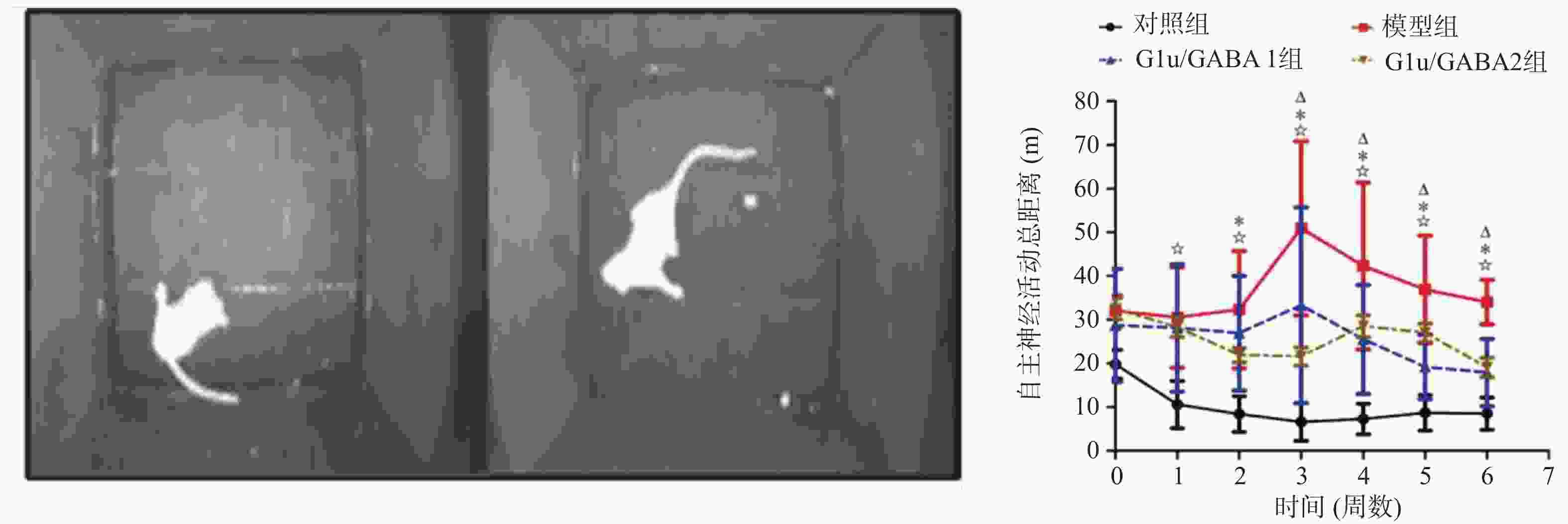目的 基于Glu/GABA调节神经递质平衡改善抽动秽语综合征(Tourette syndrome,TS)大鼠模型行为异常的机制研究。 方法 选用 48 只 SPF 级 SD 大鼠,随机分为正常对照组、模型组、Glu/GABA 1 组(10 mg/kg)和 Glu/GABA 2 组(20 mg/kg),每组 12 只。除正常对照组外,其余大鼠腹腔注射 250 mg/(kg·d)IDPN 连续 7 d建立 TS 模型,造模成功后各组灌胃干预 6 周。分别于干预前、第 3 周、第 6 周采用盲法进行刻板行为评分,通过自发活动视频系统检测自主活动总距离。干预结束后取材,HE 染色计数皮层、纹状体、丘脑神经元数量,透射电镜观察髓鞘形态;高效液相色谱法检测脑组织 Glu 和 GABA 水平,免疫荧光法测定其荧光强度,以探究 Glu/GABA 对 TS 模型大鼠的影响。 结果 模型组及 Glu/GABA 干预组大鼠刻板行为评分、自主活动总距离均显著高于正常对照组(P < 0.05)。干预 6 周后,Glu/GABA 1 组和 2 组刻板行为评分、自主活动总距离较模型组显著降低(P < 0.001),且两组间无统计学差异(P > 0.05)。模型组皮层、纹状体、丘脑神经元数量减少,髓鞘板层疏松、轴突破坏;Glu/GABA 干预后神经元数量恢复(P < 0.01),髓鞘结构改善。与正常组相比,模型组脑内 Glu 水平及荧光强度显著升高、GABA 显著降低(P < 0.01);Glu/GABA 干预可逆转上述变化(P < 0.01)。 结论 Glu/GABA可有效降低TS模型大鼠刻板行为评分和自主活动距离,修复皮层、纹状体及丘脑的神经元损伤与髓鞘异常,调节脑内Glu和GABA水平至正常平衡状态,发挥对TS的治疗作用。 -