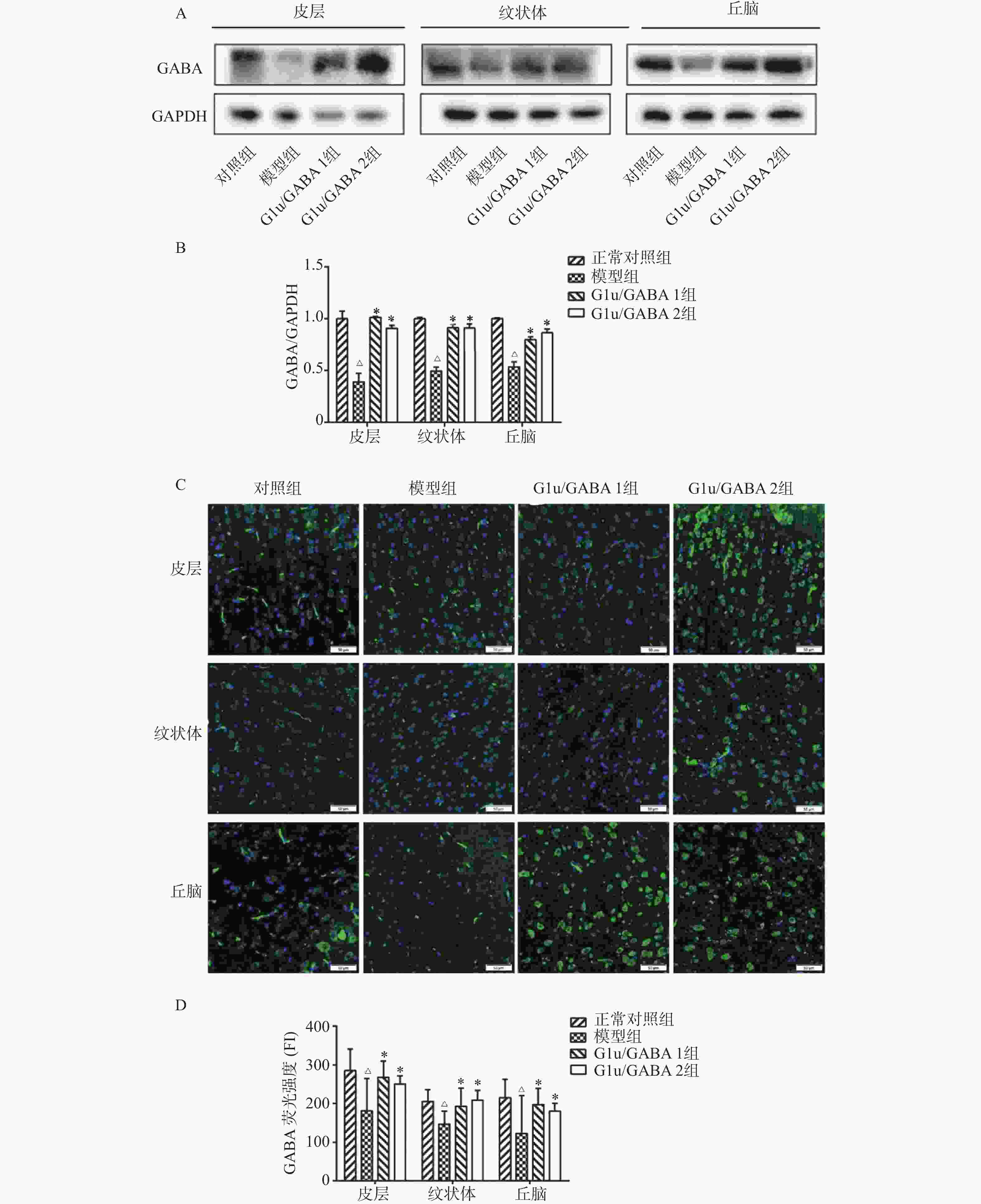 组别 神经元数量的相对水平(皮层) 神经元数量的相对水平(纹状体) 神经元数量的相对水平(丘脑) 对照组 1.00 ± 0.05 1.00 ± 0.06 1.00 ± 0.04 模型组 0.70 ± 0.08△ 0.55 ± 0.07△ 0.60 ± 0.06△ Glu/GABA 1组 1.10 ± 0.06* 0.80 ± 0.05* 1.10 ± 0.07* Glu/GABA 2组 1.00 ± 0.05* 0.95 ± 0.04* 1.00 ± 0.05* F 28.65 35.28 25.83 P <0.001 <0.001 <0.001 与对照组相比,△P < 0.001;与模型组相比,*P < 0.001 。 -