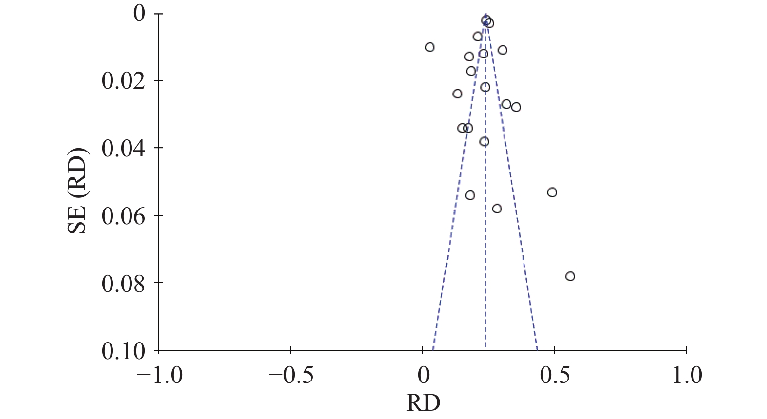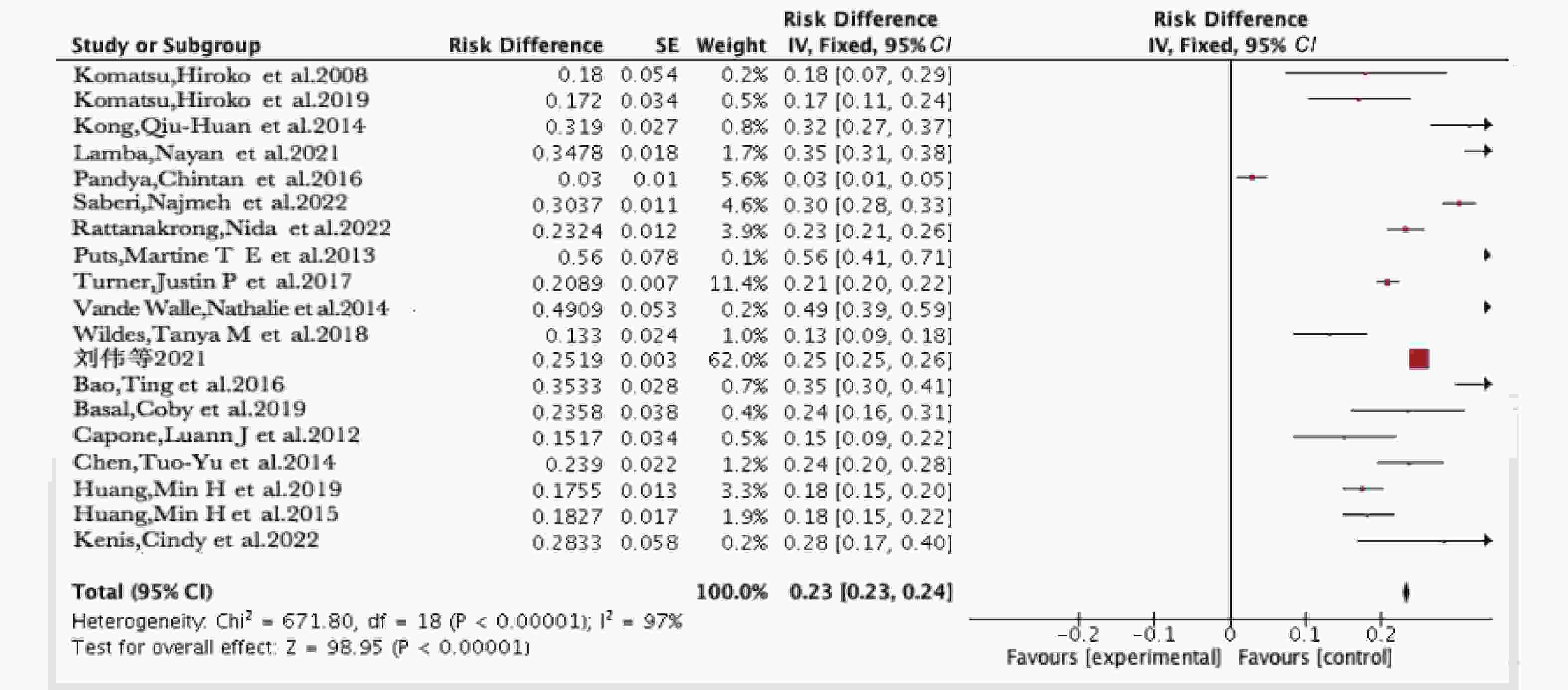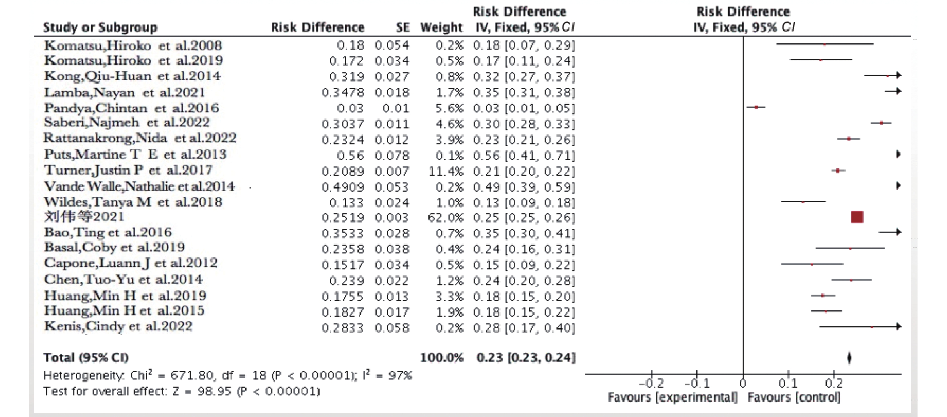 纳入文献 发表年份 研究类型 国家 样本量 跌倒发生率 影响因素 NOS/AHRQ评分 Komatsu,Hiroko等[6] 2018年 横断面研究 日本 50 0.180 abechr 7 Argyriou,Andreas A等[7] 2020年 队列研究 希腊 122 0.172 bip 6 Bao,Ting等[8] 2016年 横断面研究 美国 296 0.319 p 9 Capone,Luann J等[3] 2012年 病例对照 美国 286 0.030 bfijlnouvwy 6 Chen,Tuo-Yu等[9] 2014年 病例对照 美国 1640 0.303 oy 7 Huang,Min H等[10] 2019年 队列研究 美国 1097 0.233 acdfjmprsy 9 Huang,Min H等[11] 2015年 队列研究 美国 41 0.560 bijmt 8 Kenis,Cindy等[12] 2022年 病例对照 比利时 3681 0.209 bdfgikoqstxz 9 Komatsu,Hiroko等[4] 2019年 横断面研究 日本 88 0.491 aech 9 Kong,Qiu-Huan等[13] 2014年 队列研究 中国 203 0.133 bfhnsxyz 6 Lamba,Nayan等[14] 2021年 病例对照 美国 42759 0.241 bdi 7 Pandya,Chintan等[15] 2016年 横断面研究 美国 17958 0.252 abecdijprsz 11 Saberi,Najmeh等[16] 2022年 横断面研究 伊朗 300 0.353 bedghijm 8 Rattanakrong,Nida等[17] 2022年 队列研究 泰国 123 0.236 lmp 9 Puts,Martine T E等[18] 2013年 队列研究 加拿大 112 0.152 bdhijsz 7 Turner,Justin P等[19] 2017年 横断面研究 澳大利亚 385 0.239 btuvz 7 Vande Walle,Nathalie等[20] 2014年 队列研究 比利时 809 0.176 bdfkoqrstxz 8 Wildes,Tanya M等[21] 2018年 横断面研究 美国 498 0.183 stw 8 刘伟等[22] 2021年 队列研究 中国 60 0.283 m 8 影响因素:a:年龄;b:性别;c:文化程度;d:居住情况;e:工作情况;f:跌倒史;g:跌倒恐惧;h:肿瘤分期;i:肿瘤分类;j:肿瘤治疗方式;k:营养状况;l:体重;m:BMI;n:发热;o:疼痛;p:周围神经病变;q:疲乏;r:抑郁;s:共病;t:多重用药;u:抗抑郁药;v:抗精神病药;w:镇静催眠药;x:认知功能;y: 平衡与步态;z:日常生活能力。 表 2 成人肿瘤患者跌倒影响因素Meta分析结果