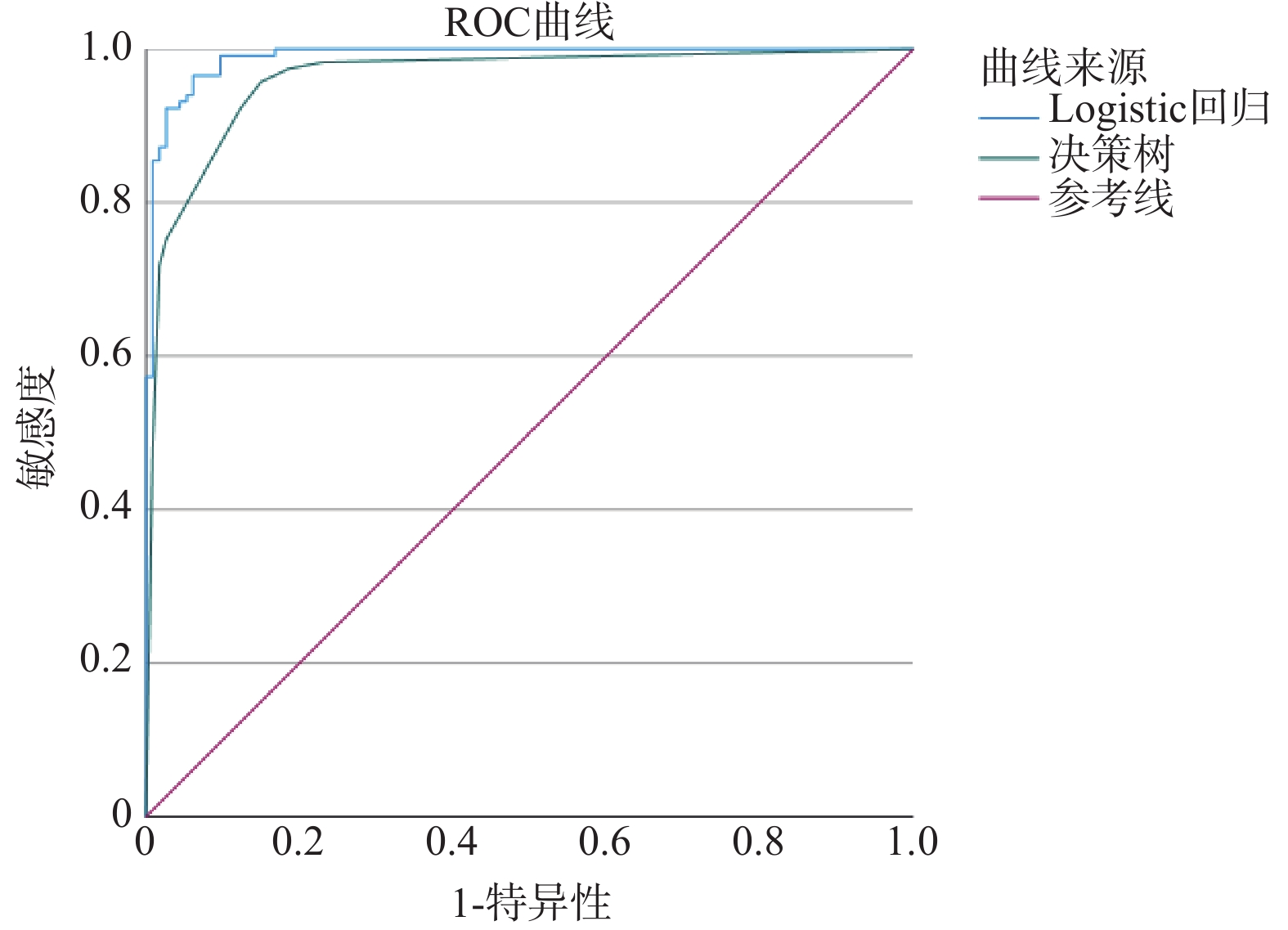 目的 采用Logistic回归与决策树模型预测高血压人群原发性醛固酮增多症(primary aldosteronism,PA)的危险因素。 方法 实验组为2024年1月至11月期间在云南省阜外心血管病医院确诊为PA的患者118例,对照组为同期经过继发性高血压筛查后确诊为原发性高血压的患者113例,建立Logistic回归与决策树预测模型,用受试者工作特征(receiver operating characteristic,ROC)曲线评价两种模型的预测效果。 结果 Logistic回归预测模型为:Logit(P) = 2.162×合并阻塞性睡眠呼吸暂停低通气综合征(obstructive sleep apnea hypopnea syndrome,OSAHS) − 0.145×年龄−2.140×血钾+0.429×血浆醛固酮浓度(卧位)−1.591×直接肾素浓度(卧位)+0.435× 血浆醛固酮浓度(立位)−0.150× 直接肾素浓度(立位);决策树分析筛选出4个风险变量,与PA相关的因素依次为醛固酮/肾素比值(aldosterone to renin concentration ratio,ARR)(立位)(P < 0.001)、血浆醛固酮浓度(立位)(P = 0.001)、合并OSAHS(P = 0.001)、血浆醛固酮浓度(卧位)(P = 0.036)。 结论 结合Logistic 回归和决策树模型预测,合并OSAHS、血浆醛固酮浓度(立位)、血浆醛固酮浓度(卧位)均可列为PA的独立危险因素;年龄、血钾、直接肾素浓度(卧位)、直接肾素浓度(立位)为保护因素。对于合并OSAHS、血浆醛固酮浓度(卧位) > 10.200 ng/dL的人群,可将 ARR切入点设置为3.300 (ng/dL)/(μIU/mL),以降低临床PA的漏诊率。 -