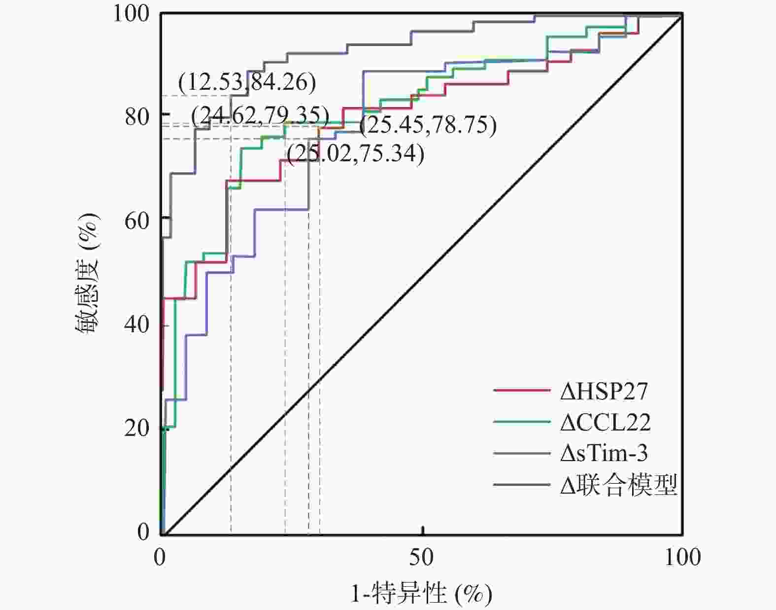指标 敏感度(%) 特异度(%) 准确度(%) AUC 95%CI Youden指数 最佳截断值 △HSP27 78.75 74.55 77.36 0.811 0.742~0.879 0.551 0.92 ng/mL △CCL22 79.35 75.38 77.14 0.823 0.755~0.890 0.583 67.38 pg/mL △sTim-3 75.34 74.98 73.82 0.799 0.728~0.870 0.515 56.24 pg/mL 三者联合模型 84.26 87.47 86.21 0.925 0.884~0.966 0.780 0.436 -
