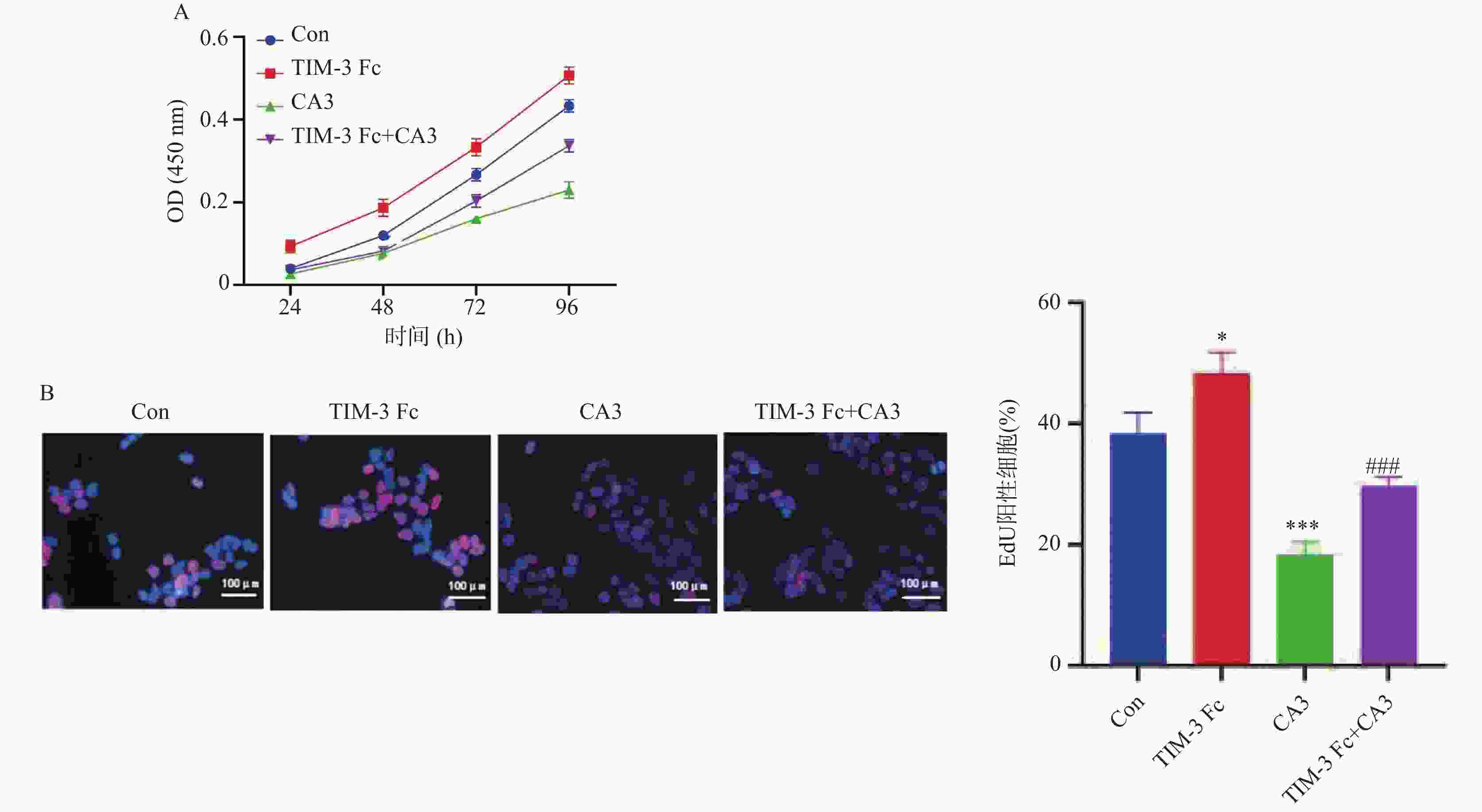 A:CCK-8分析不同时间点HTR-8/SVneo细胞的活力;B:EdU分析HTR-8/SVneo细胞的增殖能力;与Con组相比,*P < 0.05、***P < 0.001;与TIM-3 Fc组相比,##P < 0.01、###P < 0.001。