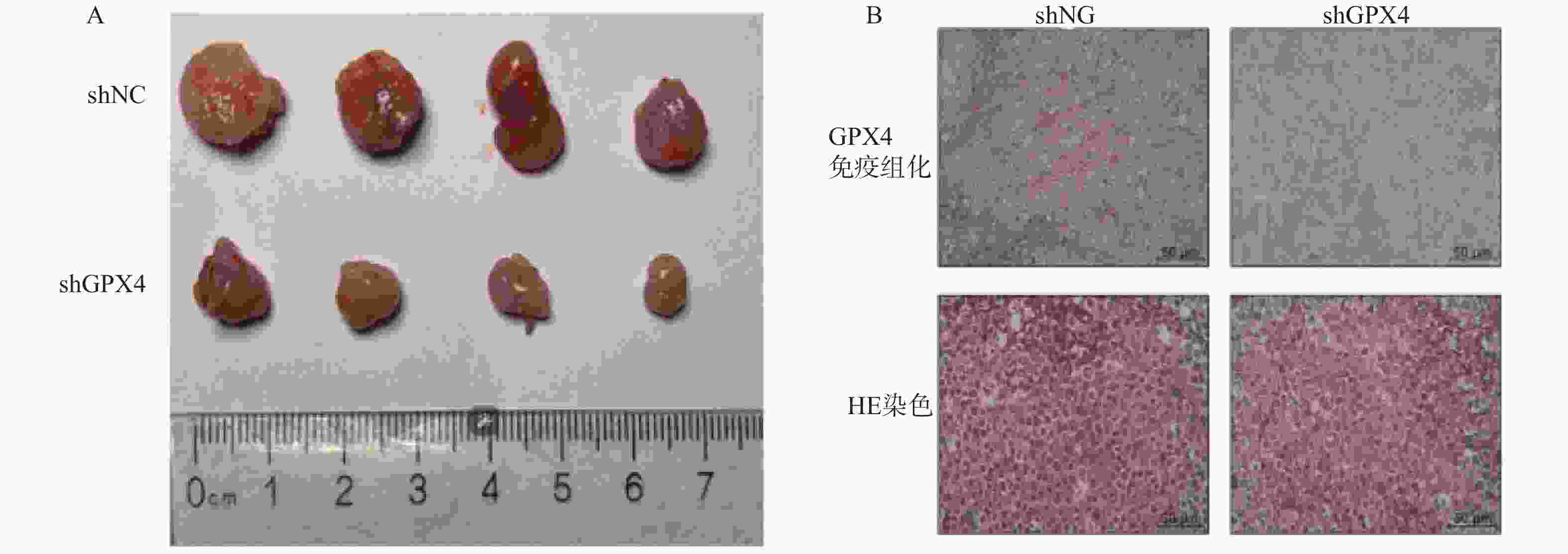 目的 探讨谷胱甘肽过氧化物酶4(glutathione peroxidase 4,GPX4)表达促进铁死亡参与子宫内膜癌(endometrial carcinoma,EC)恶性行为的机制。 方法 通过定量实时聚合酶链反应(quantitative polymerase chain reaction,qPCR)、 蛋白印迹和免疫组化(immunohistochemistry,IHC) 测定 EC 组织中 GPX4 的表达。培养KLE细胞,分为shNC组(n = 6)和shGPX4组(n = 6), Transwell、克隆形成测定和流式细胞研究了 GPX4 对 EC 细胞增殖、迁移、细胞凋亡的影响。检测细胞内 Fe2+、活性氧(reactive oxygen Species,ROS)和丙二醛(malondialdehyde,MDA)水平,JC染色检测线粒体膜电位(mitochondrial membrane Potential,MMP),GPX4 酶活性试剂盒检测酶活性,ELISA 法检测脂质过氧化物 4 - 羟基壬烯醛(4-Hydroxynonenal,4-HNE)含量,蛋白印迹检测铁死亡关键蛋白酰基辅酶A合成酶长链家族成员4(acyl-coa synthetase long chain family member 4,ACSL4)和溶质载体家族7成员11(solute Carrier family 7 member 11,SLC7A11)的表达;建立了裸鼠 EC 异种移植肿瘤模型,分为 shNC 组(n = 6)和 shGPX4 组(n = 6),通过检测其重量体积、重量、Fe2+和 MDA 水平评价 GPX4 敲低在体内的效果。 结果 GPX4 在 EC 组织及细胞系中高表达(EC 组织 GPX4 mRNA:118.1±6.92 vs 癌旁 62.72±5.20,t = 15.68,P < 0.001,Cohen's d=8.62);与 shNC 组相比,shGPX4 组 KLE 细胞增殖(克隆数:0.37±0.05 vs 0.89±0.07,t = 14.94,P < 0.001)、迁移能力显著降低,凋亡率升高(61.64±7.03% vs 12.60±2.48%,t = 16.12,P < 0.001),细胞内 Fe2+、脂质 ROS、MDA、4-HNE 水平升高,GSH 及 GPX4 酶活性降低,MMP 破坏,ACSL4 表达上调、SLC7A11 下调(均 P < 0.001);裸鼠模型中,shGPX4 组肿瘤体积(0.36±0.07 vs 0.87±0.12 cm3,t = 9.07,P < 0.001)、重量显著减小,肿瘤组织铁含量及 MDA 水平升高(均 P < 0.001)。 结论 研究表明GPX4 沉默能诱导铁死亡的发生,进而降低子宫内膜癌细胞的增殖和侵袭,为研究子宫内膜癌的潜在治疗策略提供了证据。 Abstract:Objective To investigate the mechanism by which Glutathione Peroxidase 4 (GPX4) expression promotes ferroptosis and participates in the malignant behavior of Endometrial Carcinoma (EC). Methods The expression of GPX4 in EC tissues was determined by quantitative real-time PCR (qPCR), Western blot, and immunohistochemistry (IHC). KLE cells were cultured and divided into an shNC group (n = 6) and an shGPX4 group (n = 6). The effects of GPX4 on EC cell proliferation, migration, and apoptosis were investigated using Transwell assay, colony formation assay, and flow cytometry. Intracellular Fe2+, reactive oxygen species (ROS), and malondialdehyde (MDA) levels were detected. Mitochondrial membrane potential (MMP) was measured by JC-1 staining. GPX4 enzyme activity was assessed with a commercial kit. The content of lipid peroxide 4-hydroxynonenal (4-HNE) was determined by ELISA; and the expression of key ferroptosis-related proteins, Acyl-CoA Synthetase Long Chain Family Member 4 (ACSL4) and Solute Carrier Family 7 Member 11 (SLC7A11), was analyzed by Western blot. A EC xenograft tumor model in nude mice was established and divided into an shNC group (n = 6) and an shGPX4 group (n = 6). The in vivo effect of GPX4 knockdown was evaluated by measuring tumor volume, weight, and levels of Fe2+ and MDA. Results GPX4 was highly expressed in EC tissues and cell lines (GPX4 mRNA in EC tissues: 118.1±6.92 vs. 62.72±5.20 in adjacent normal tissues, t = 15.68, P < 0.001, Cohen’s d=8.62).Compared with the shNC group, the shGPX4 group showed significantly decreased KLE cell proliferation (colony number: 0.37±0.05 vs. 0.89±0.07, t = 14.94, P < 0.001) and migration capacity, along with an increased apoptosis rate (61.64±7.03% vs. 12.60±2.48%, t = 16.12, P < 0.001). Additionally, in the shGPX4 group, intracellular levels of Fe2+, lipid ROS, MDA, and 4-HNE were increased; GSH level and GPX4 enzyme activity were decreased; MMP was impaired; and the expression of ACSL4 was up-regulated while that of SLC7A11 was down-regulated (all P < 0.001).In the nude mouse model, the shGPX4 group showed significantly reduced tumor volume (0.36±0.07 vs. 0.87±0.12 cm3, t = 9.07, P < 0.001) and weight, along with increased iron content and MDA levels in tumor tissues (both P < 0.001). Conclusion The study demonstrates that GPX4 silencing can significantly induce ferroptosis, thereby reducing the proliferation and invasion of endometrial cancer cells, providing evidence for the study of potential treatment strategies for endometrial cancer. -