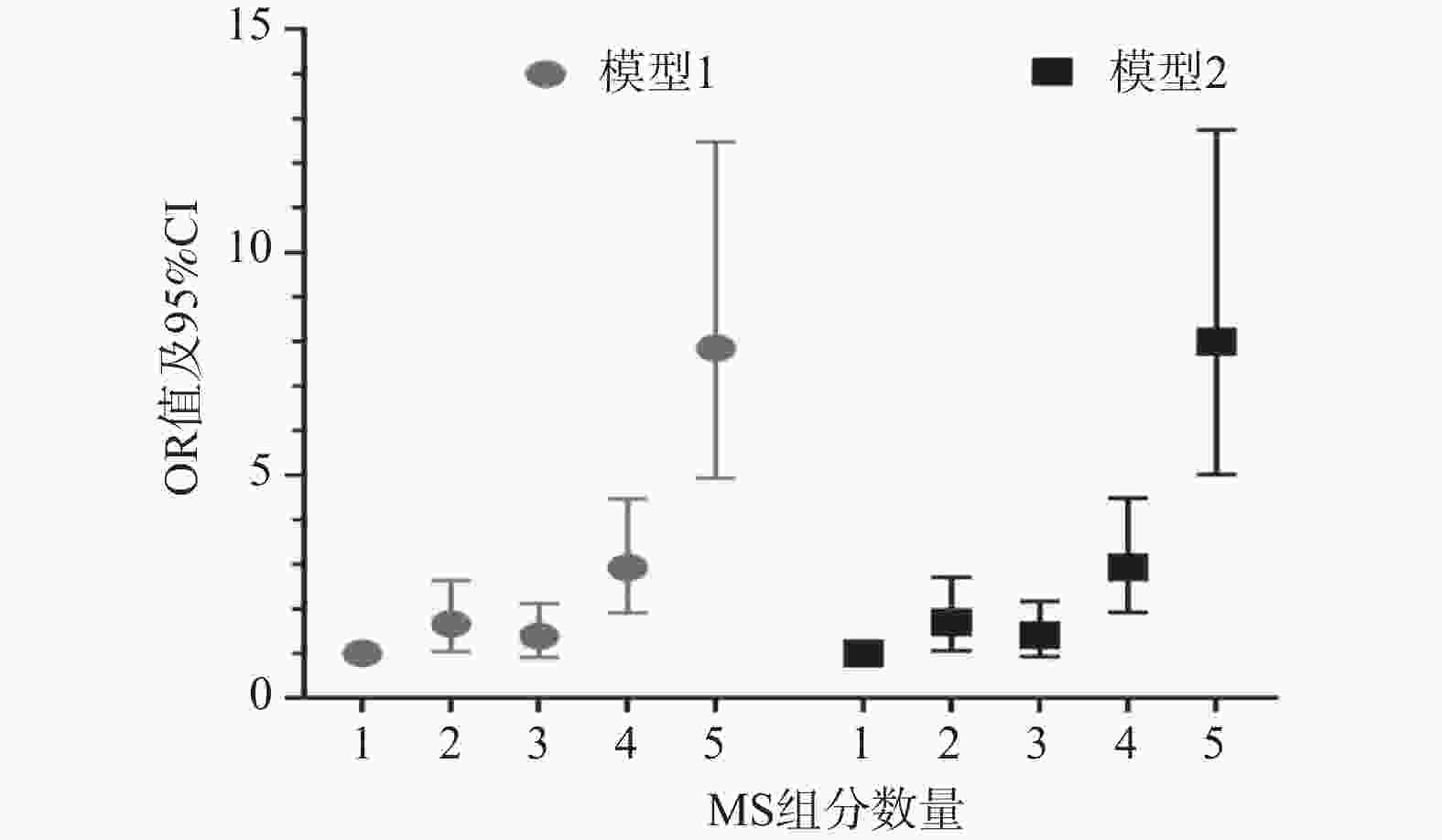 变量 男性 女性 DR P OR (95%CI) DR P OR (95%CI) 模型 1 组分(个) 1 28 (6.80) 1.000 3 (1.40) 1.000 2 59 (14.40) <0.05* 2.000 (1.191~3.358) 15 (7.20) 0.697 1.326 (0.321~5.488) 3 118 (28.70) <0.05* 1.699 (1.052~2.744) 42 (20.20) 0.514 1.563 (0.409~5.972) 4 121 (29.40) <0.001* 4.033 (2.423~6.713) 90 (43.30) 0.057 3.604 (0.962~13.498) 5 85 (20.70) <0.001* 14.841 (8.094~27.213) 58 (27.90) <0.05* 7.638 (1.978~29.491) 模型2 组分(个) 1 28 (6.80) 1.000 3 (1.40) 1.000 2 59 (14.40) <0.05* 1.982 (1.179~3.333) 15 (7.20) 0.624 1.438 (0.336~6.148) 3 118 (28.70) <0.05* 1.672 (1.034~2.705) 42 (20.20) 0.482 1.636 (0.415~6.456) 4 121 (29.40) <0.001* 3.925 (2.354~6.545) 90 (43.30) 0.059 3.670 (0.950~14.179) 5 85 (20.70) <0.001* 14.492 (7.893~26.609) 58 (27.90) <0.05* 7.992 (2.005~31.854) 男性:Model 1调整教育水平、抽烟、病程及BMI,Model 2在Model 1的基础上进一步调整HBA1C%、HOMA-IR。女性:Model 1调整教育水平、抽烟、饮酒、病程,Model 2在Model 1的基础上进一步调整HBA1C%;*P < 0.05。 -