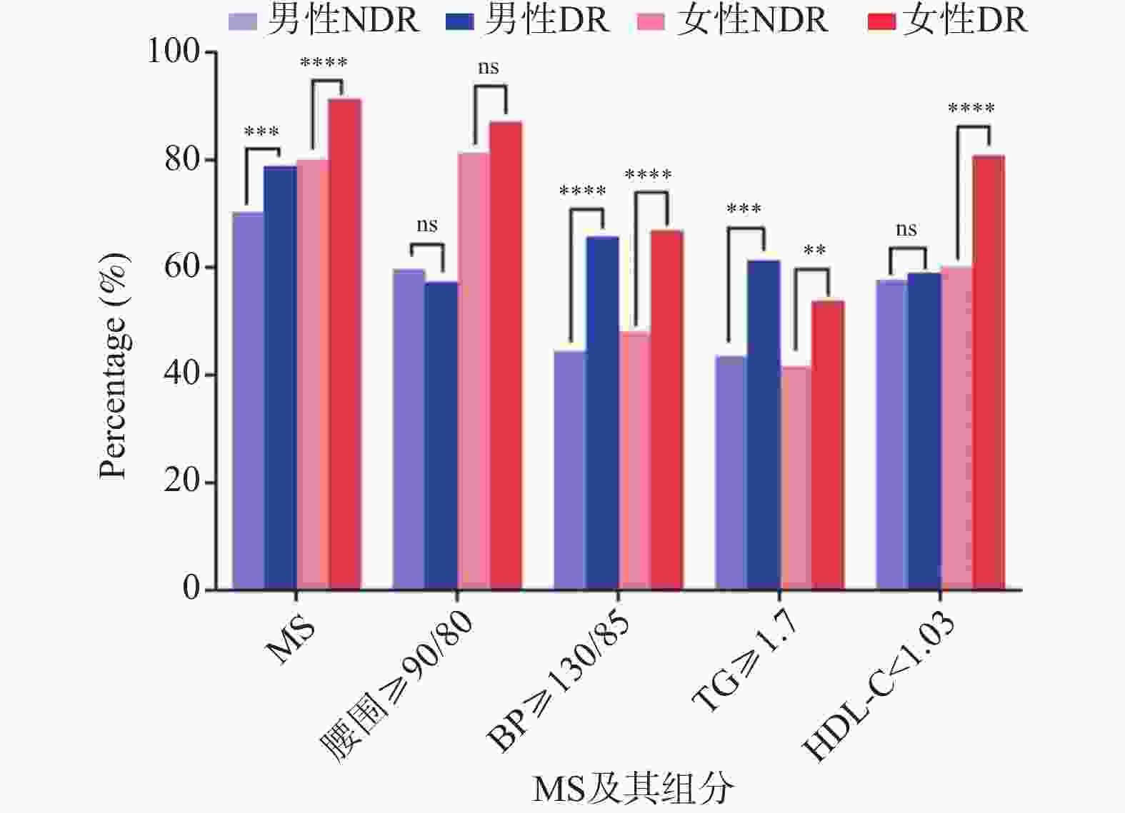 组别 NECP-ATP III Ⅲ CDS IDF JIS Kappa值 P 95%CI NDR 组 总体(n = 1591 )1176 (73.90)764 (48.00) 512 (32.18) 1226 (77.10)0.560 <0.001* 0.560~0.560 男(n = 999) 702 (70.27) 508 (50.90) 288 (28.80) 746 (74.70) 0.589 <0.001* 0.589~0.589 女(n = 592) 474 (80.07) 256 (43.20) 224 (37.80) 480 (81.10) 0.499 <0.001* 0.499~0.499 DR 组 总体(n = 619) 514 (83.00) 391 (63.20) 408 (65.90) 546 (88.20) 0.606 <0.001* 0.606~0.606 男(n = 411) 324 (78.80) 276 (44.60) 230 (37.20) 346 (55.90) 0.740 <0.001* 0.740~0.740 女(n = 208) 190 (91.40) 115 (55.30) 178 (85.60) 200 (58.50) 0.269 <0.001* 0.269~0.269 CDS:中华医学会糖尿病学分会;NECP-ATP Ⅲ:美国国家胆固醇教育计划成人治疗指南;IDF:国际糖尿病联盟;JIS:国际多学会联合声明。Kappa值<0.2:一致性程度低;0.2~0.4:一致性程度一般;0.4~0.6:一致性程度中等;0.6~0.8:一致性程度较高;0.8~1.0 :一致性程度非常高;*P < 0.05。 表 4 两组患者合并MS及其各组分的差异[n(%)]