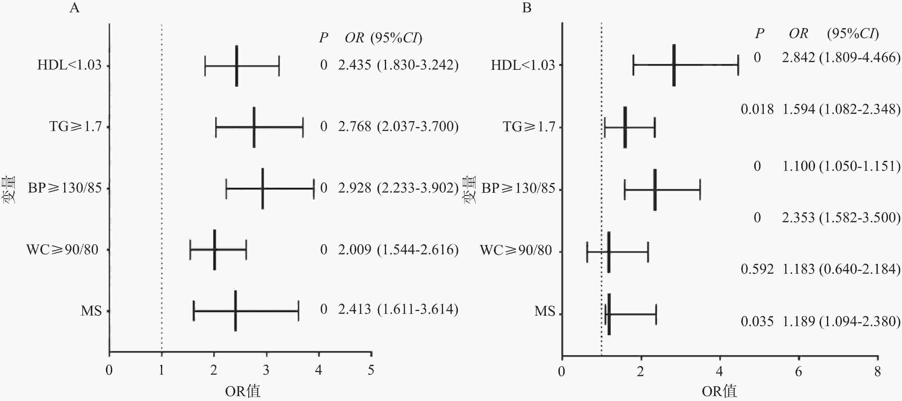变量 NDR (n = 1591 )DR (n = 619) χ2 P MS 20.606 <0.001* 否 415 (26.10) 105 (17.00) 是 1176 (73.90)514 (83.00) 腰围(cm) 0.048 0.826 <90/80 514 (32.30) 203 (32.80) ≥90/80 1077 (67.70)416 (67.20) 血压(mmHg) 72.739 <0.001* <130/85 861 (54.10) 210 (33.90) ≥130/85 730 (45.90) 409 (66.10) 甘油三酯 (mmol/L) 45.411 <0.001* <1.7 909 (57.10) 255 (41.20) ≥1.7 682 (42.90) 364 (58.80) 高密度脂蛋白胆固醇(mmol/L) 53.491 <0.001* ≥1.03 812 (51.00) 209 (33.80) <1.03 779 (49.00) 410 (66.20) 分类资料的组间差异性分析采用Chi-square检验;*P < 0.05。 表 5 MS及各组分与DR风险的多变量Logistic回归分析