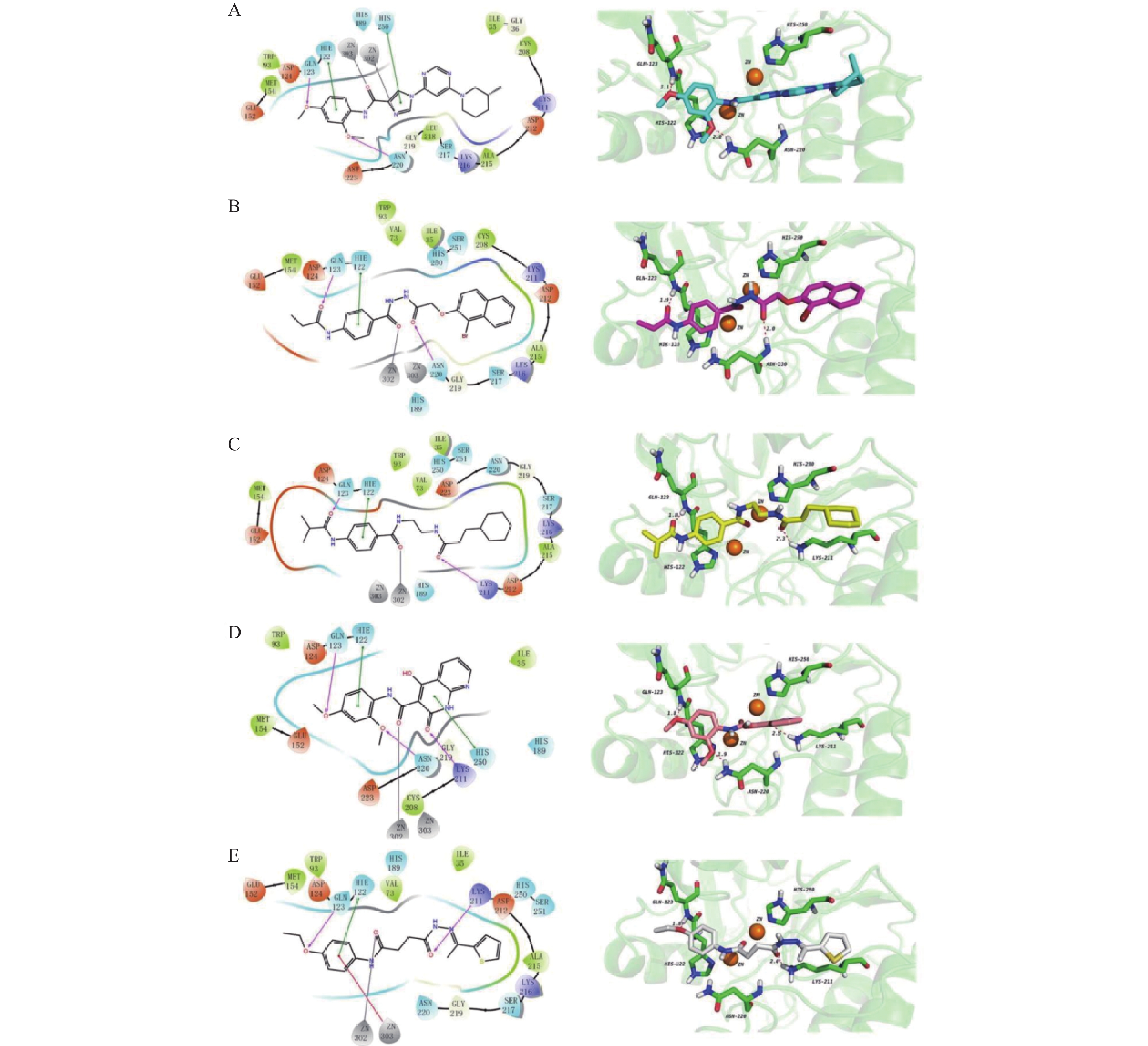 A: 化合物1和NDM-1蛋白结合模式的2D、3D作图;B: 化合物2和NDM-1蛋白结合模式的2D、3D作图;C: 化合物3和NDM-1蛋白结合模式的2D、3D作图;D: 化合物4和NDM-1蛋白结合模式的2D、3D作图;E: 化合物5和NDM-1蛋白结合模式的2D、3D作图.3D图中NDM-1蛋白绿色代表C骨架,蓝色代表N原子,大红色代表O原子,白色代表H原子,橘色代表锌离子,氢键-红色虚线,键长越长,氢键作用越弱。5个化合物中的stick依次为淡蓝色、玫红色、黄色、豆沙色、灰白色。