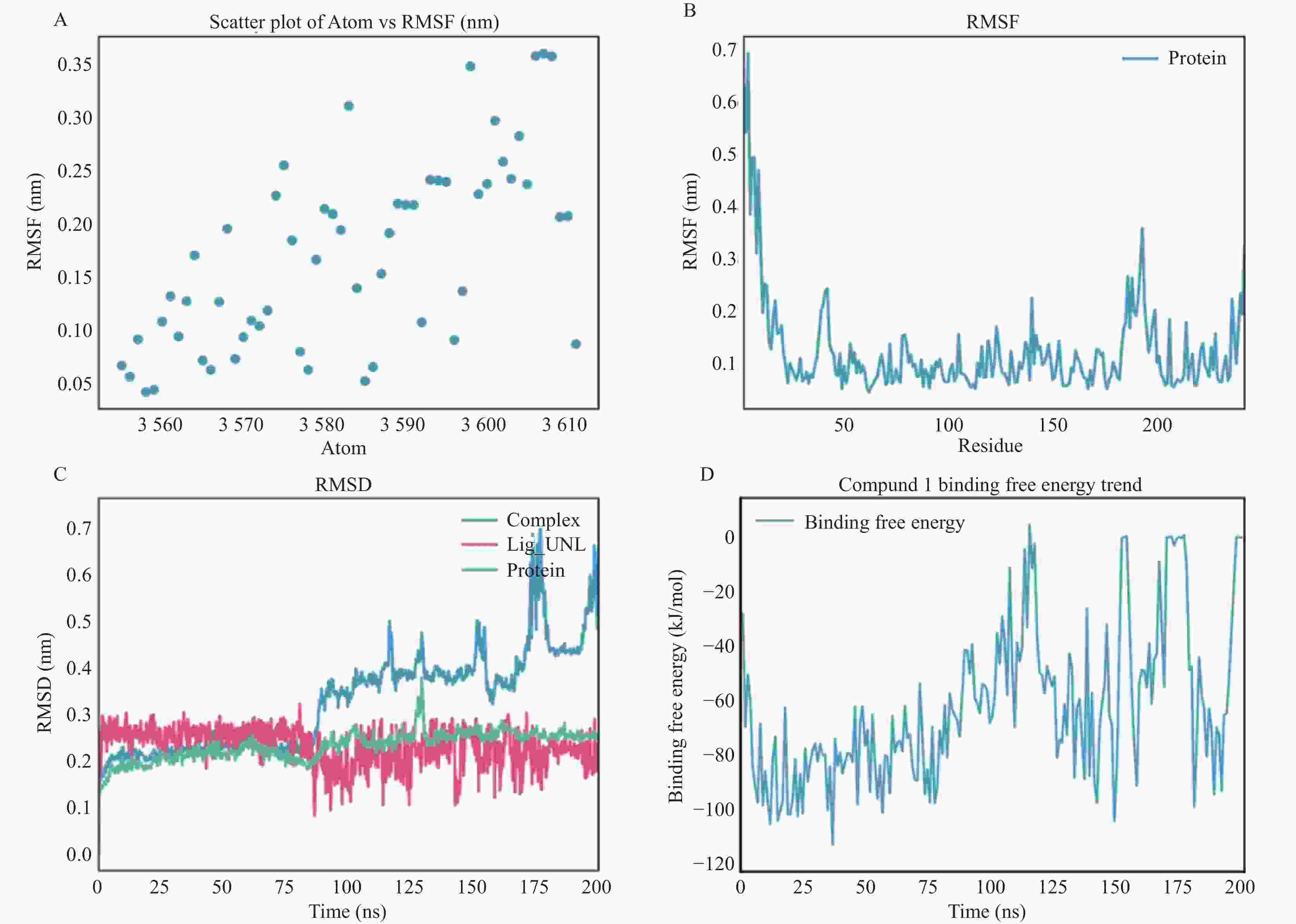 A: 原子编号与均方根波RMSF之间的散点图;B: NDM-1与化合物1结合后蛋白质残基的RMSF曲线;C: 蛋白质、配体及蛋白–配体复合物在分子动力学模拟过程中的均方根偏差随时间变化曲线;D: 化合物与蛋白结合自由能(kJ/mol)随模拟时间变化趋势图。