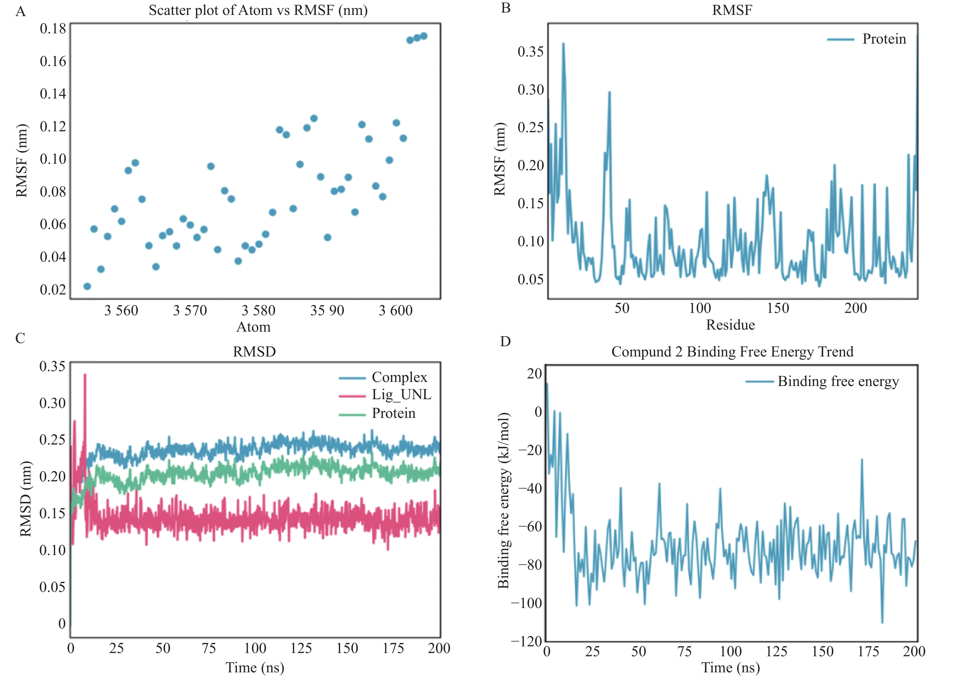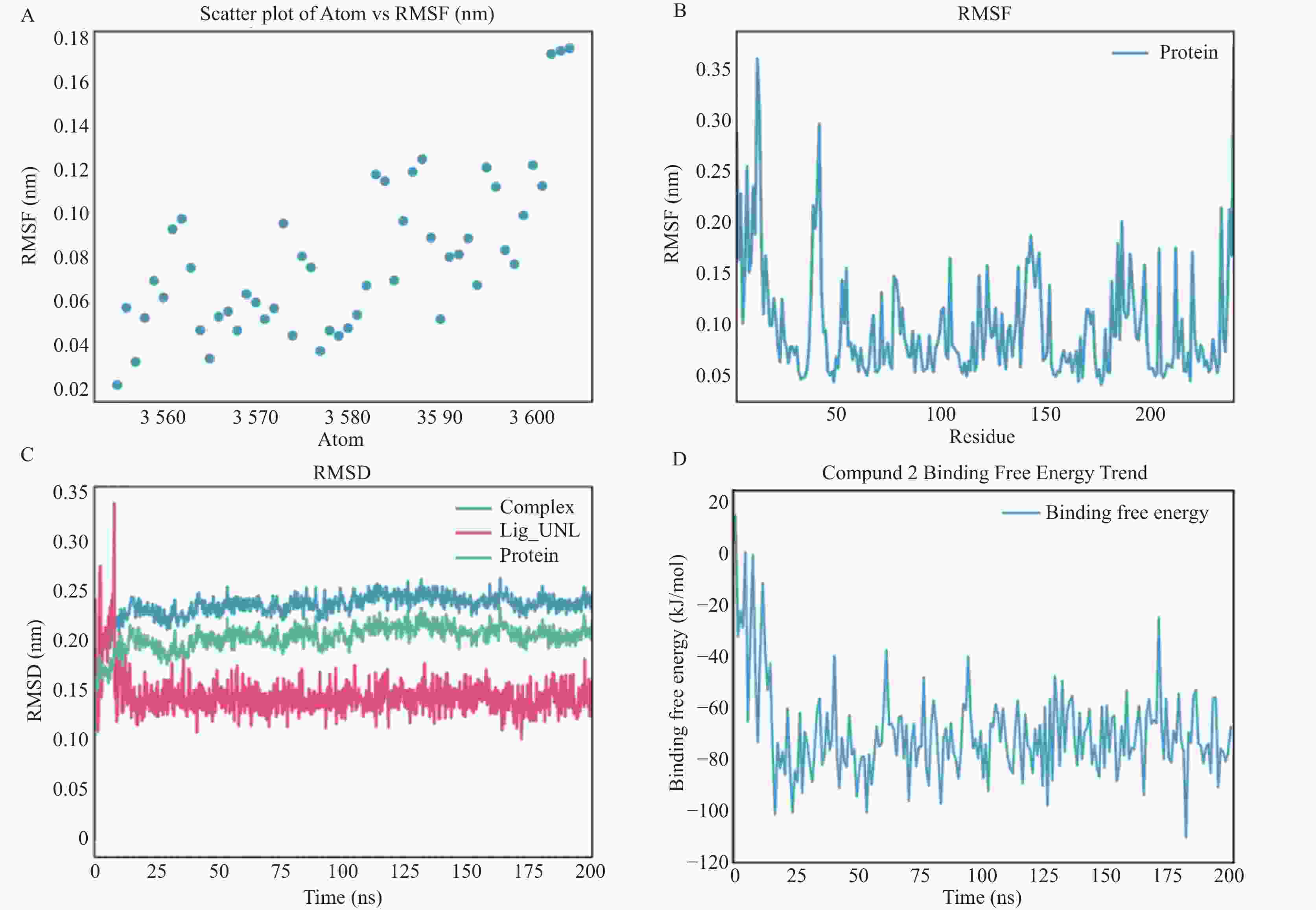 A: 原子编号与均方根波RMSF之间的散点图;B: NDM-1与化合物2结合后蛋白质残基的RMSF曲线;C: 蛋白质、配体及蛋白–配体复合物在分子动力学模拟过程中的均方根偏差随时间变化曲线;D: 化合物与蛋白结合自由能(kJ/mol)随模拟时间变化趋势图。