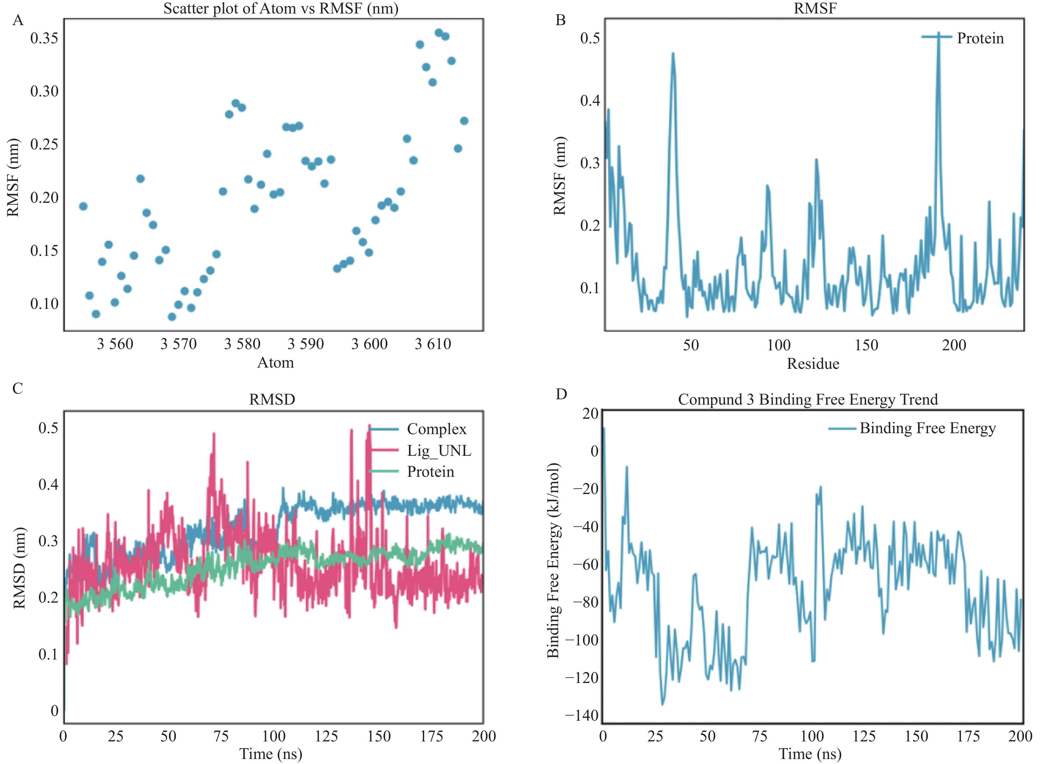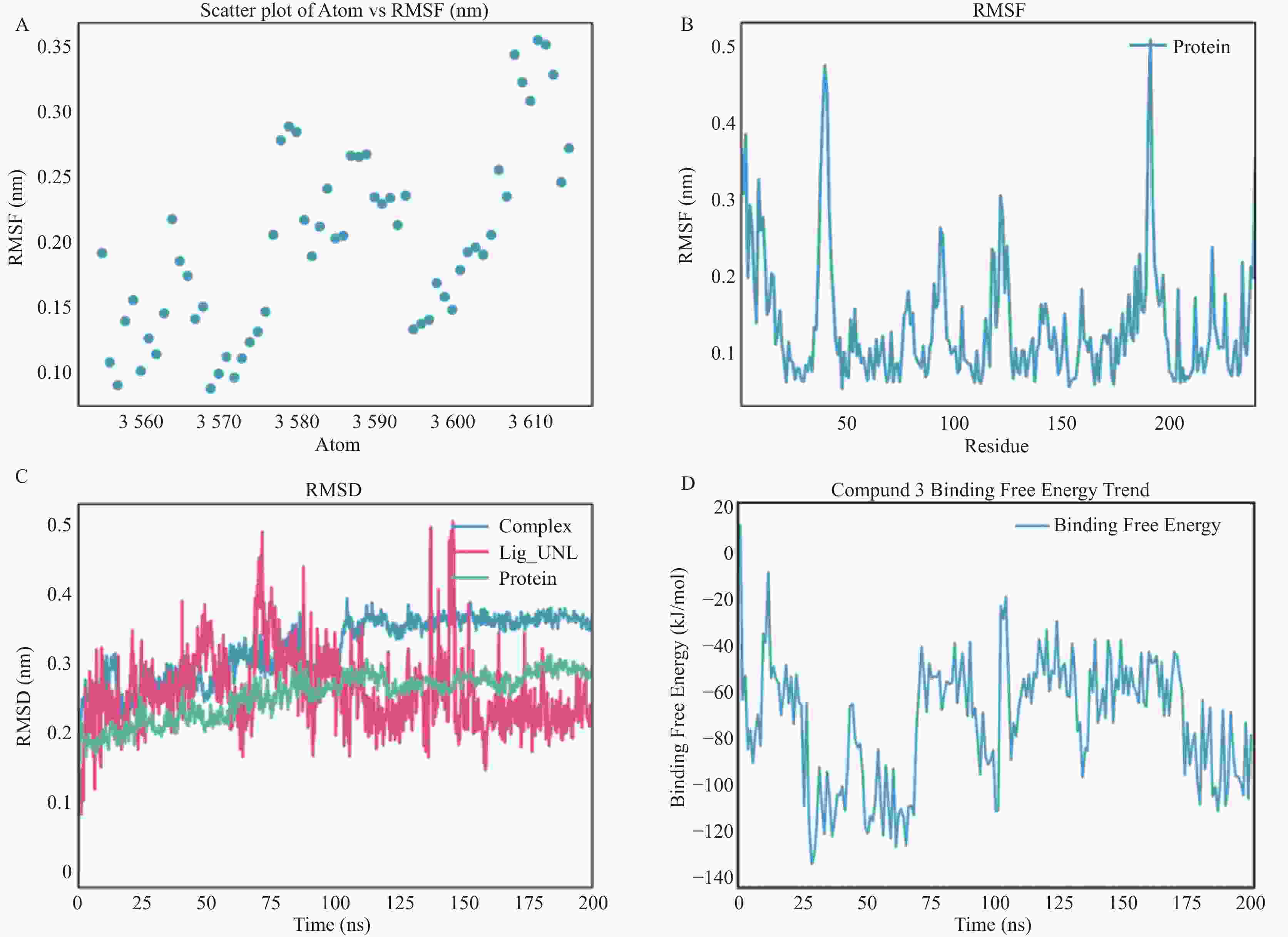 A: 原子编号与均方根波RMSF之间的散点图;B: NDM-1与化合物3结合后蛋白质残基的RMSF曲线;C: 蛋白质、配体及蛋白–配体复合物在分子动力学模拟过程中的均方根偏差随时间变化曲线;D: 化合物与蛋白结合自由能(kJ/mol)随模拟时间变化趋势图。