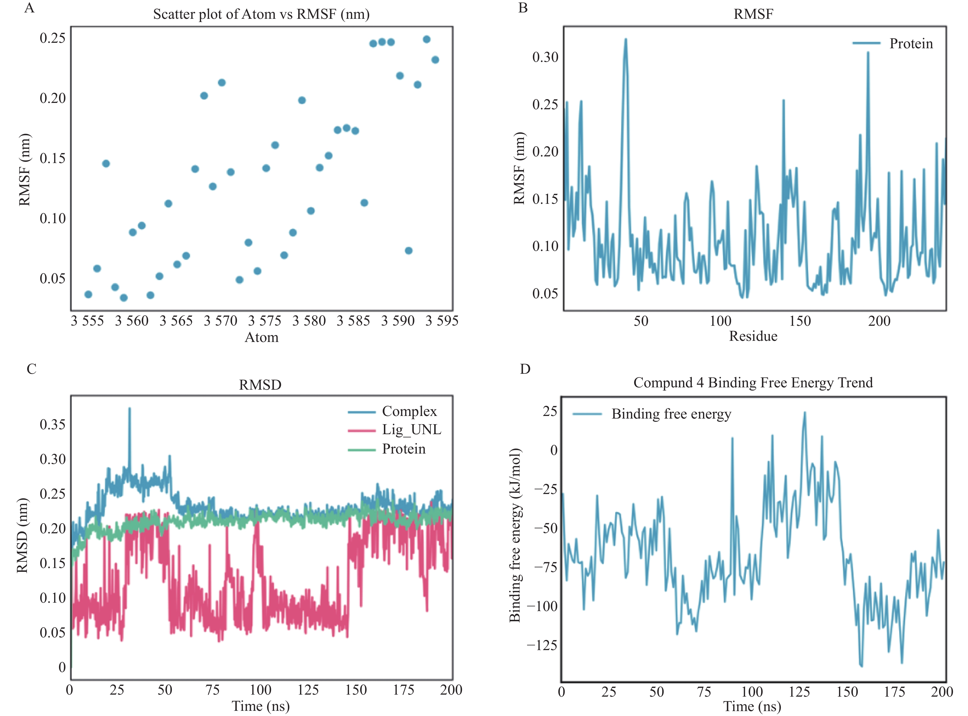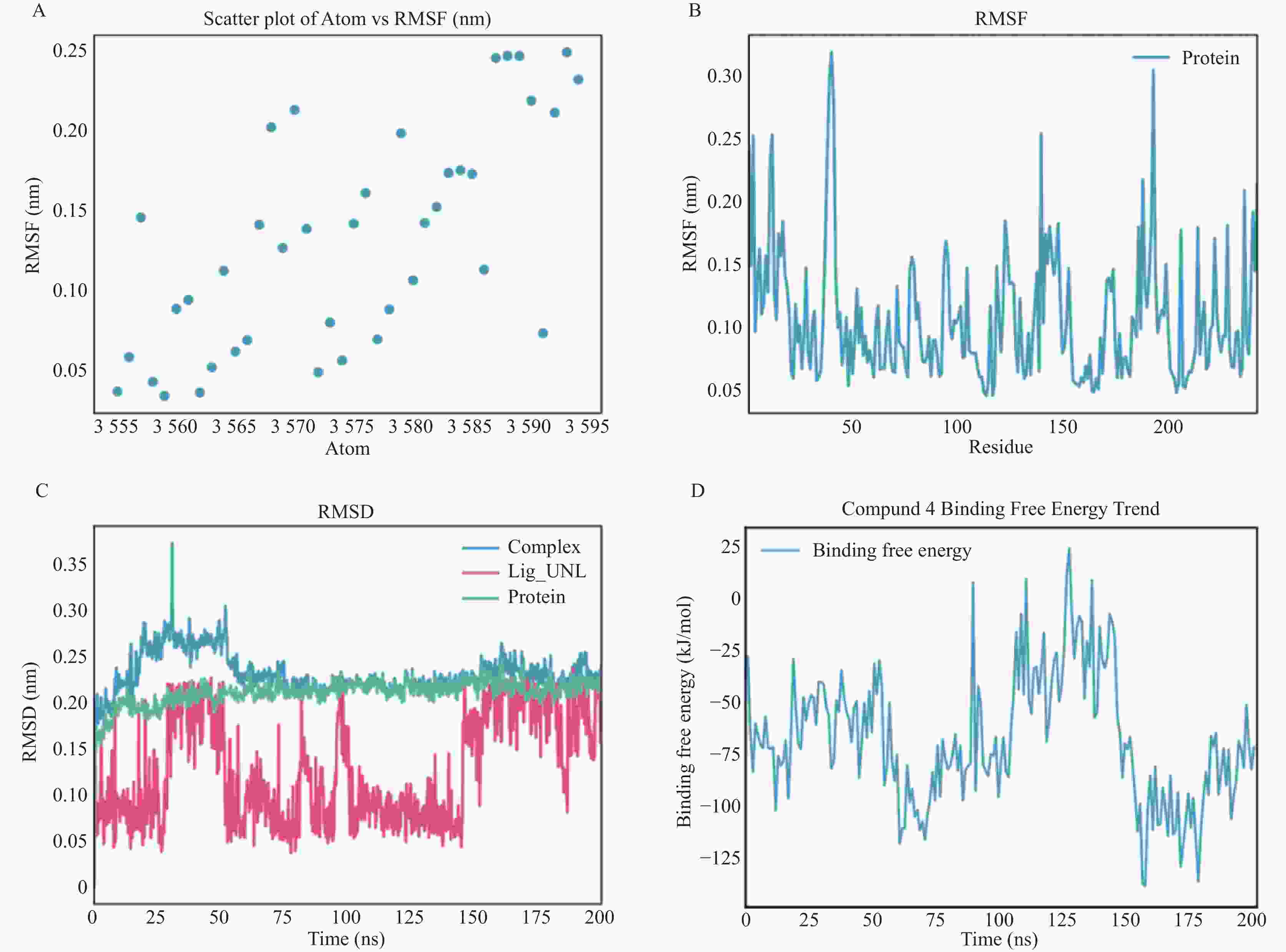 A: 原子编号与均方根波RMSF之间的散点图;B: NDM-1与化合物4结合后蛋白质残基的RMSF曲线;C: 蛋白质、配体及蛋白–配体复合物在分子动力学模拟过程中的均方根偏差随时间变化曲线;D: 化合物与蛋白结合自由能(kJ/mol)随模拟时间变化趋势图。