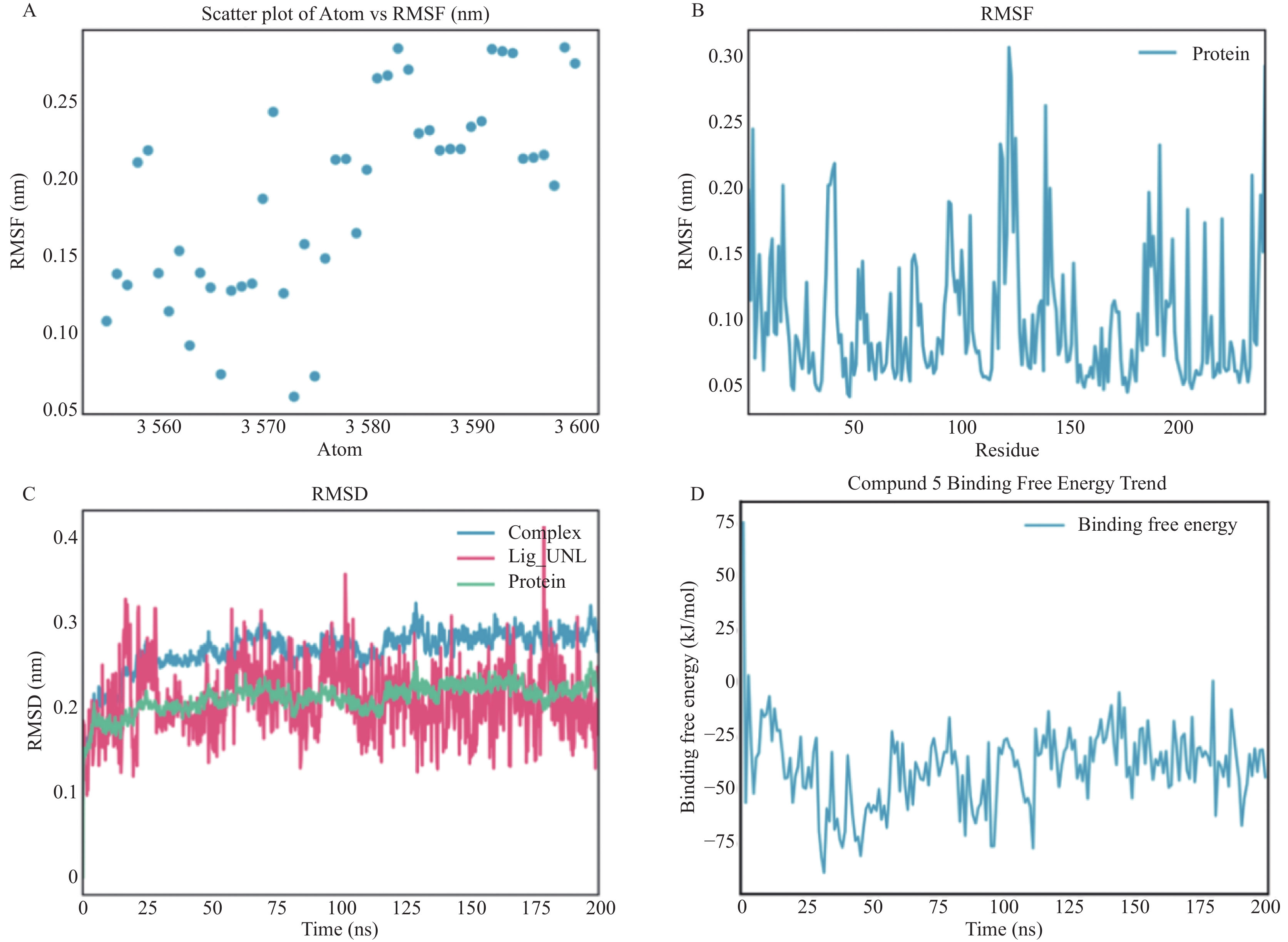 A: 原子编号与均方根波RMSF之间的散点图;B: NDM-1与化合物5结合后蛋白质残基的RMSF曲线;C: 蛋白质、配体及蛋白–配体复合物在分子动力学模拟过程中的均方根偏差随时间变化曲线;D: 化合物与蛋白结合自由能(kJ/mol)随模拟时间变化趋势图。