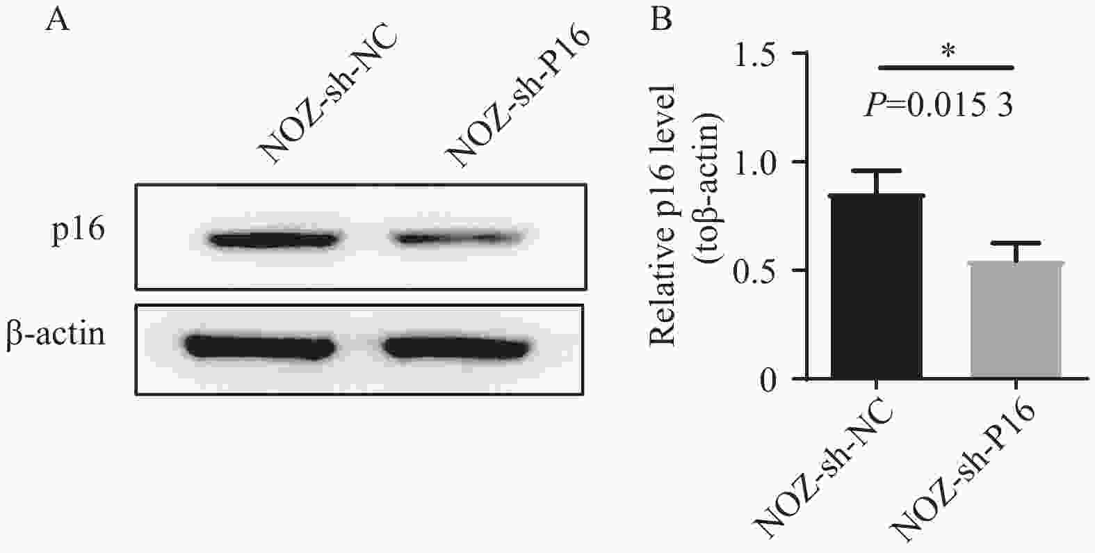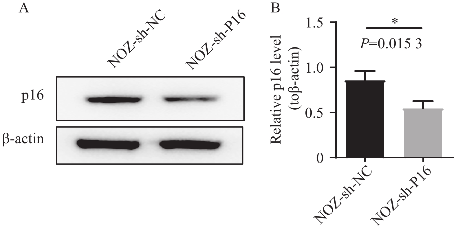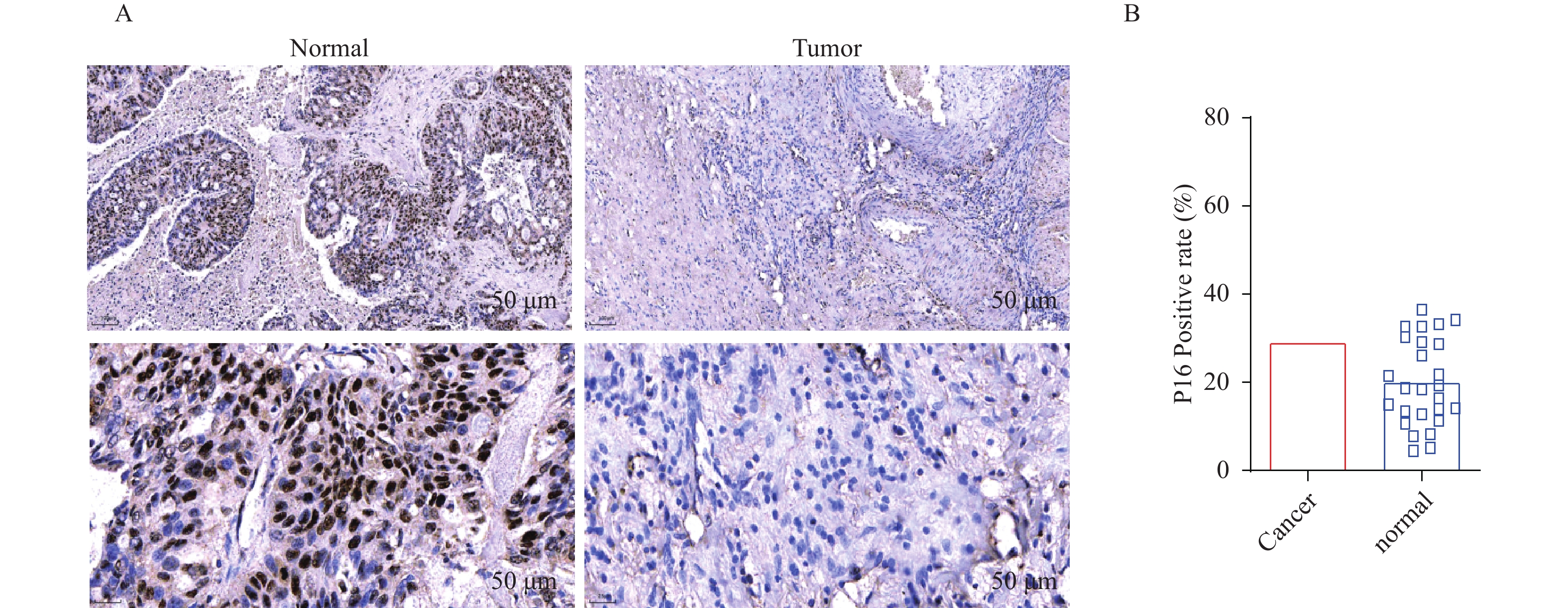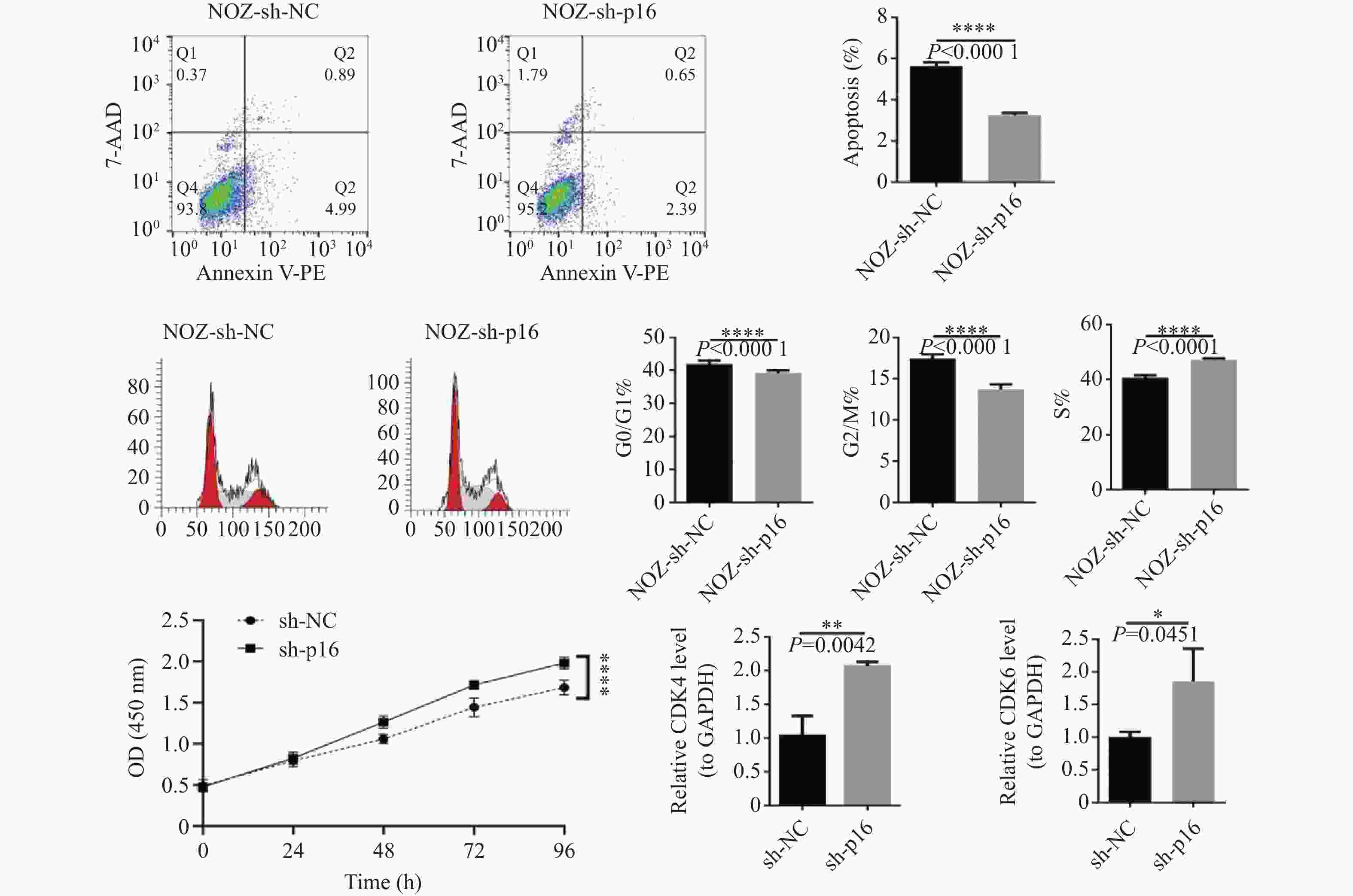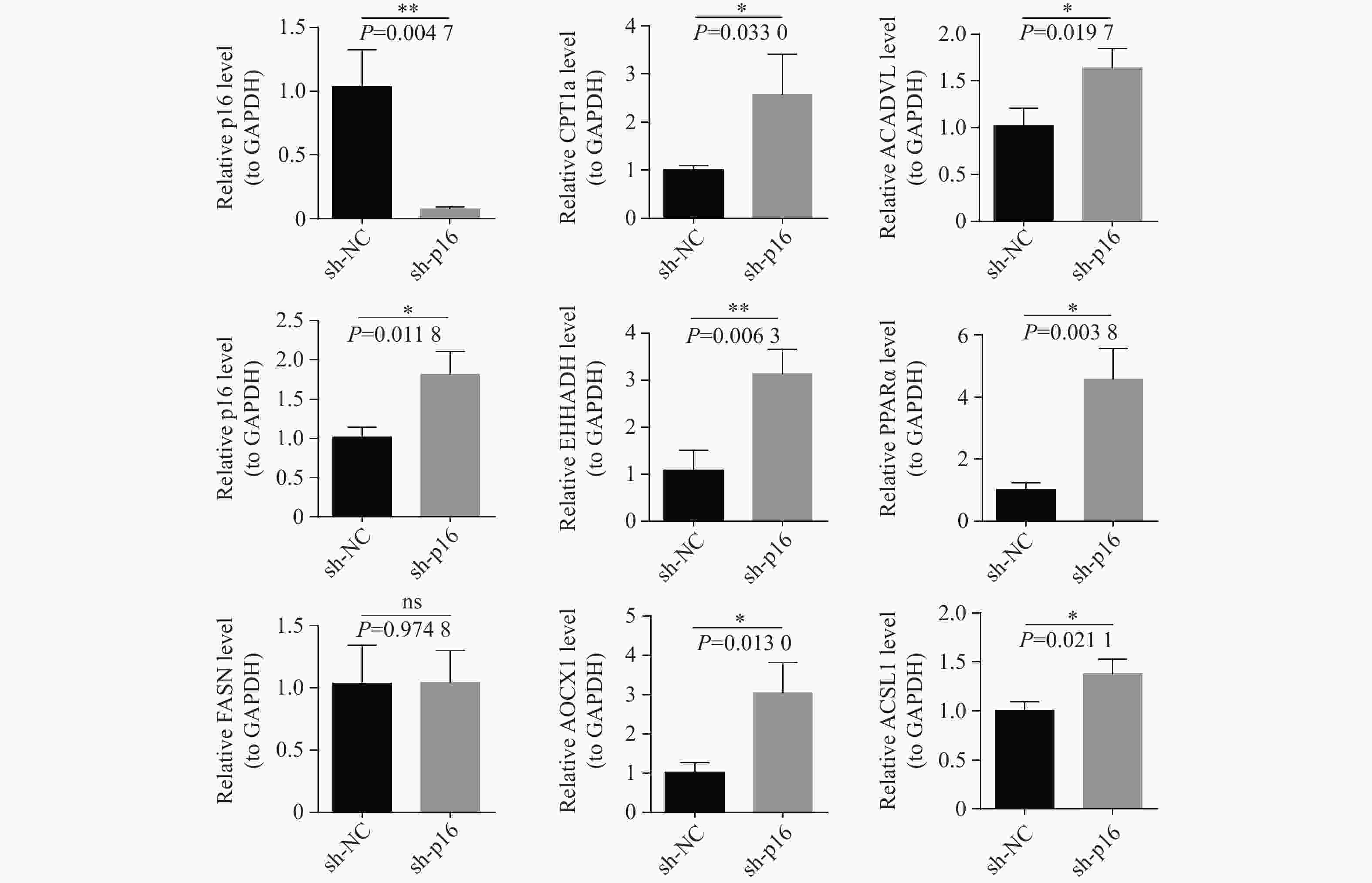 目的 通过临床水平和细胞水平验证p16的表达模式,并进一步探索p16对人胆囊癌(gallbladder cancer,GBC)细胞周期及脂肪酸代谢的影响。 方法 收集胆囊结石伴胆囊炎标本30例,GBC标本30例。采用荧光定量PCR检测各GBC样本及胆囊炎样本的p16mRNA的水平、采用免疫组织化学染色检测各GBC样本及胆囊炎样本的p16蛋白表达水平。利用肿瘤细胞的CCK8检测稳转细胞株的增殖能力、采用流式细胞技术检测肿瘤细胞的凋亡和分裂周期。QPCR检测低表达p16癌细胞中过氧化物酶体相关基因;线粒体氧化相关基因;脂肪酸合成相关基因的表达情况。 结果 p16mRNA及p16蛋白在GBC中的表达显著高于慢性胆囊炎(P < 0.05)。低表达p16之后,肿瘤细胞凋亡率降低,G0/G1期降低,S期升高,细胞分裂加快,差异极其显著(P < 0.0001 )。低表达p16之后,GBC中的大部分相关基因显著上调,差异具有统计学意义(P < 0.05)。结论 p16在GBC中显著高表达。p16能够抑制GBC细胞周期的进展。p16可能通过调节脂肪酸代谢的途径影响GBC细胞的发生发展。 Abstract:Objective To verify the expression pattern of p16 at the clinical and cellular levels, and further explore the effects of p16 on the cell cycle and fatty acid metabolism of human gallbladder cancer (GBC) cells. Methods Thirty specimens of gallstones with cholecystitis and thirty GBC specimens were collected. Quantitative fluorescence PCR (QPCR) was used to detect p16 mRNA levels in GBC samples and cholecystitis samples. Immunohistochemical staining was performed to detect p16 protein expression levels in GBC samples and cholecystitis samples. CCK8 assay was used to detect the proliferative capacity of stably transfected cell lines. Flow cytometry was employed to detect apoptosis and cell cycle progression in tumor cells. QPCR was used to detect the expression of peroxisome-related genes, mitochondrial oxidation-related genes, and fatty acid synthesis-related genes in cancer cells with low p16 expression. Results The expression of p16 mRNA and p16 protein in GBC was significantly higher than that in chronic cholecystitis (P < 0.05). After p16 downregulation, the apoptosis rate of tumor cells decreased, the proportion of cells in G0/G1 phase decreased, the S phase proportion increased, and cell division accelerated, with extremely significant differences (P < 0.0001 ). After p16 downregulation, most related genes in GBC were significantly upregulated, with statistically significant differences (P < 0.05).Conclusions p16 is significantly highly expressed in GBC. p16 can inhibit the progression of GBC cell cycle. p16 may affect the occurrence and development of GBC cells through regulating the pathway of fatty acid metabolism. -
