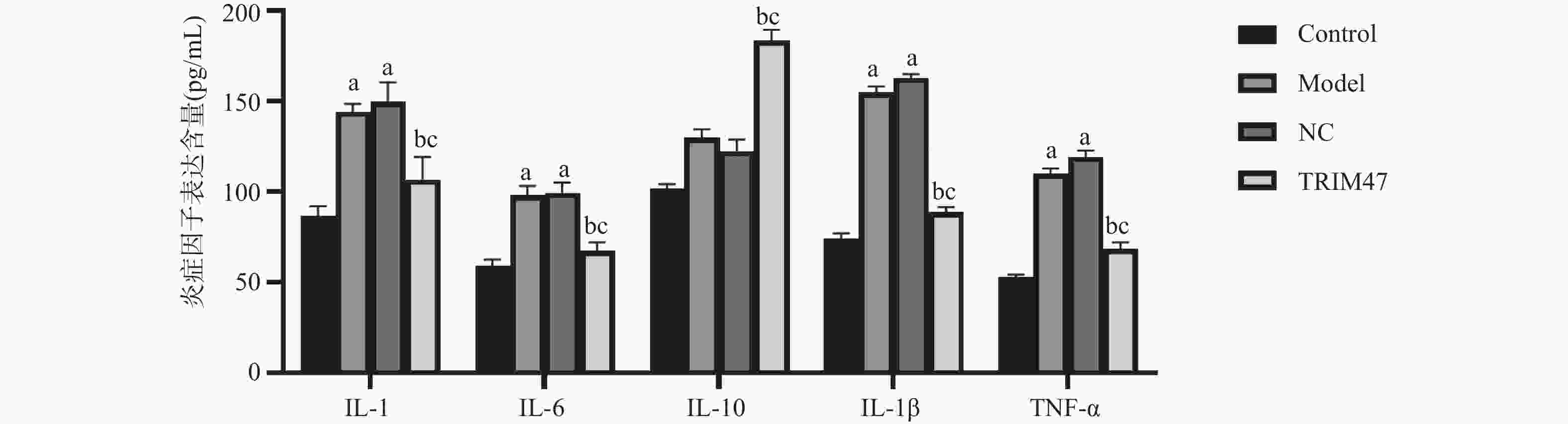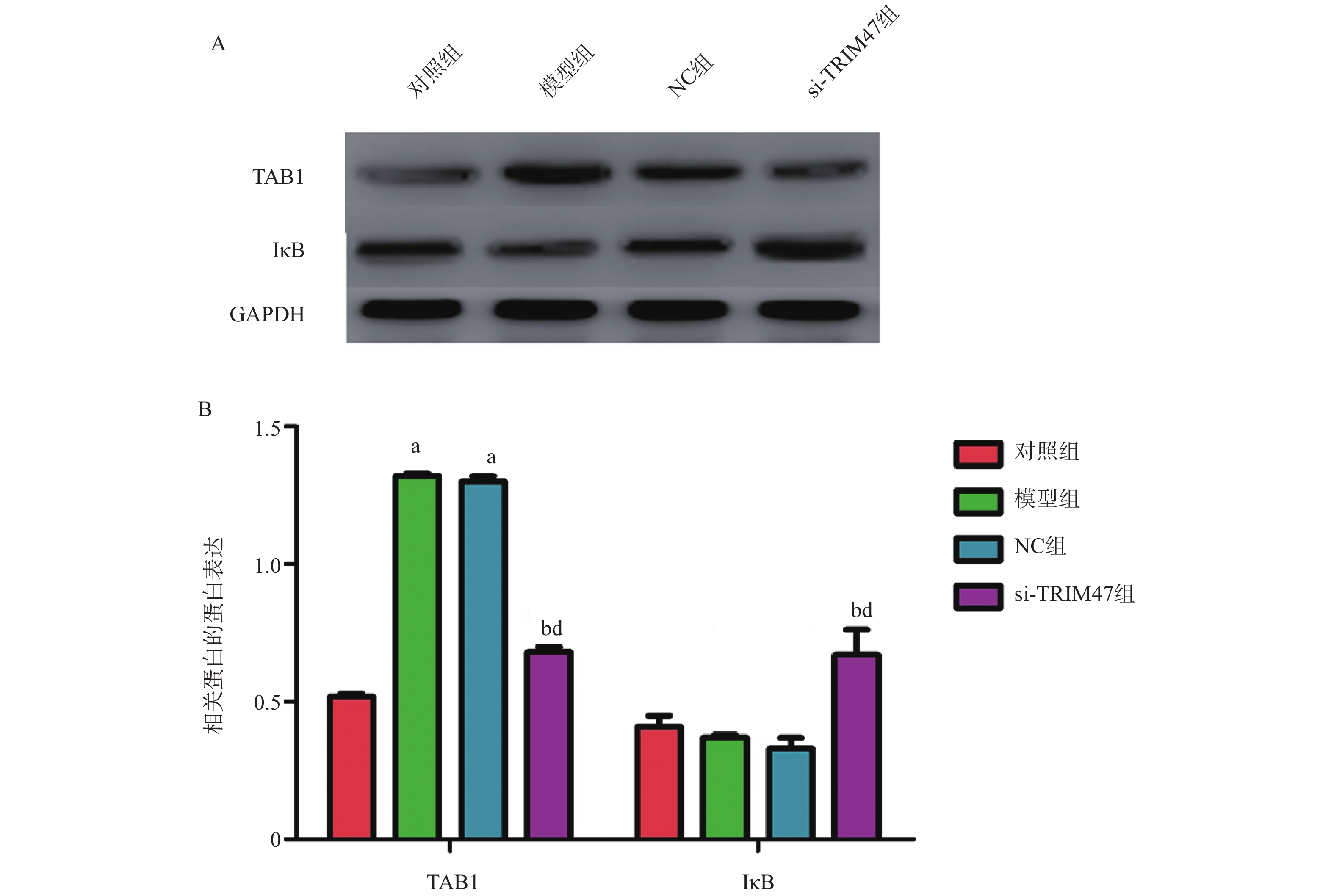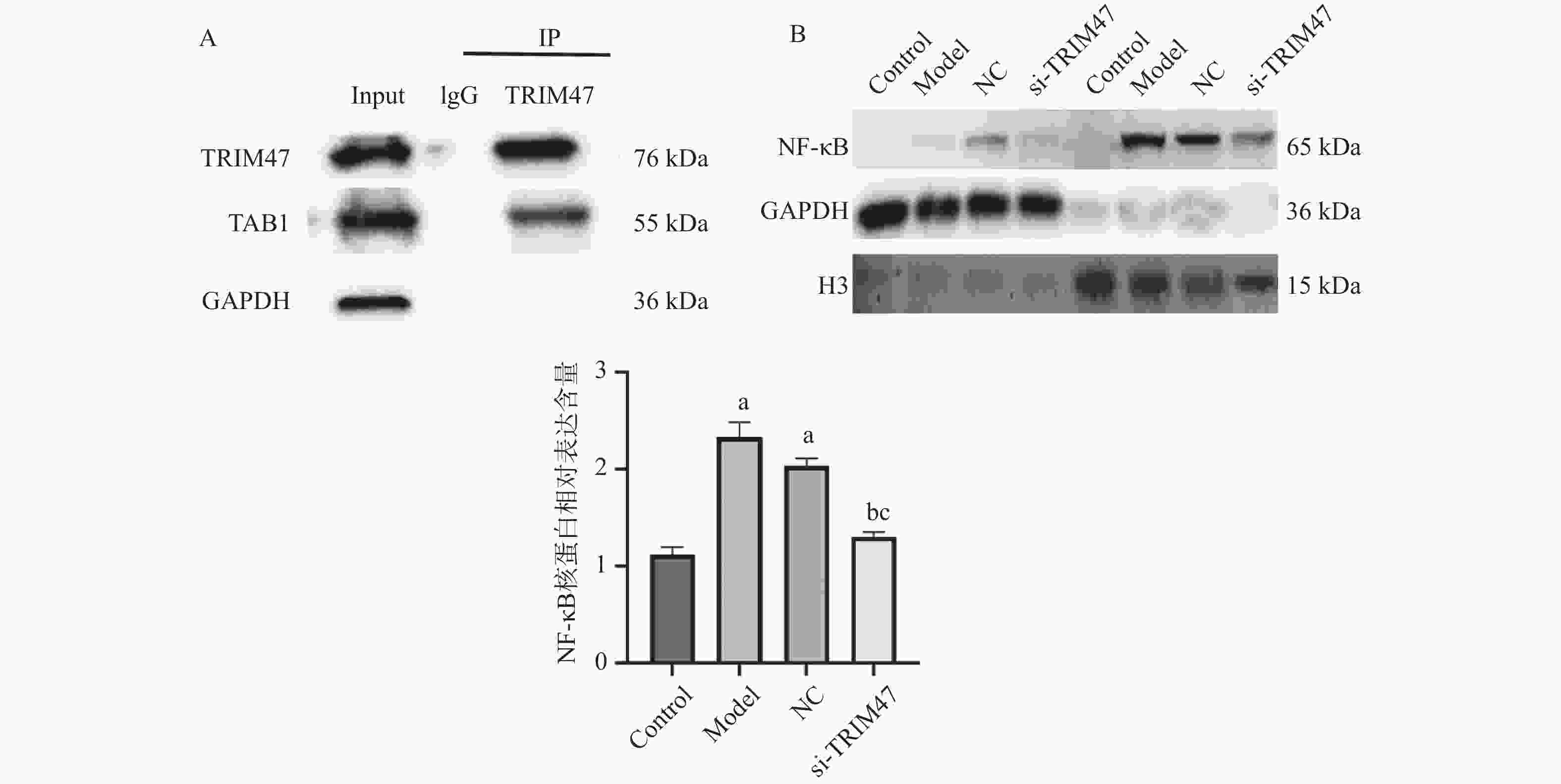 A:TAB1和TRIM47 CO-IP图;B:NF-κB入核蛋白条带图和统计图;aP < 0.01 vs Control组;bP < 0.01 vs Model组;cP < 0.01 vs NC组。