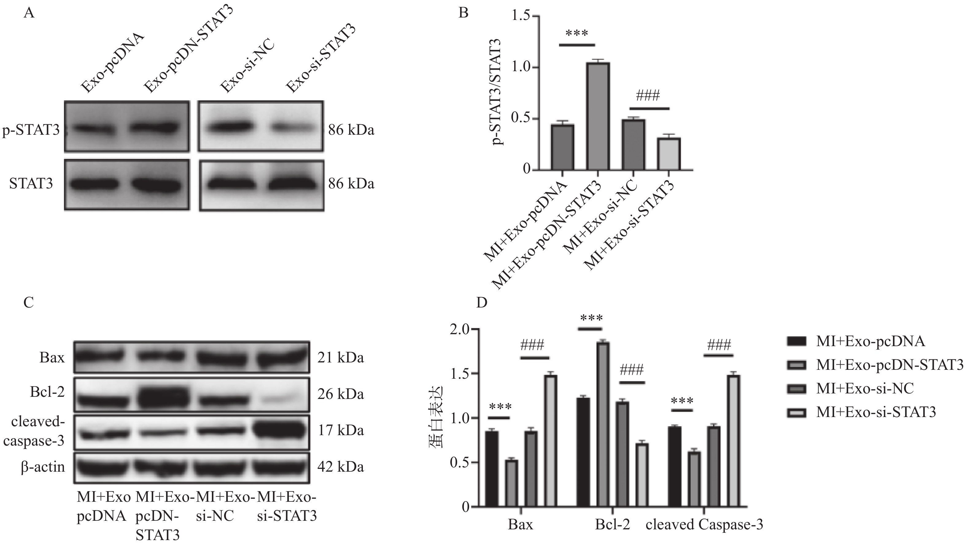 Abstract:Objective To investigate the role of bone marrow-derived mesenchymal stem cell (BMSCs)-derived exosomes (Exo) in transferring signal transduction and transcriptional activator 3 (STAT3) protein in myocardial infarction (MI). Methods A rat MI model was established by ligation of the left anterior descending coronary artery. The animals were randomly divided into Sham, MI, and BMSCs-Exo groups. Additionally, Exo-pcDNA, Exo-pcDNA-STAT3, Exo-si-NC, and Exo-si-STAT3 groups were established to investigate the effects of upregulating or inhibiting STAT3 expression in Exo on cardiac function. At 2 and 4 weeks after surgery, rat electrocardiograms (ECG) and hemodynamic parameters were measured, including left ventricular systolic pressure (LVSP), left ventricular end-diastolic pressure (LVEDP), maximum rate of pressure rise in left ventricle (+dp/dtmax), and maximum rate of pressure decline in left ventricle (−dp/dtmax). Western blot (WB) analysis was used to detect the expression levels of related proteins in myocardial tissue, including phosphorylated signal transducer and activator of transcription 3 (p-STAT3), B-cell lymphoma-2 (Bcl-2), Bcl-2-associated X protein (Bax), and cleaved caspase-3 (Cleaved-caspase-3). Results Compared with the MI group, the BMSCs-Exo group showed significant recovery of ST segment, QRS wave, and QT interval (F = 23.462, P < 0.001), and decreased arrhythmia incidence (χ2 = 7.248, P = 0.009). Simultaneously, LVEDP decreased, and LVSP and ±dp/dtmax improved (F = 19.601, P < 0.001). In the transfection groups, compared with the Exo-pcDNA group, the Exo-pcDNA-STAT3 group showed elevated S wave amplitude (P < 0.05) and reduced arrhythmia incidence to 37.5%. Compared with the Exo-si-NC group, the Exo-si-STAT3 group showed prolonged QT interval, widened T wave, and decreased S wave amplitude (F = 30.592, P < 0.001), with arrhythmia rate increased to 87.5%. Cardiac function assessment showed that the Exo-pcDNA-STAT3 group had decreased LVEDP (F = 14.937, P < 0.001), while the Exo-si-STAT3 group showed elevated ASBP, LVSP, and +dp/dtmax (F = 16.213, P < 0.001), suggesting increased cardiac workload. WB results showed that the Exo-pcDNA-STAT3 group had upregulated p-STAT3 and Bcl-2 expression, while Bax and Cleaved-caspase-3 were downregulated (F = 331.518, 901.008, 545.635, and 516.670, P < 0.001); conversely, the Exo-si-STAT3 group showed opposite trends. Conclusion BMSCs-Exo can improve cardiac function in MI rats, reduce myocardial cell apoptosis, and decrease arrhythmia incidence through STAT3 transfer. Upregulation of STAT3 significantly enhances the cardioprotective effects of Exo, whereas downregulation attenuates these effects. This suggests that the BMSCs-Exo-STAT3 axis may be a novel extracellular vesicle therapy target for treating myocardial infarction. -