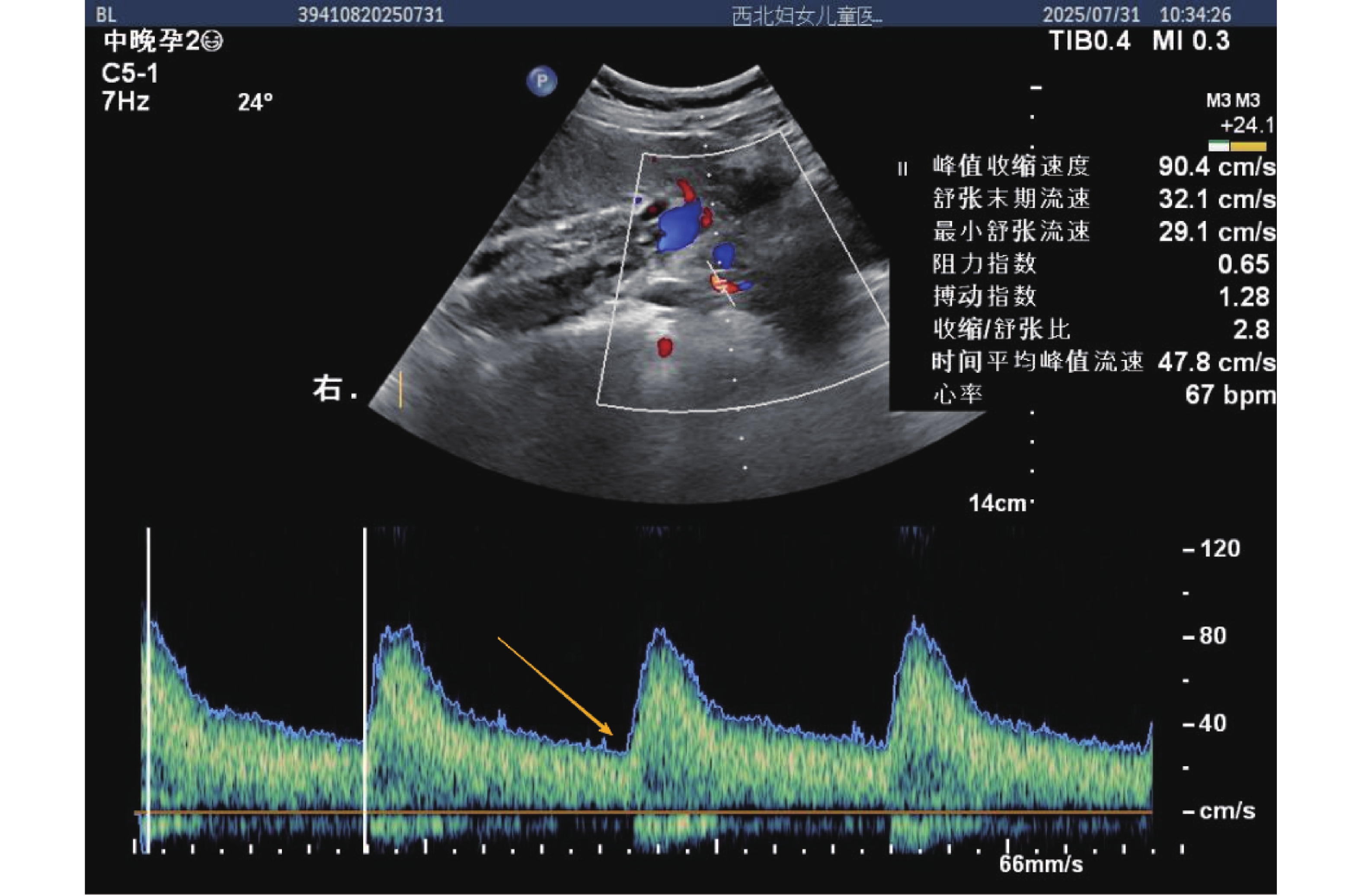 注:图中红色圆点标注 PI(1.28)、RI(0.65)、S/D(2.8)测量点,黄色箭头指示舒张期流速平稳段(无切迹),峰值收缩速度 90.4 cm/s,舒张末期流速 32.1 cm/s,血流阻力较低,符合正常孕中期子宫动脉血流特征,时间平均峰值流速 47.8 cm/s,提示胎盘灌注充足。