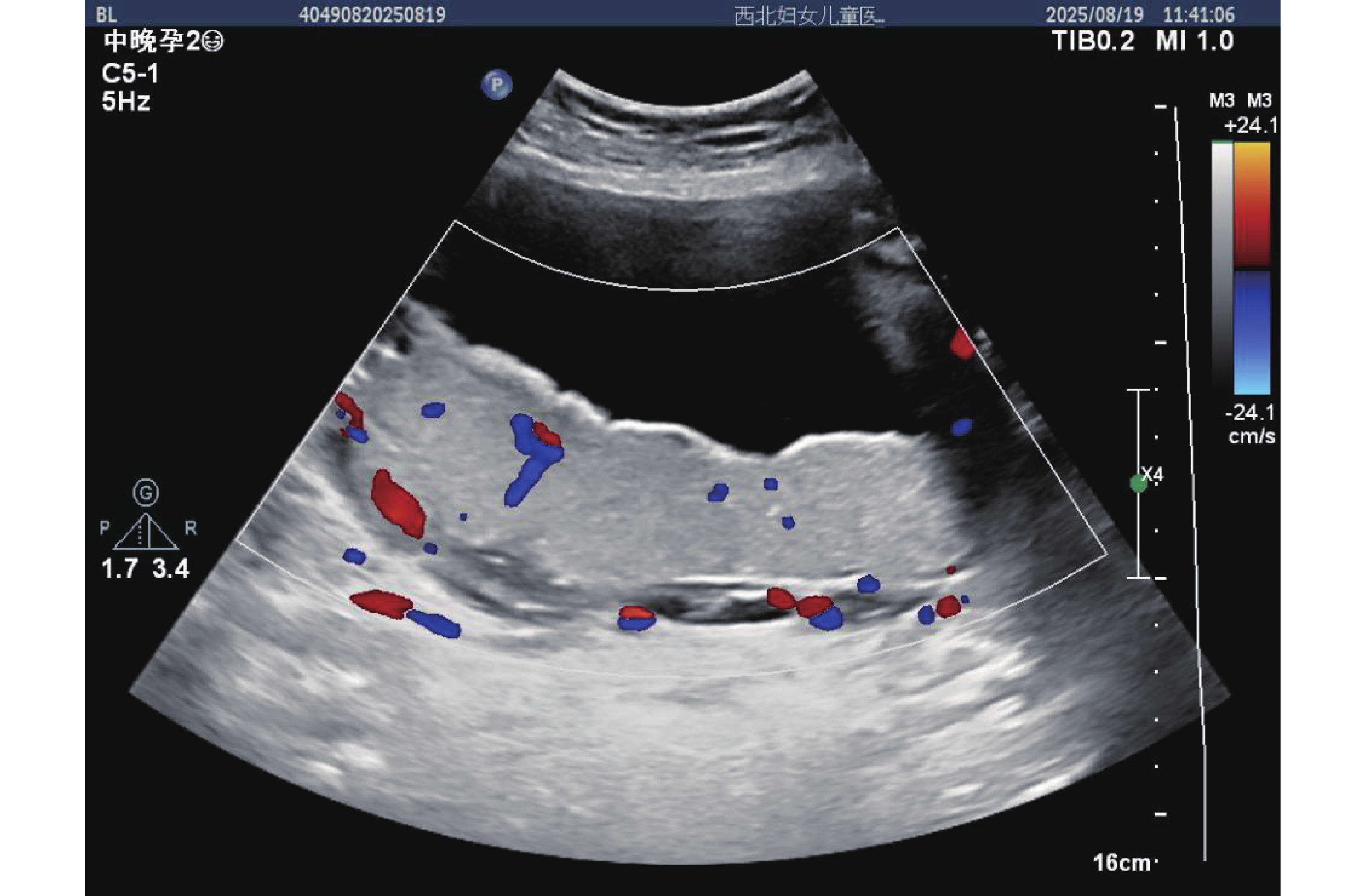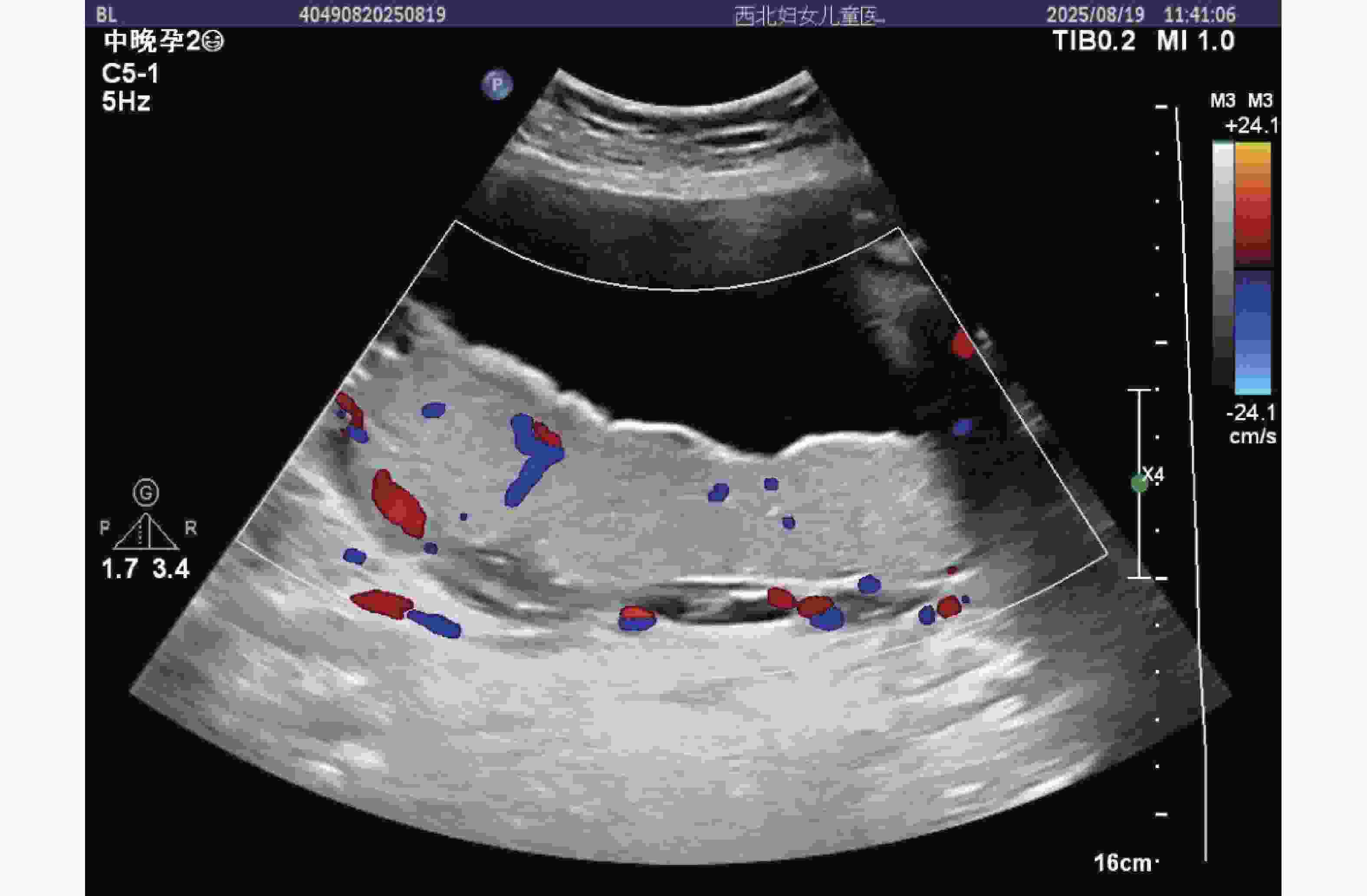 注:图中红色圆点标注为 PI(搏动指数,1.55)、RI(阻力指数,0.71)、S/D(收缩 / 舒张比,3.4)测量点,蓝色箭头指示有舒张期切迹,峰值收缩速度113 cm/s,舒张末期流速 33.2 cm/s,反映子宫动脉血流阻力较高,符合子痫前期血流动力学特征。