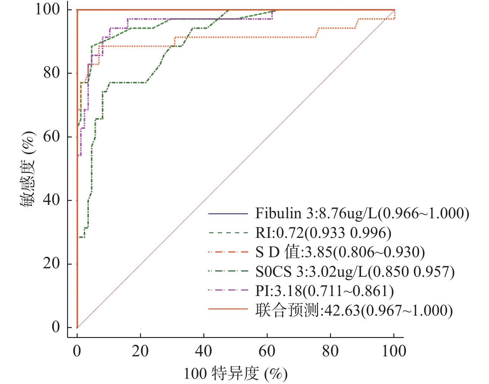 影响因素 β SE Waldχ2 值 P OR 95%CI 下限 上限 Fibulin-3升高 4.767 1.738 7.522 0.006* 117.524 3.897 354.402 RI升高 1.735 0.484 12.826 <0.001** 5.667 2.193 14.642 S/D 值升高 2.286 0.423 29.195 <0.001 9.840 4.293 22.553 SOCS-3降低 −10.402 1.882 30.560 <0.001** 0.585 0.303 0.928 PI升高 1.044 0.220 22.464 <0.001** 2.842 1.845 4.377 常数项 −37.863 6.128 38.756 <0.001** − − − **P < 0.001;*P < 0.05 -